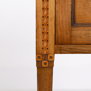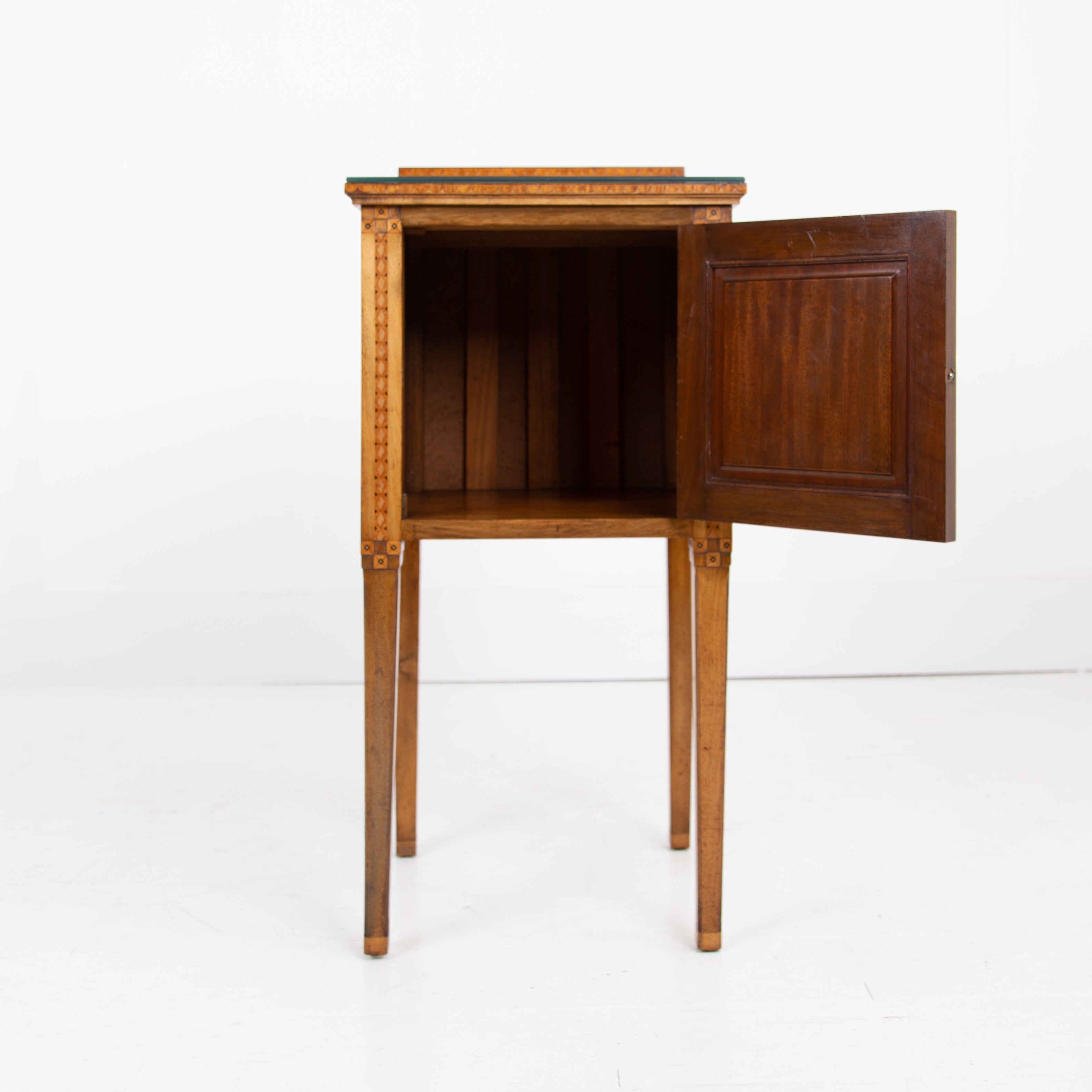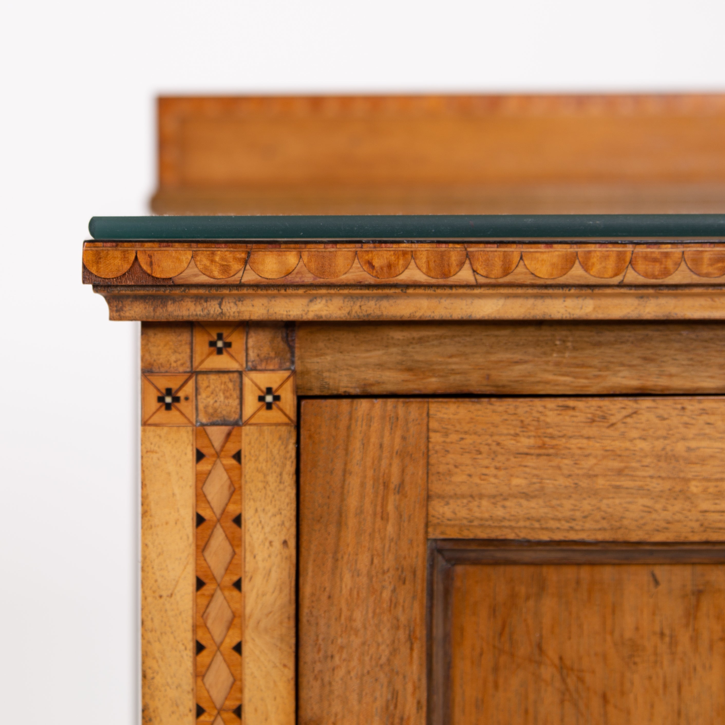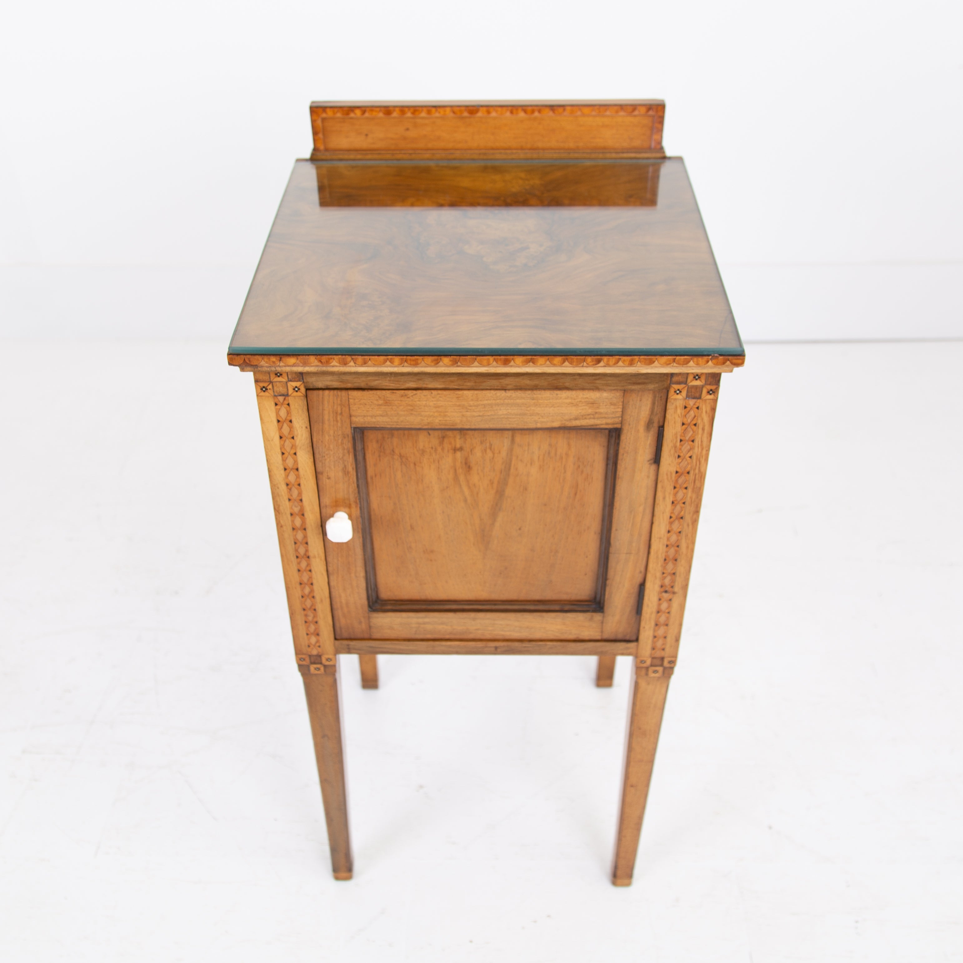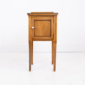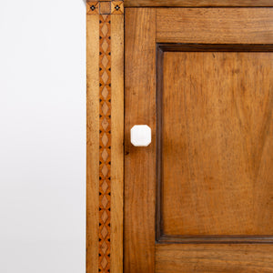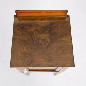 A super little side cupboard and matching cane seat chair ‘Gaylayde’ by B Cohen & Sons of London. Dating to C.1930 and of super quality, it features intricate geometric inlaid bandings in mahogany, satinwood, ebony and walnut to both pieces, lovely design and possesses great features.