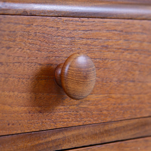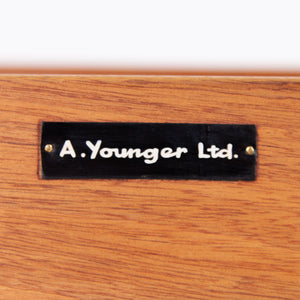 Super quality and look on this John Herbert designed piece from renowned British maker Younger. This one is from the Volnay range and sits in solid Afromosia with the maker's badge to the back of the top drawer. The design and craft was characterized by its clean lines, minimalist aesthetic, and the use of solid wood and was considered a premium product, often more expensive than other contemporary ranges. The piece being of smaller scale than some with the ability to fit into a smaller space if required. A mid century piece of super quality from Younger.