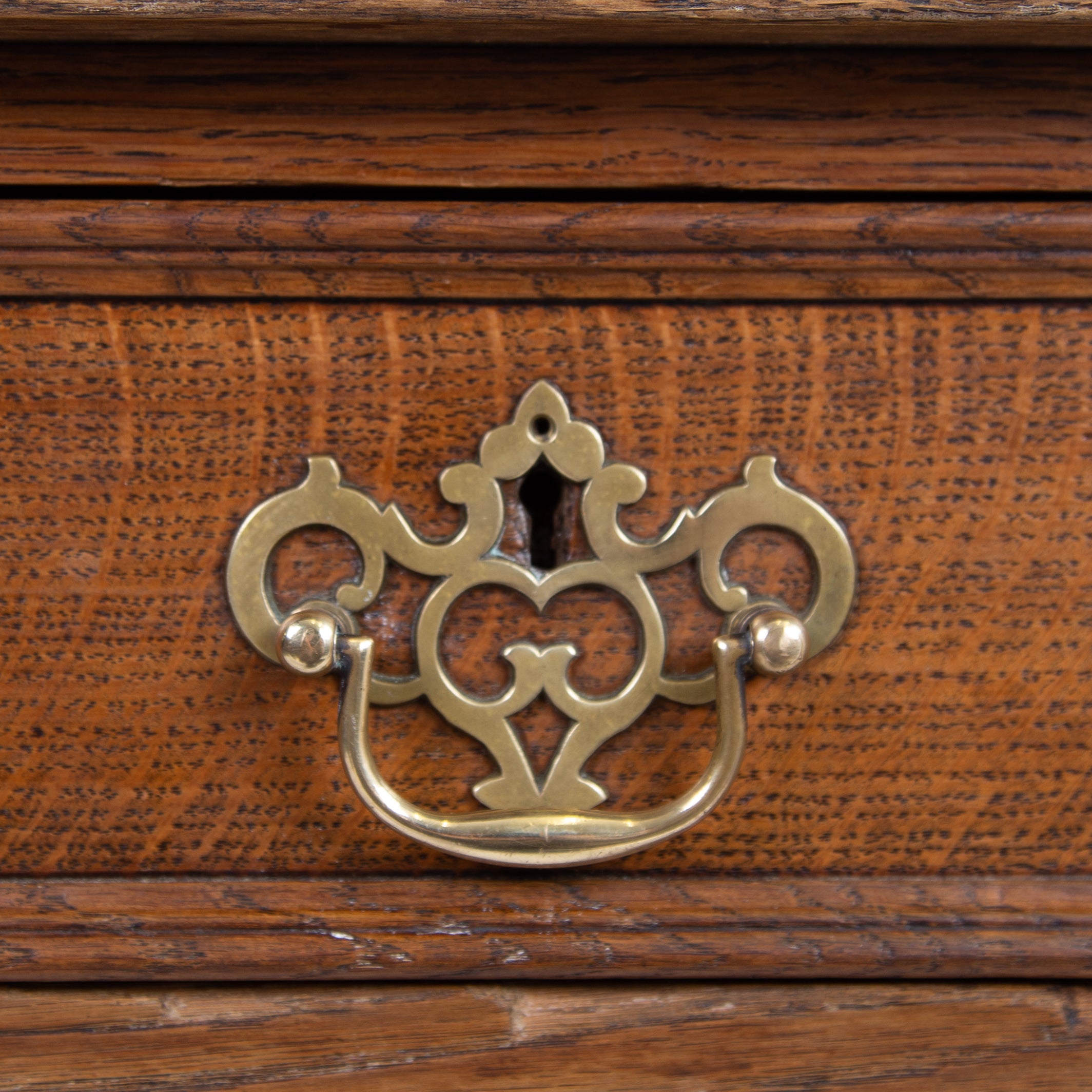 We have a long middle drawer with a flight of 2 drawers all with original brass handles either side which sit on its ornamental legs and base. As mentioned we have a most unusual top which is original to the piece. The desk sits in a lovely order with gentle wear in the right places, nothing nasty or off-putting.