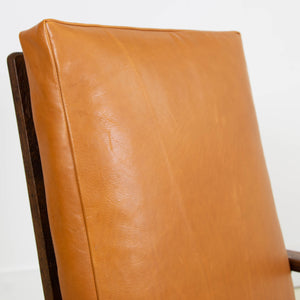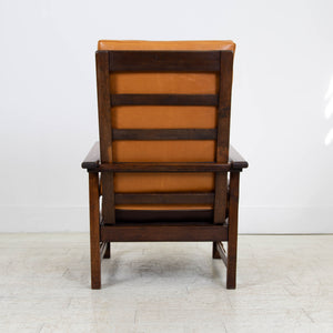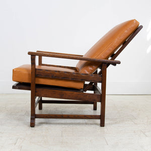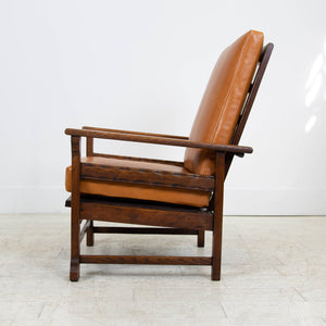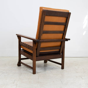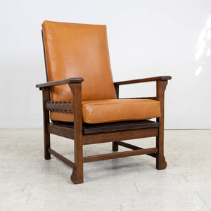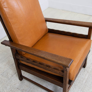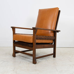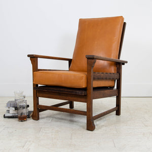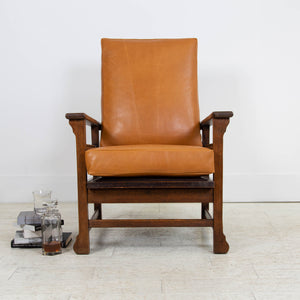 A wonderful looking oak modernist armchair, British 1930s with the seating refinished by our upholsterer in a supple leather hide in a natural tan which will age superbly with use.
