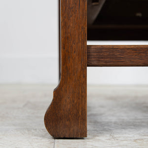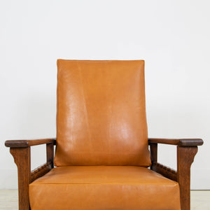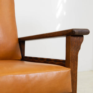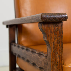 The form is good on this one with its angled legs, the slight narrowing of the oak arms front to back and fabulous patterned side rails, all very nice and pleasing on the eye. It sits ready to place with, as mentioned, new leather and a little museum wax to the frame.