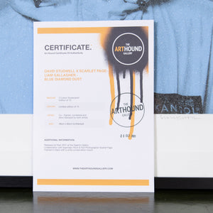 Screen print with diamond dust. This print was a collaboration with legendary Rock & Roll Photographer Scarlet Page who has co-signed the prints alongside David Studwell. Scarlet is the daughter of Jimmy Page of Led Zeppelin fame. Exhibitions of her work have been shown at The Royal Albert Hall, Proud Gallery Camden and, in 2019, Scarlet exhibited and worked with local celebrated musicians in Buenos Aires as part of her Resonators + project. Since the pandemic there has been a huge interest in Scarlet’s archive work - her limited edition prints alongside her weekly ‘words behind the shot’ videos have been gaining a cult following…. This 2 colour screen print of Liam Gallagher is embellished with hand applied diamond dust numbered with its edition 11 of 15, signed and professionally framed and mounted. It will be delivered with it’s original certificate.