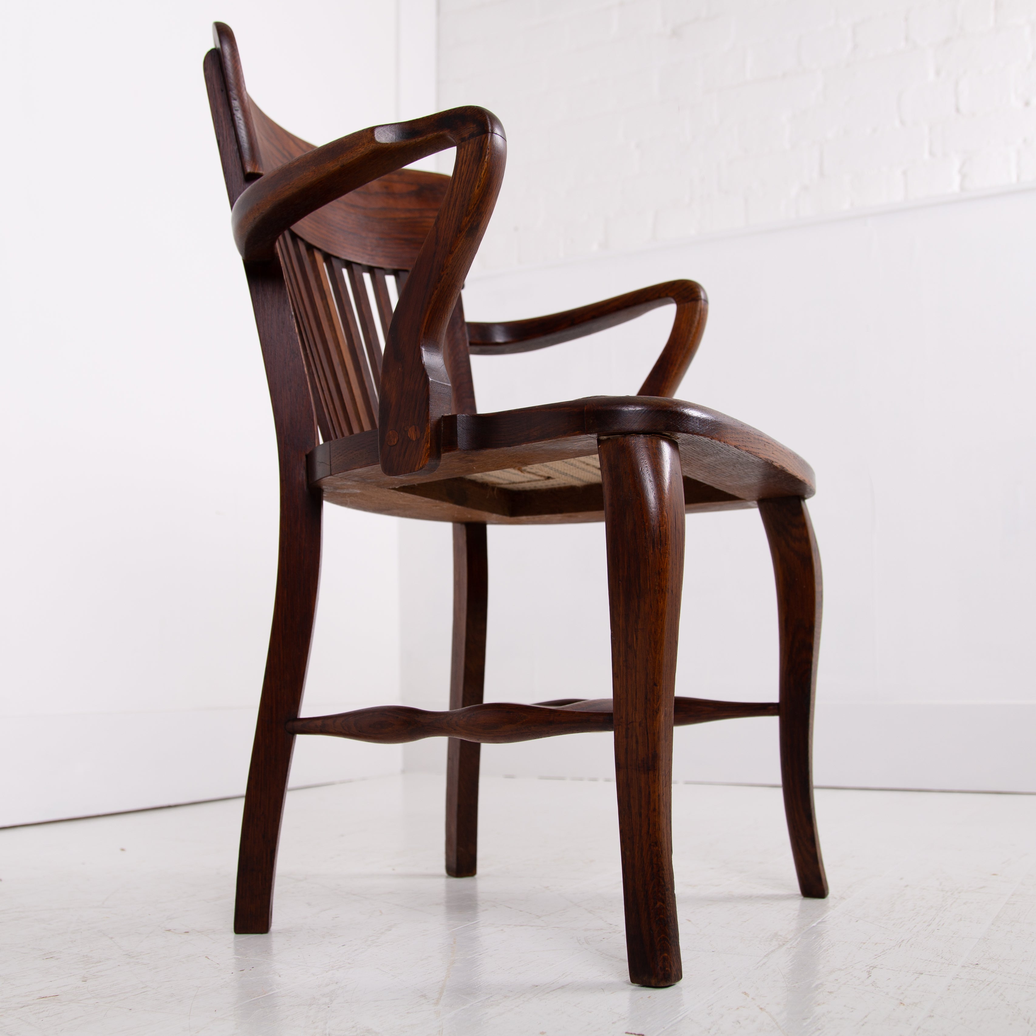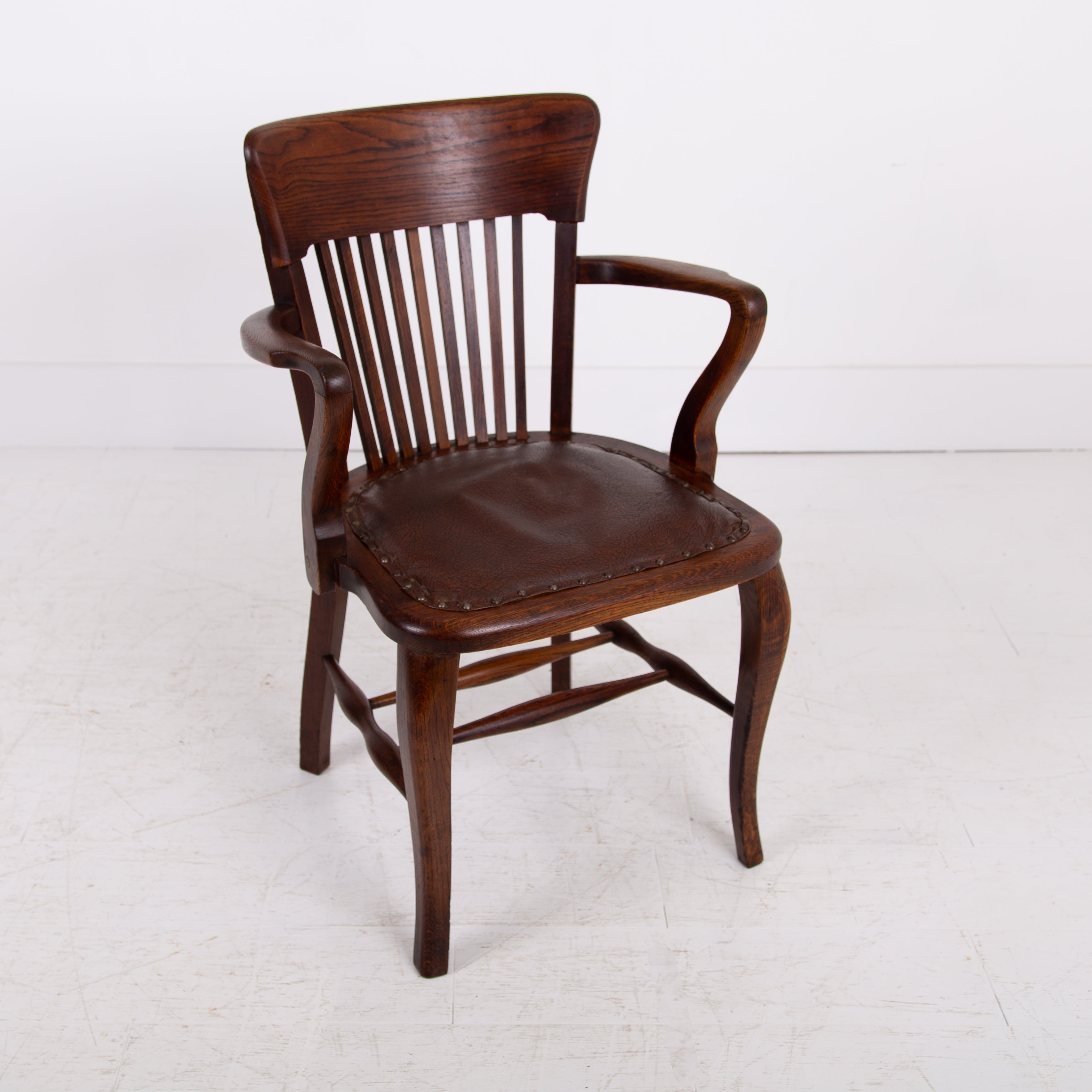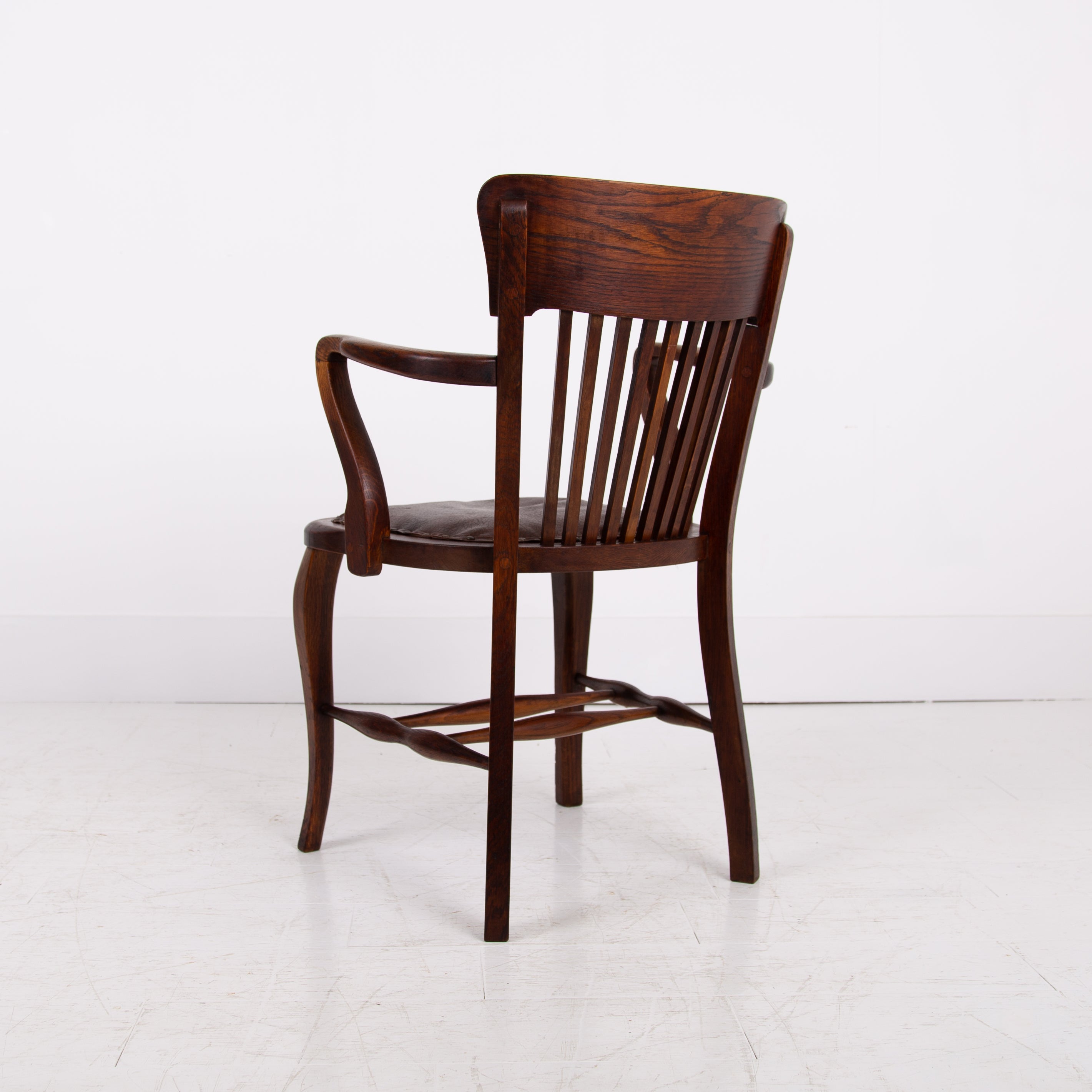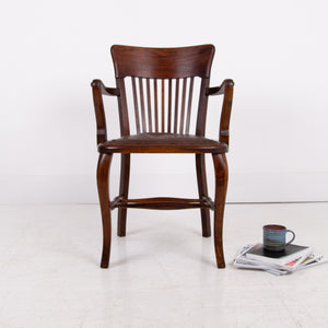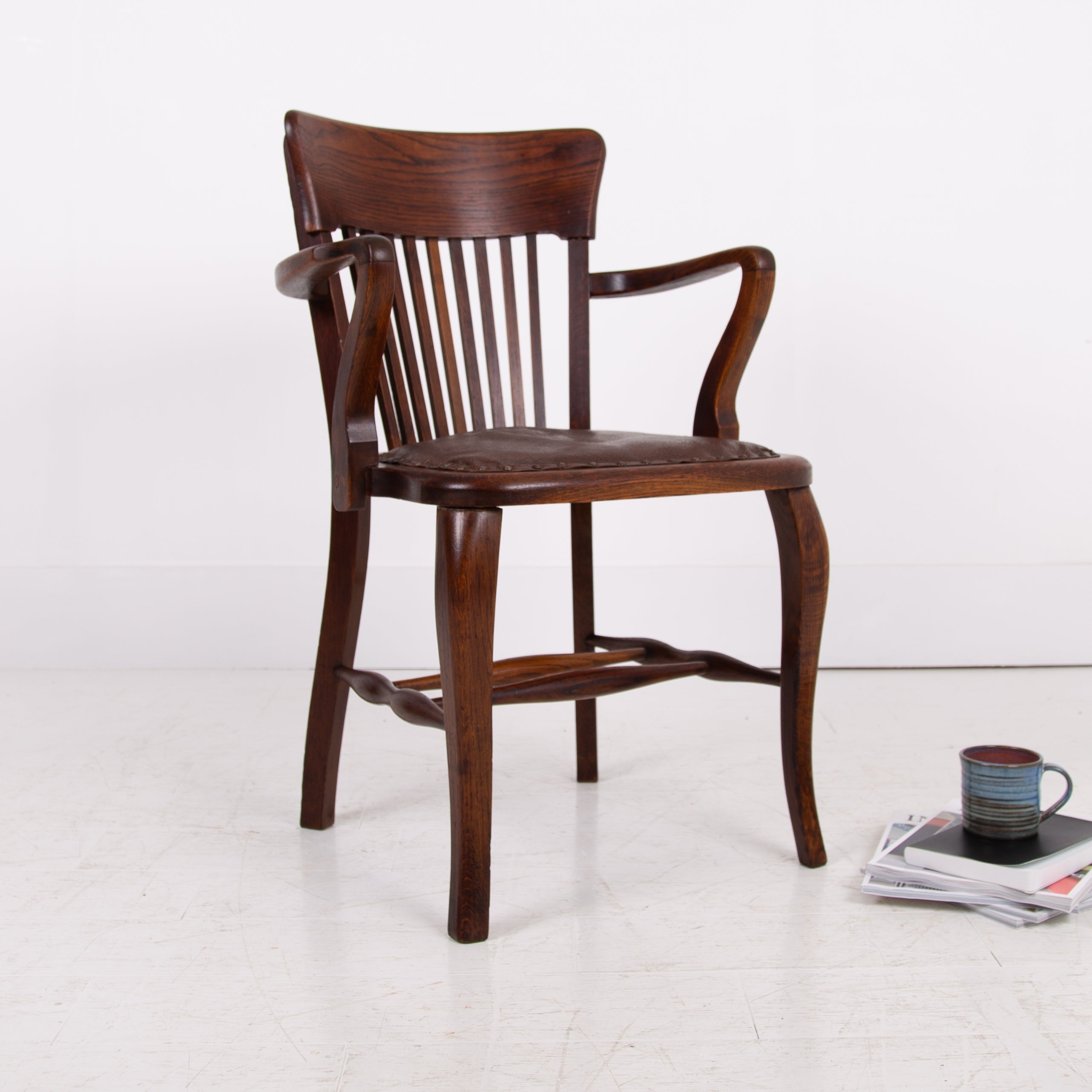 We have a good looking English oak desk chair C1910, very likely by Cookes of Finsbury - “Cooke’s of Finsbury was a London-based manufacturer established in 1885, renowned for high-quality Edwardian and Art Deco office furniture, particularly in English oak and walnut.”
