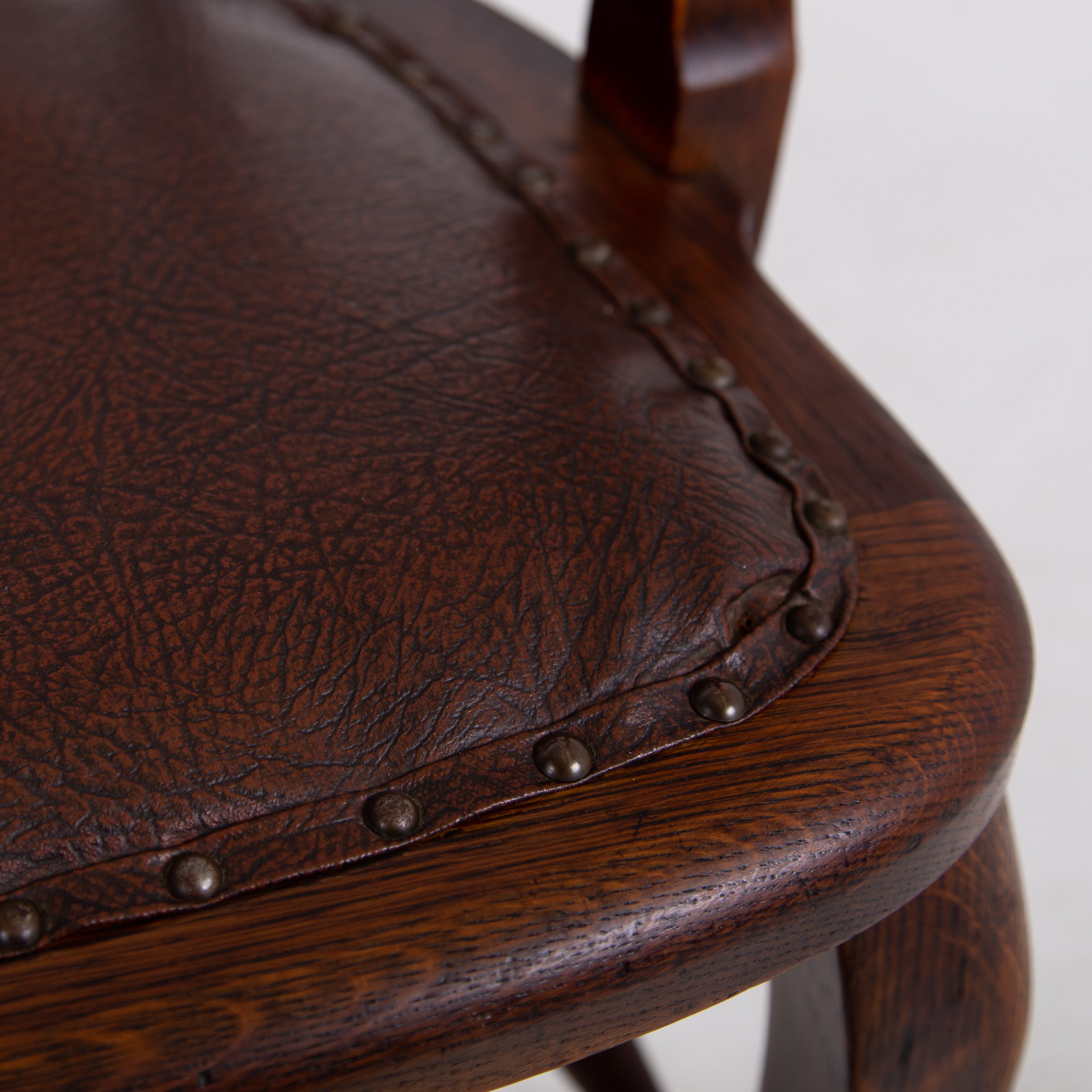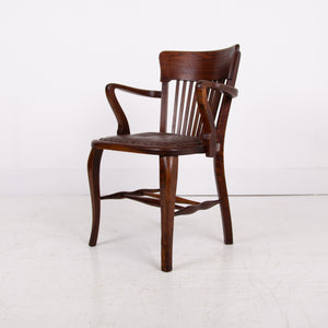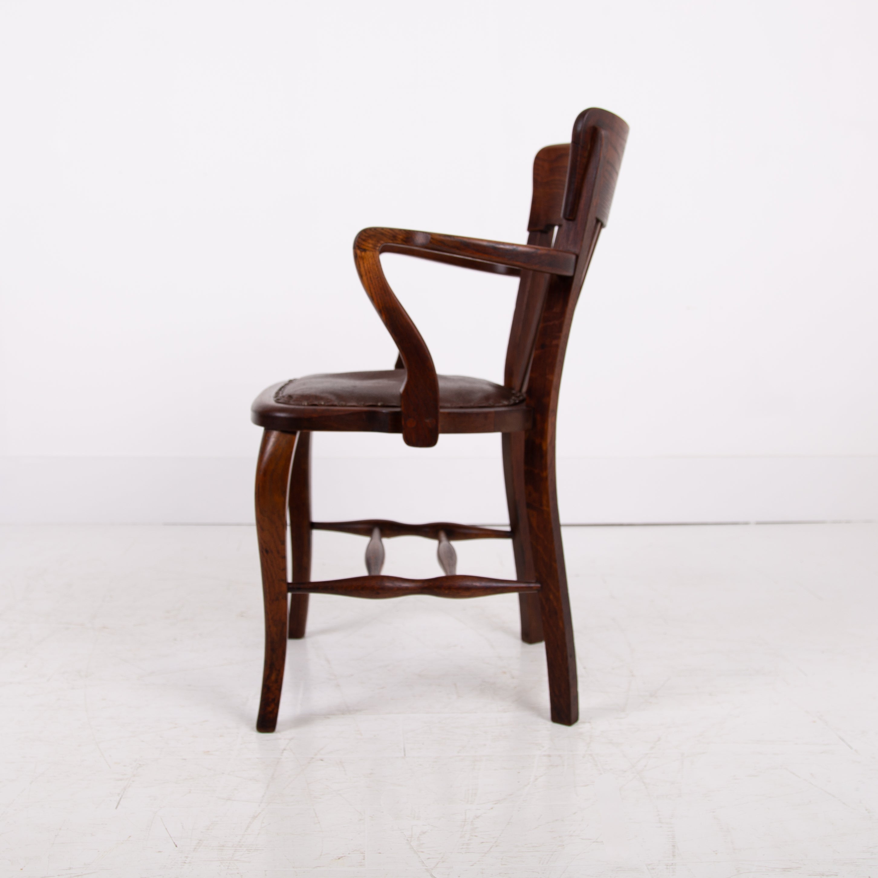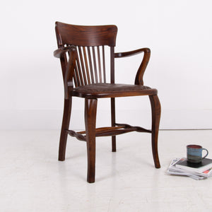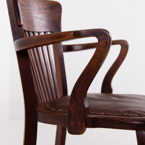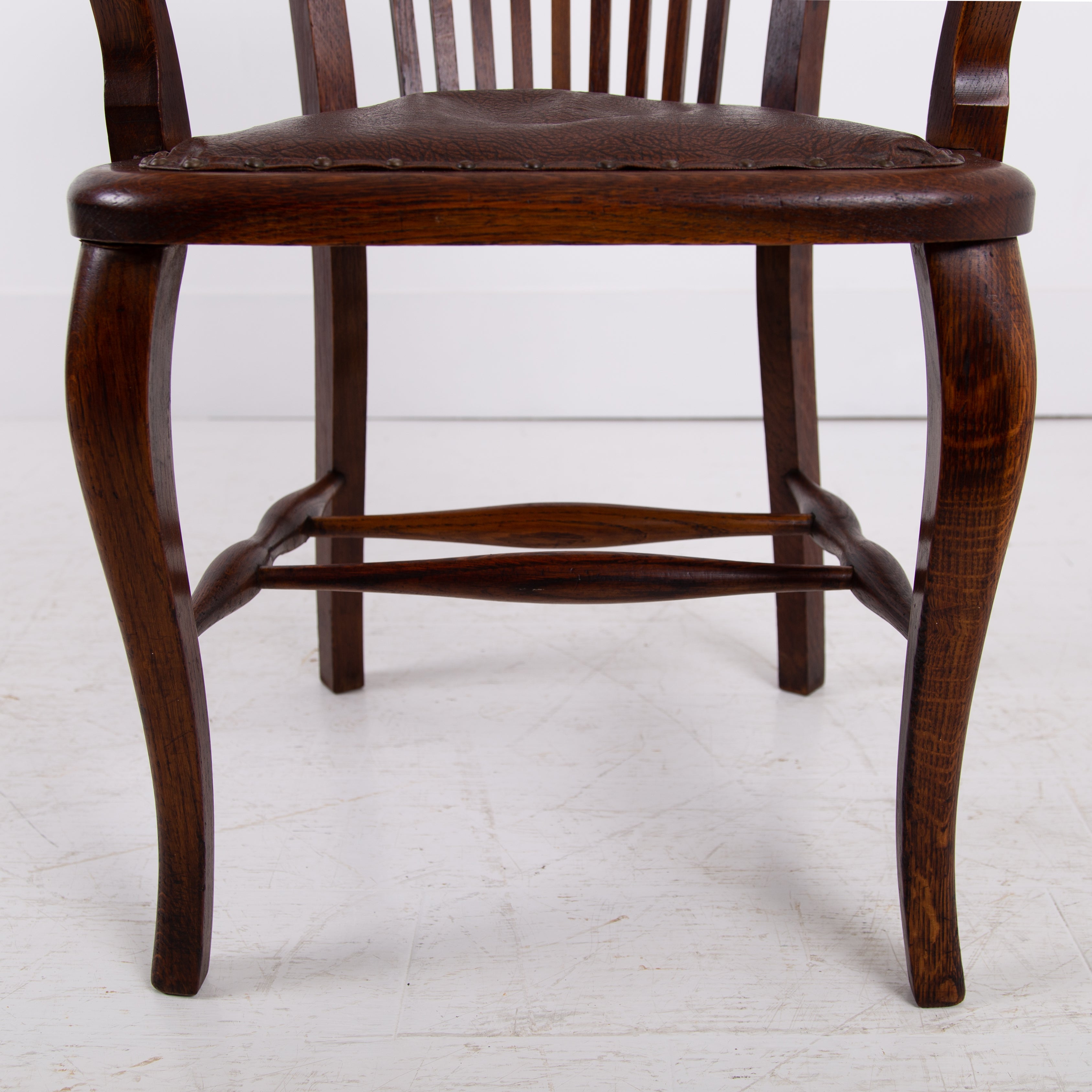 Sitting in a highly desirable original condition we have a good looking oak frame with pleasing on the eye shaped arms, double stretcher, deep back rail and slatted back. Our workshop has carefully lifted the original grain Rexine seat, replaced the tired webbing with new webbing and carefully refitted the Rexine with the original brass aged studs. If you wish for a new leather seat our upholsterer would be happy to oblige at a cost of £80 plus VAT plus leather - we do have some colours in stock.