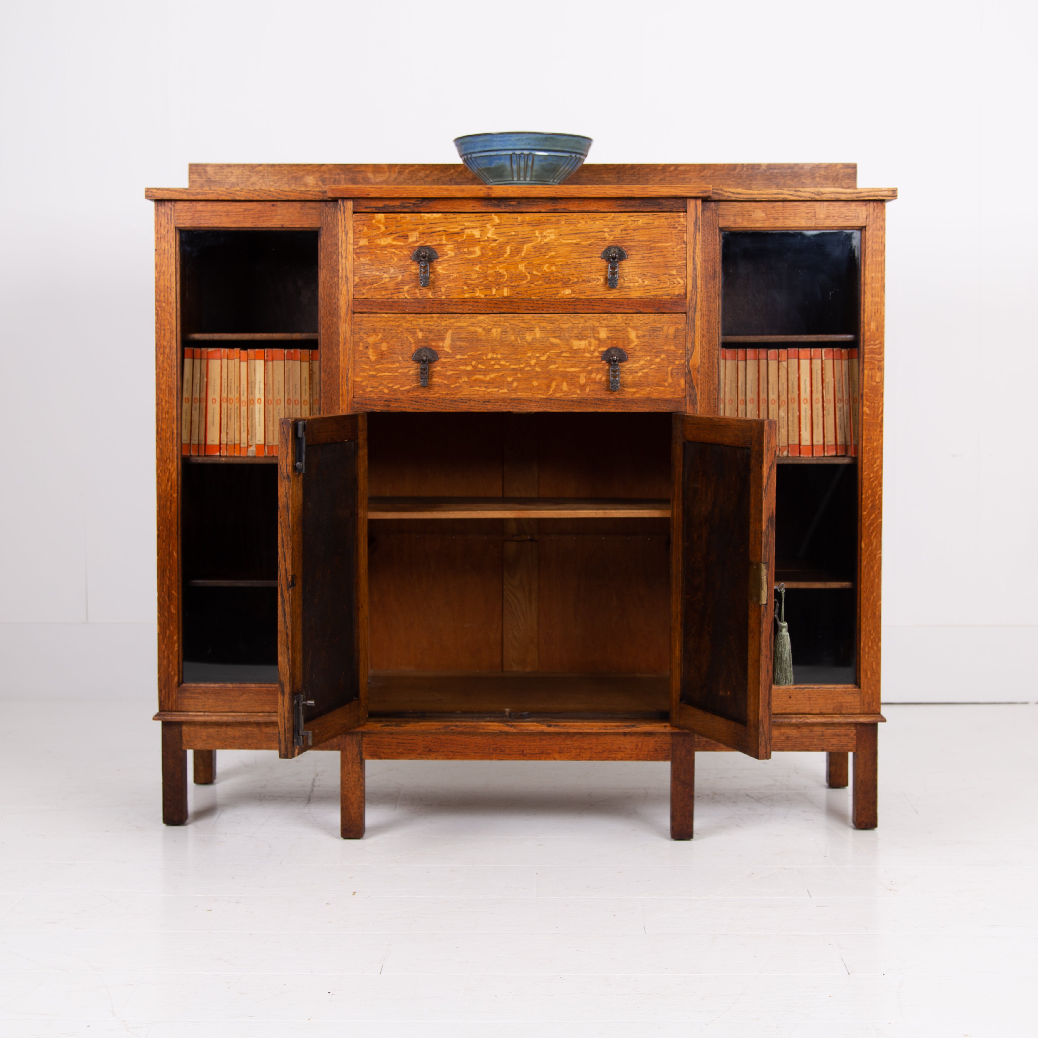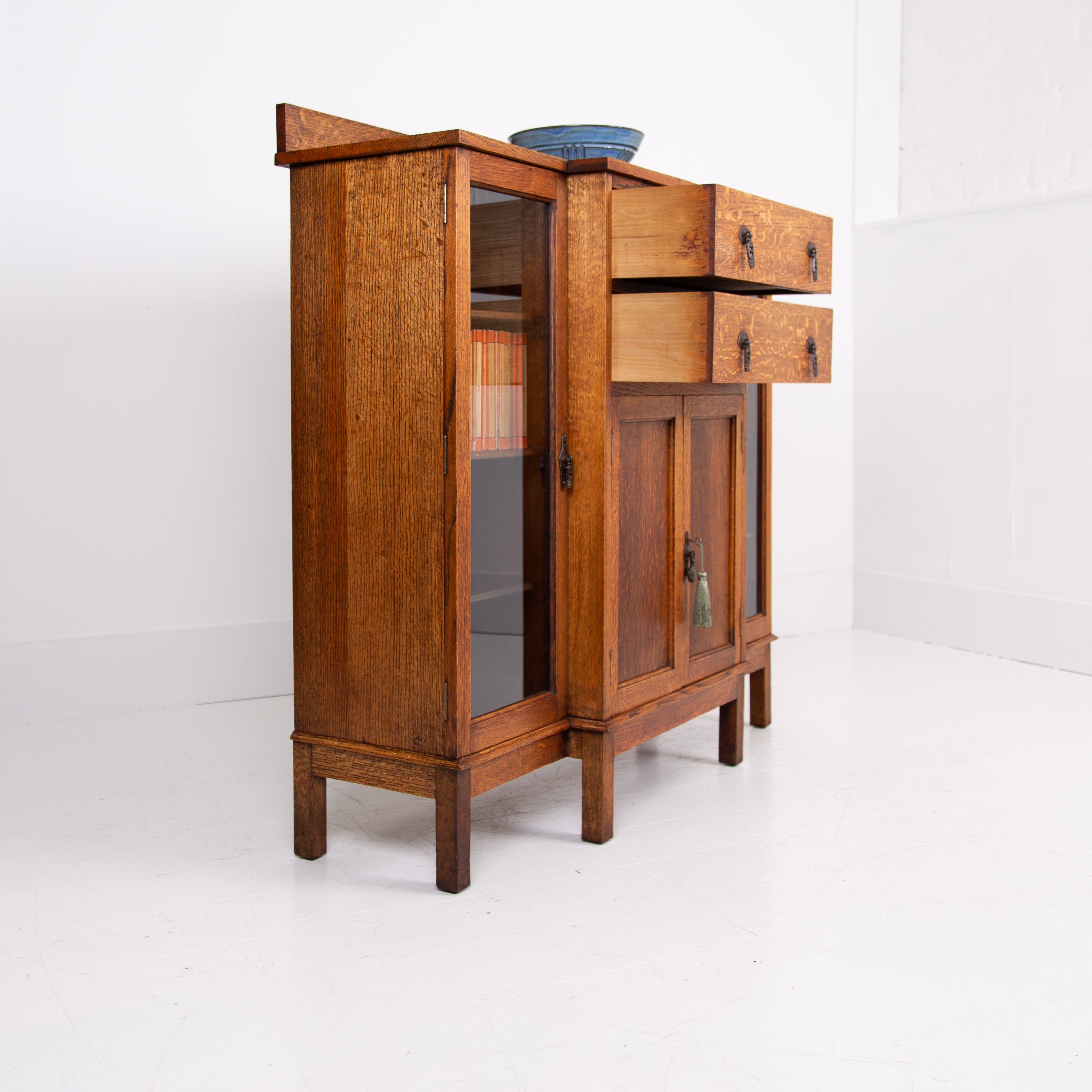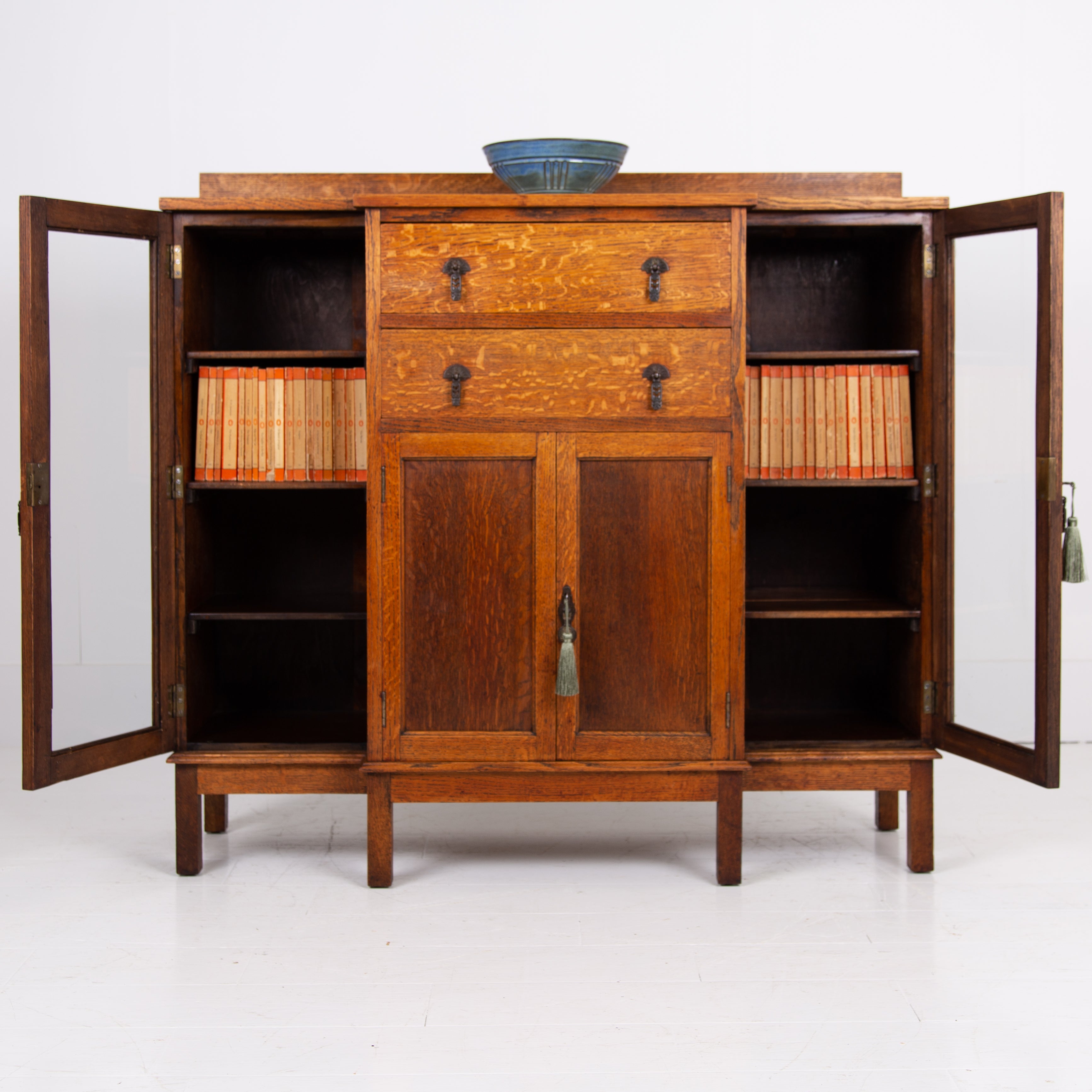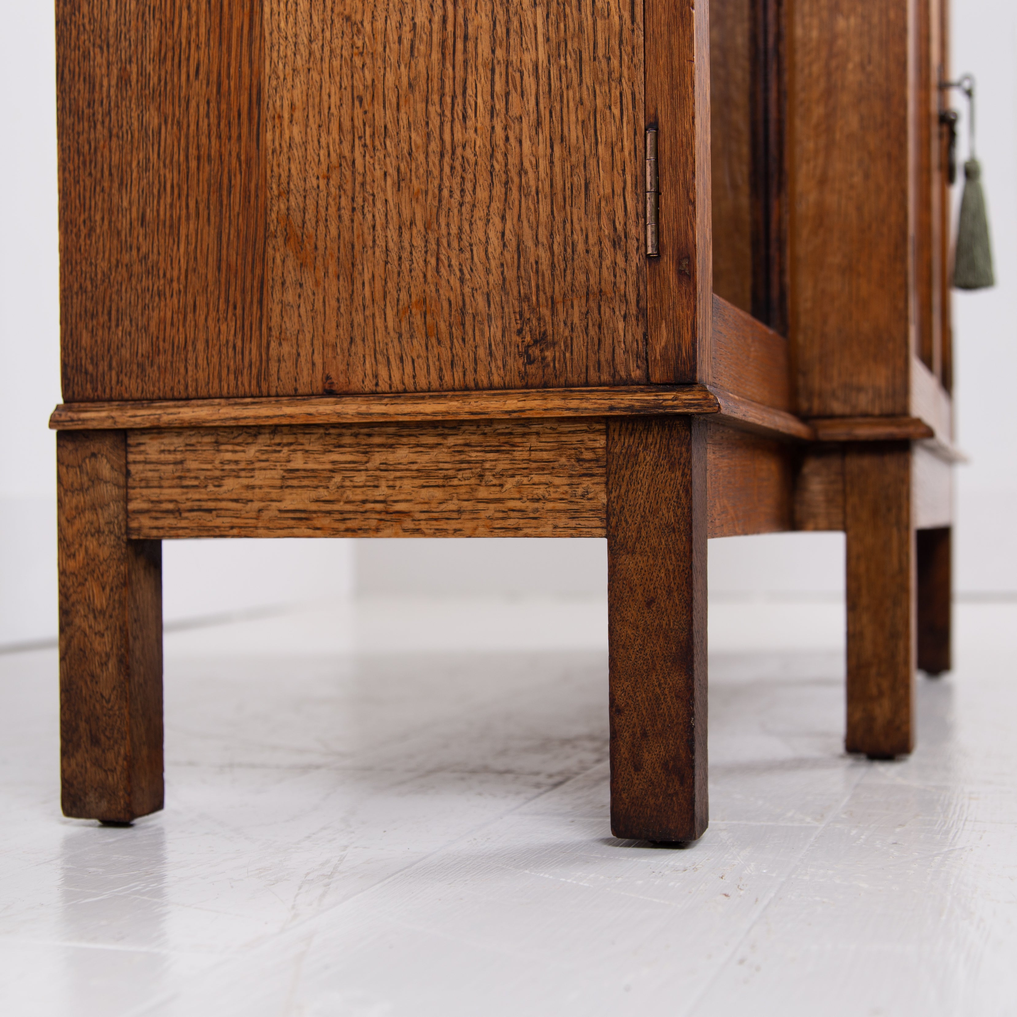 Condition is good with sensible light historic wear to the well toned and grained English oak. We have a working lock and key for the cupboard and also one for the left hand side glazed door, not for the right. Expect a well cared for piece which has been carefully hand waxed in our workshop. Reassuringly weighty and ready to place.