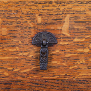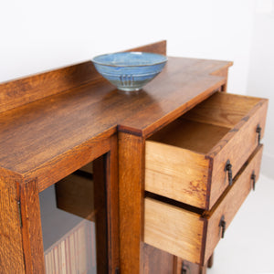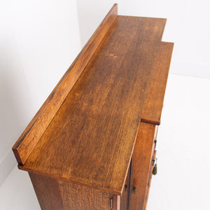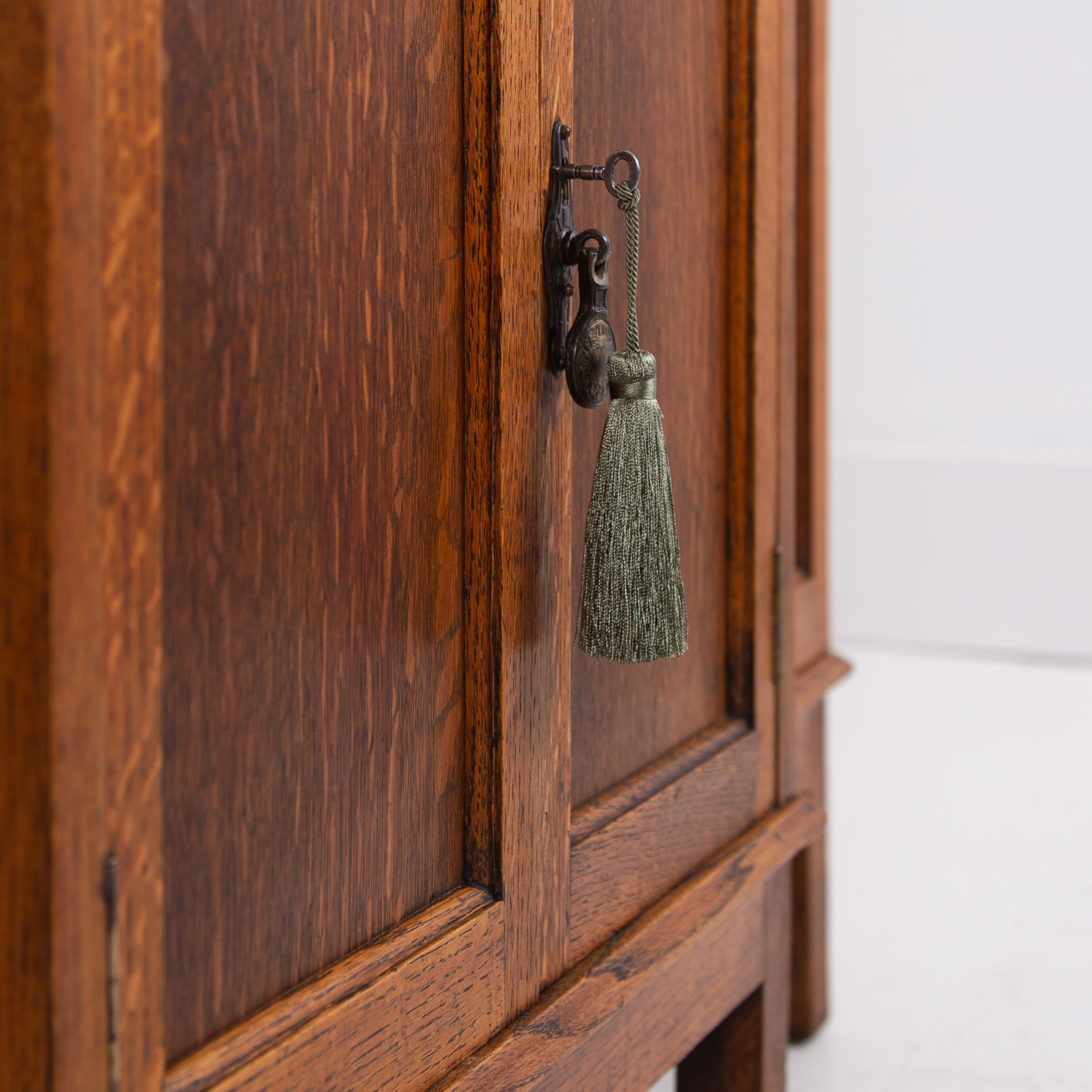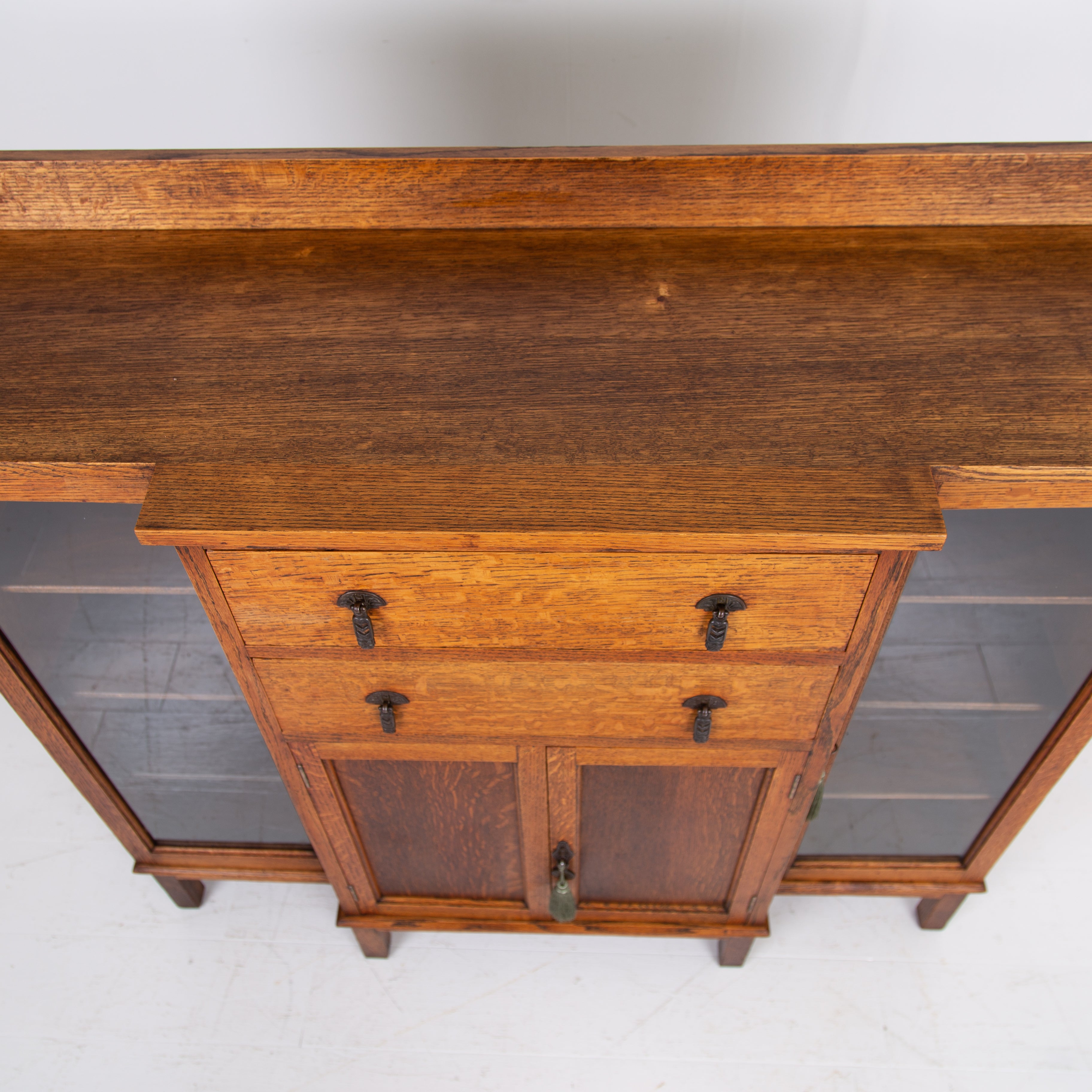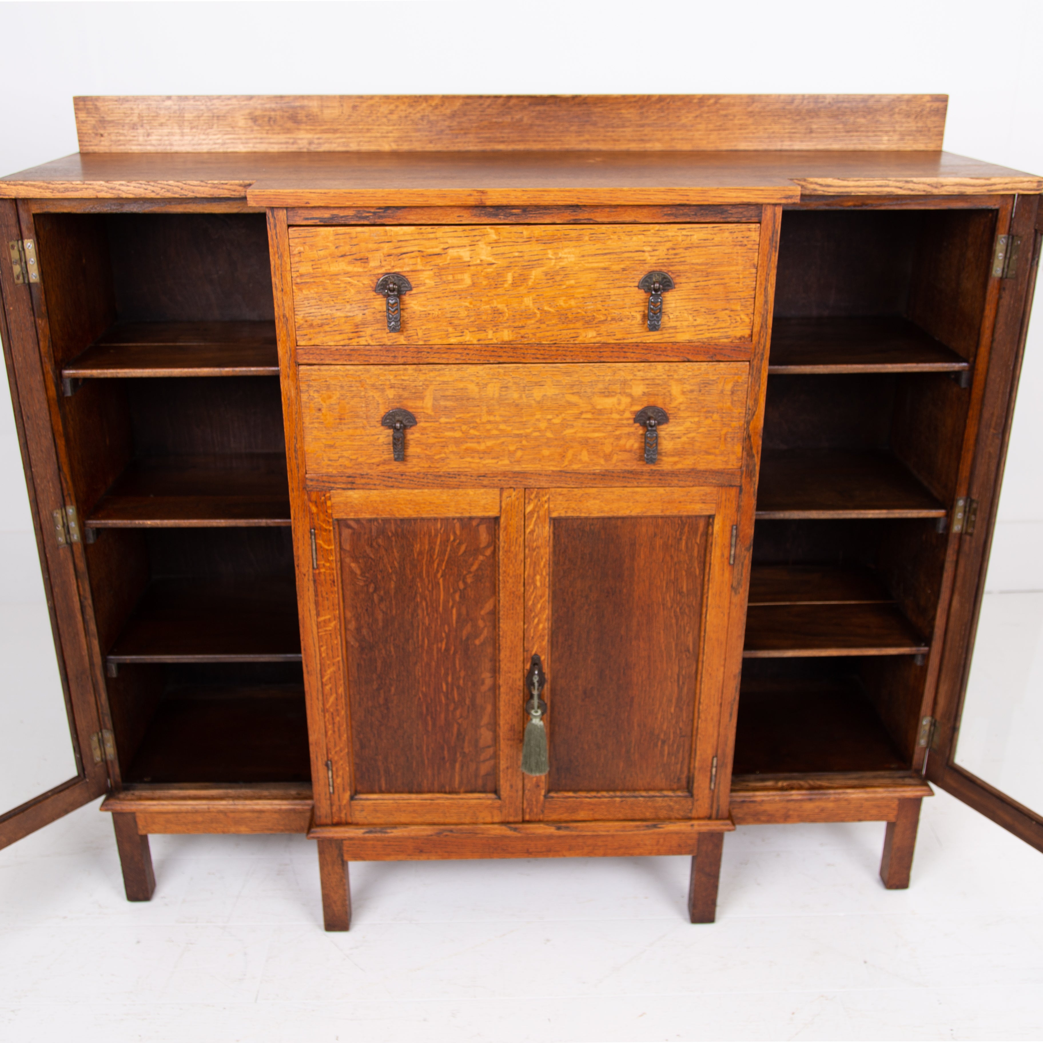 Condition is good with sensible light historic wear to the well toned and grained English oak. We have a working lock and key for the cupboard and also one for the left hand side glazed door, not for the right. Expect a well cared for piece which has been carefully hand waxed in our workshop. Reassuringly weighty and ready to place.