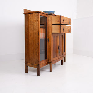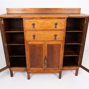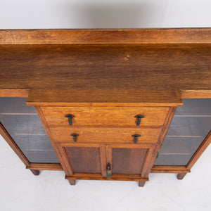 Super quality and craftsmanship on this rather attractive English 1920s glazed cabinet. This one sits well in solid golden oak and offers a useful and attractive set up of 2 well sized drawers, 2 long oak framed glazed sections with fixed shelves and also a 2 door oak panelled cupboard with fixed shelves inside.