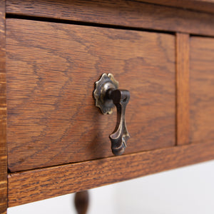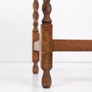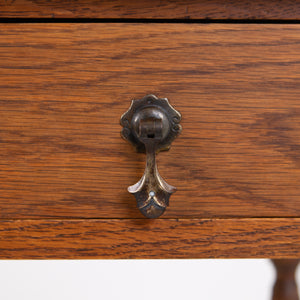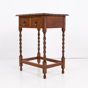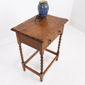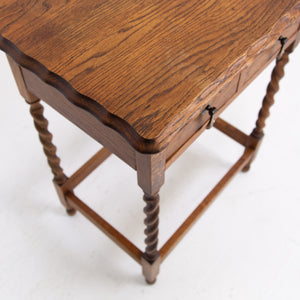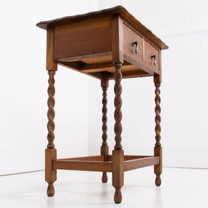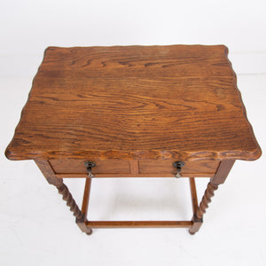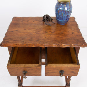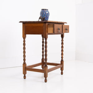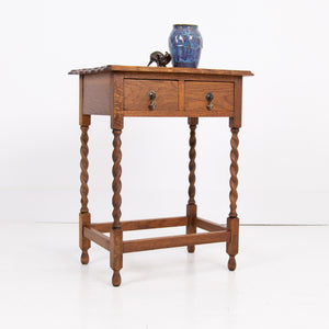 A rather lovely 2 drawer English oak table of smaller proportions than most and surprisingly heavy for its size. We have 2 deep drawers with solid brass drop knobs sitting on oak barley twist legs with a pie crust top.