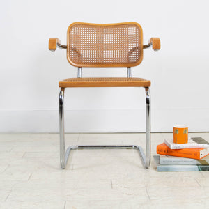 The well-shaped cantilever chrome frame is kink, repair and crack free with a little age pitting but nothing nasty, hidden little stoppers are in place. The cane is all in place with the right colour of aging. The polished wood frames again have age marks to the arms but nothing over the top and are firm with no repairs.
