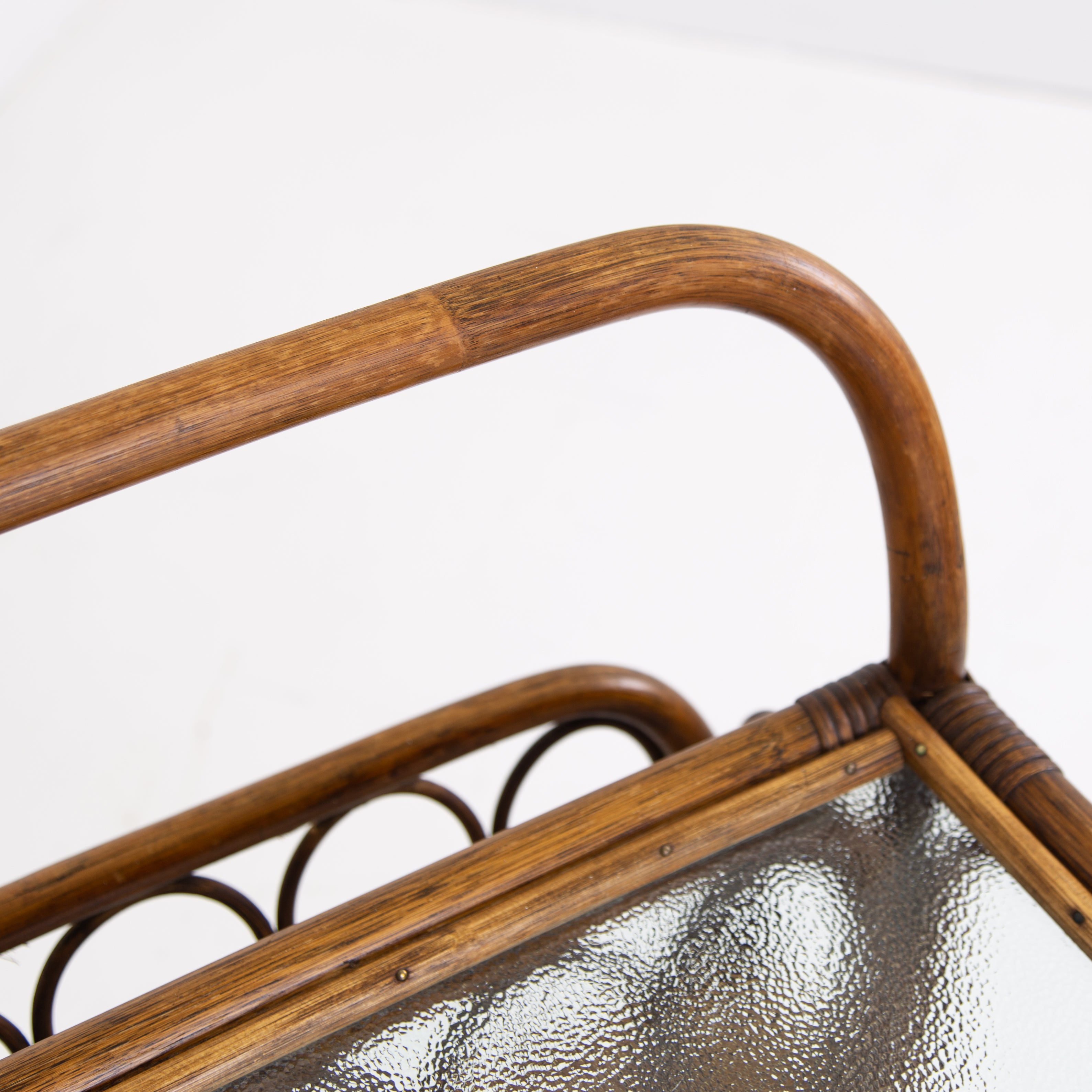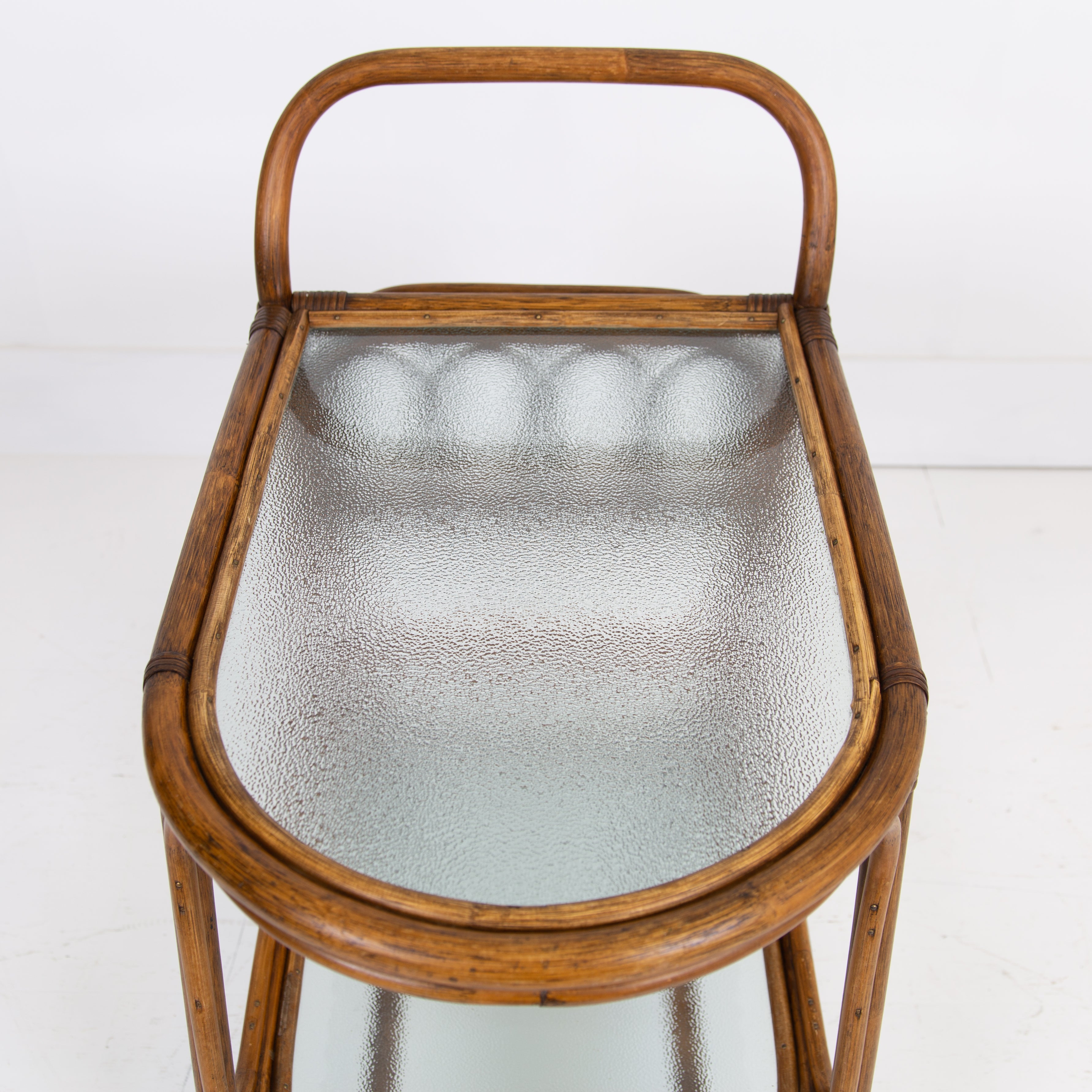 Great looking mid century bamboo drinks trolley cart by Angrave's. It’s in a lovely sensibly aged condition with frosted glass in the top and lower shelf - a nice feature - some are solid board rather than glass…