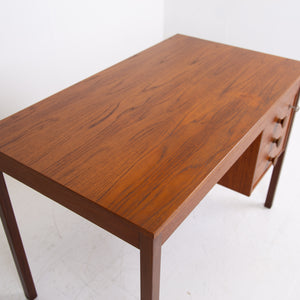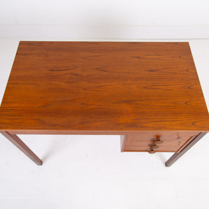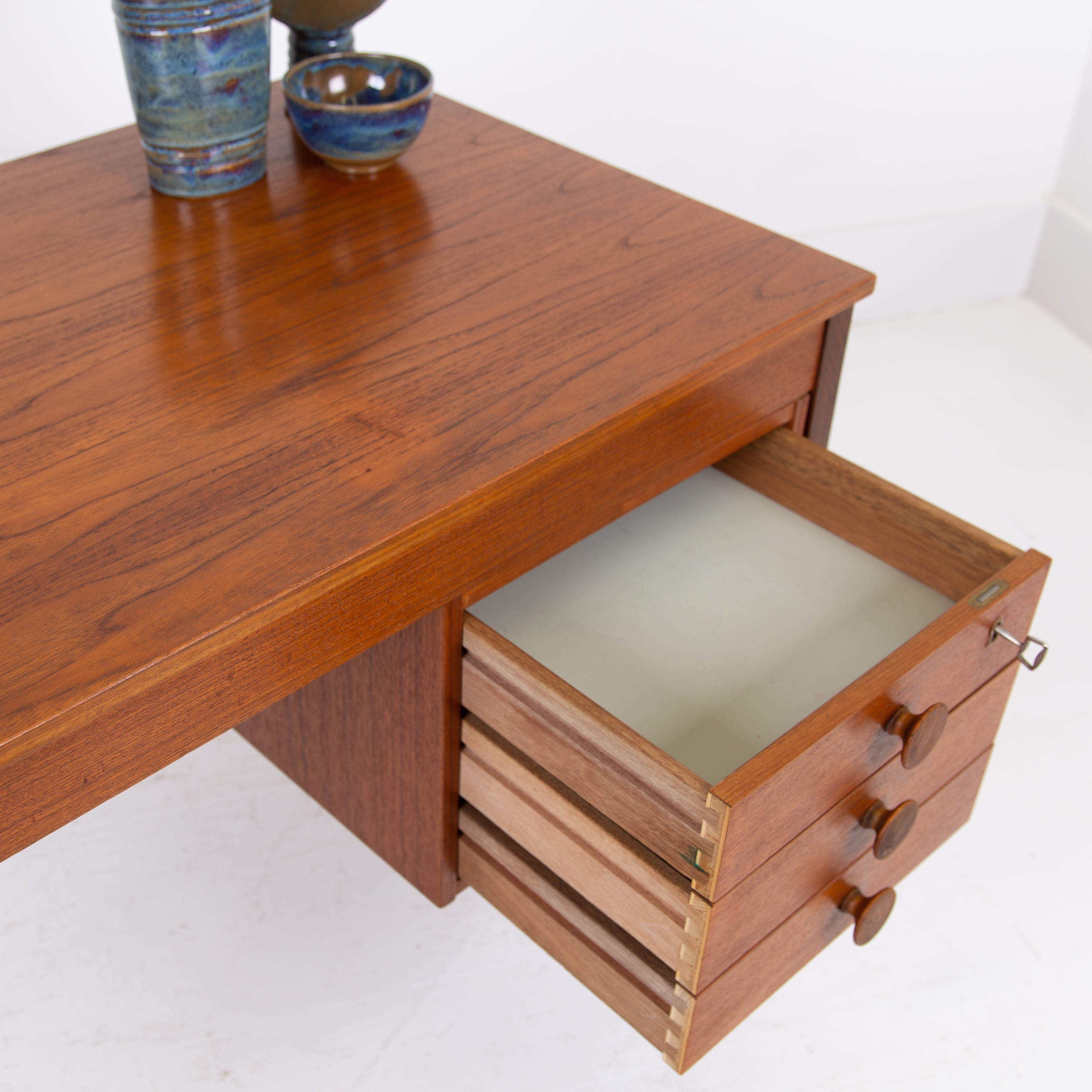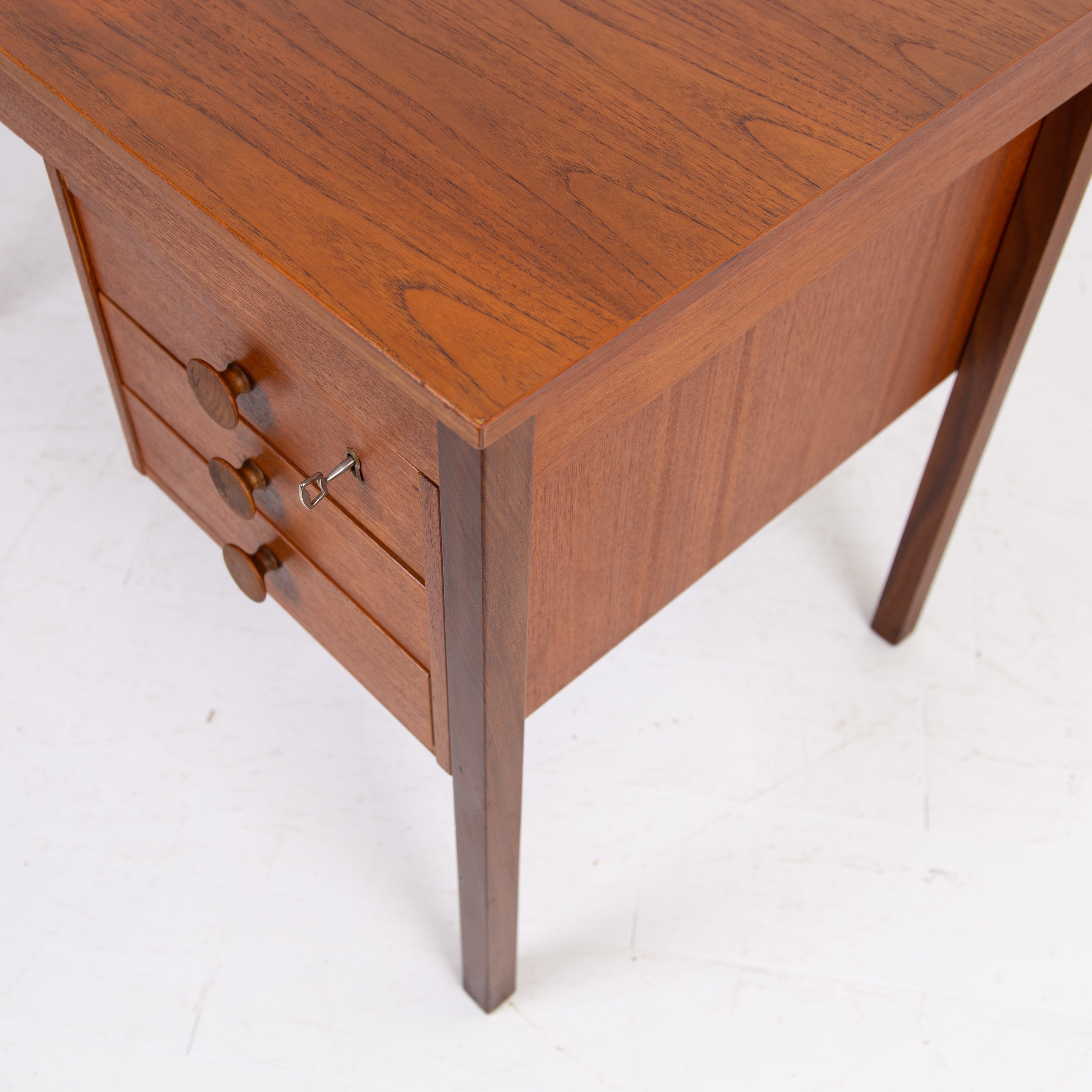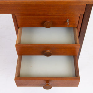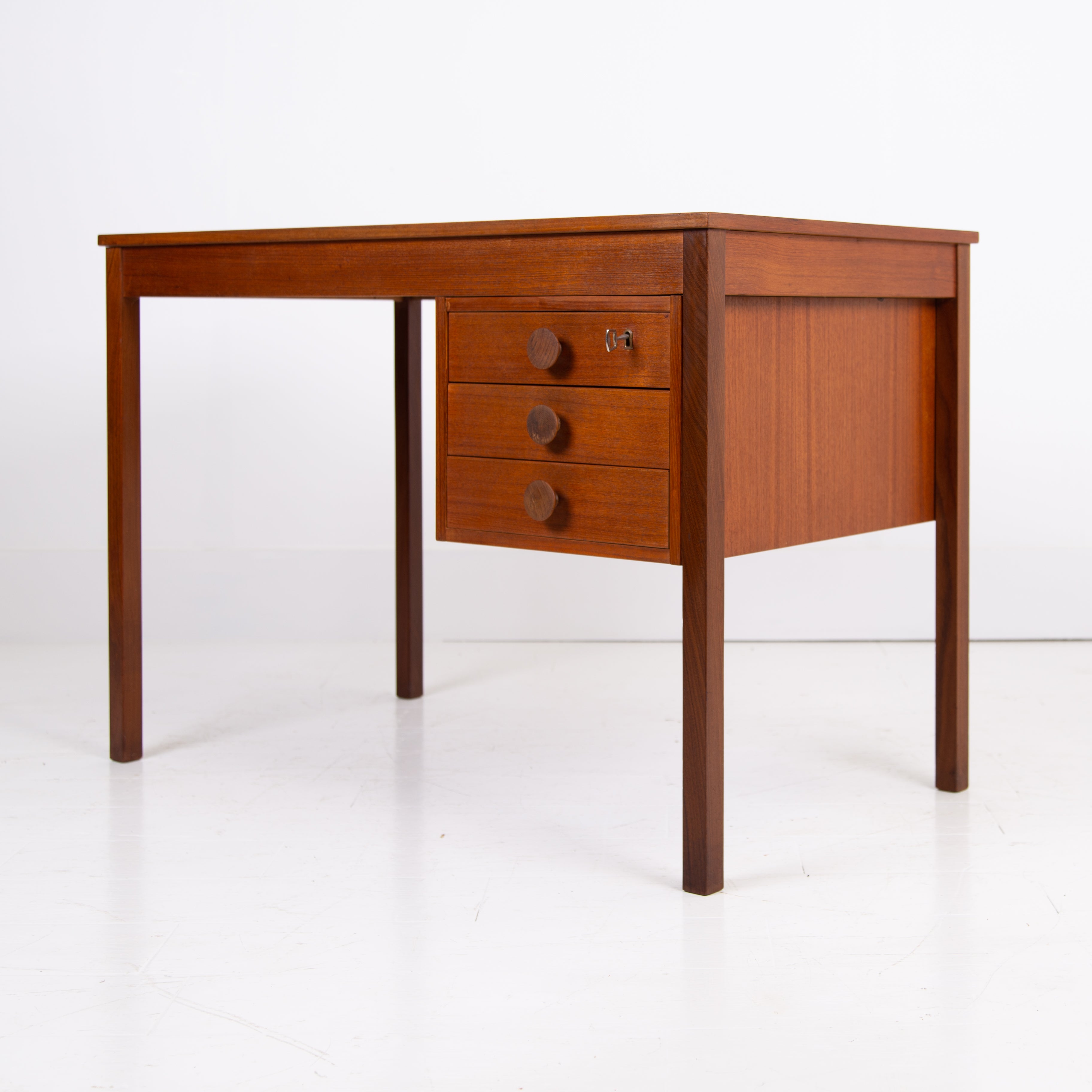 Super compact 3 drawer Danish desk in teak and Afromosia with working lock and key. A smart looking desk with classic mid century lines and design. The legs do detach if space is tight for placing.