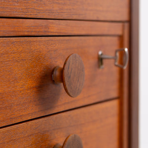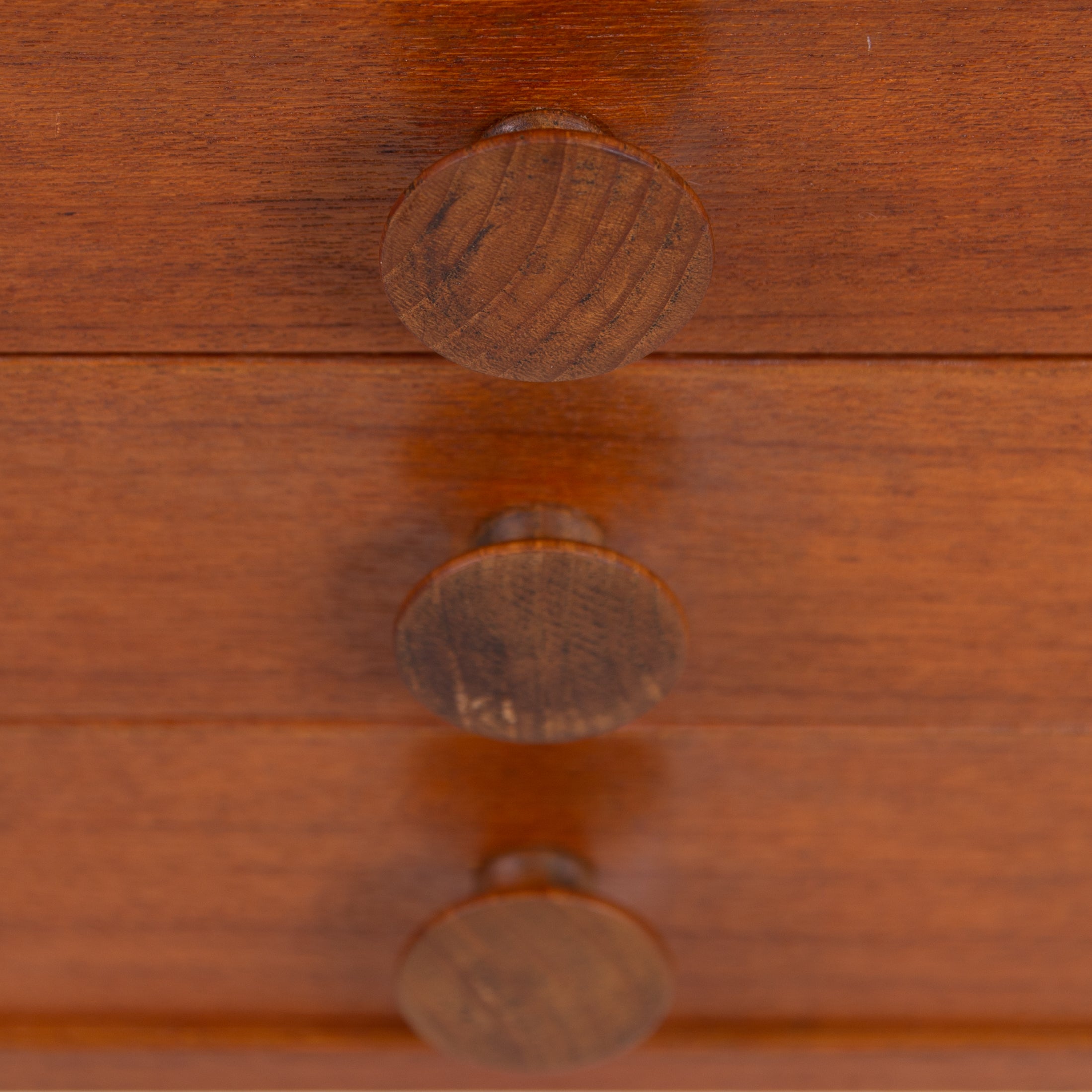 The condition is good with no splits, flakes or cracks to the Afromosia or teak veneer. All drawers are running well and have been cleaned inside with just some faint ink marks, as mentioned a working lock and key is present. The top is aged marked but nothing fresh or nasty.