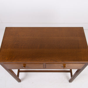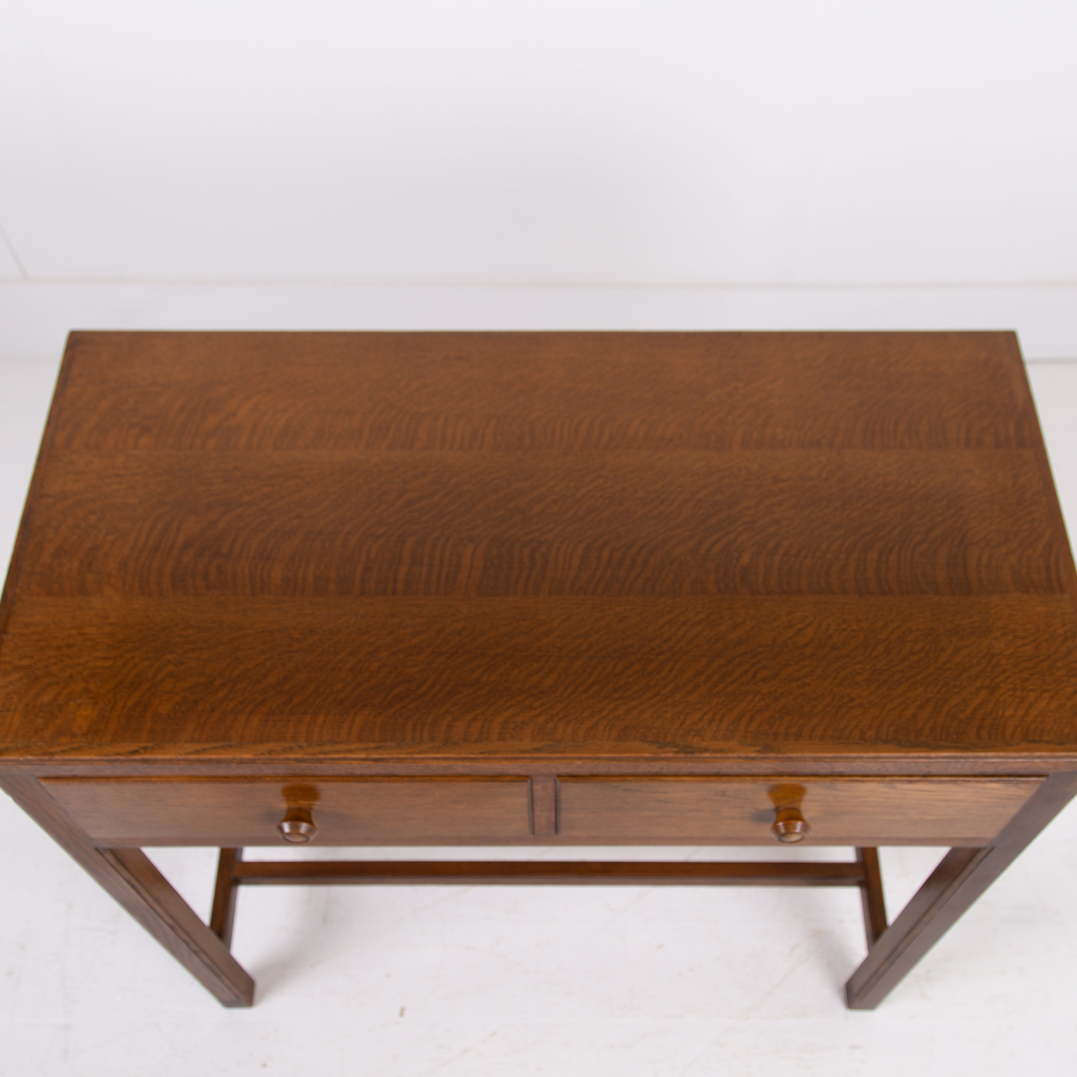 It’s a good, stylish Mid Century piece in English Cotswold School design, a good size with two drawers offering a generous workspace as a computer desk or writing table. In a well-toned oak, with a moulded top and chamfered legs united by a cross stretcher.