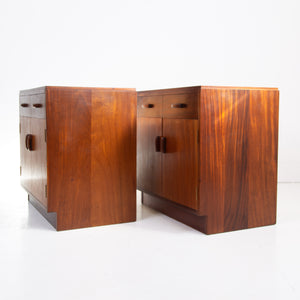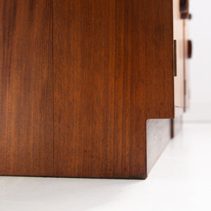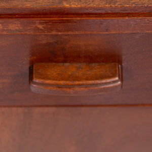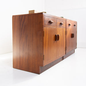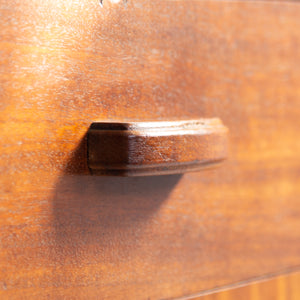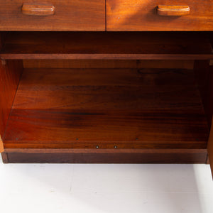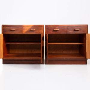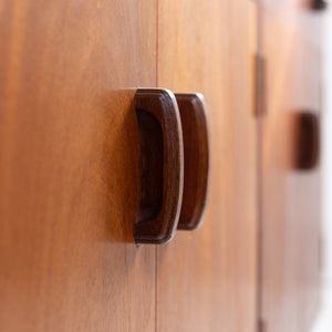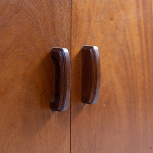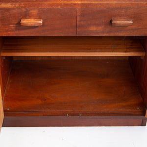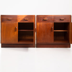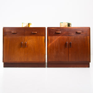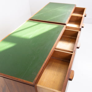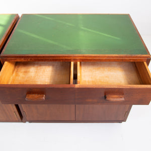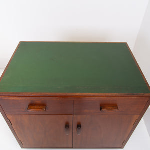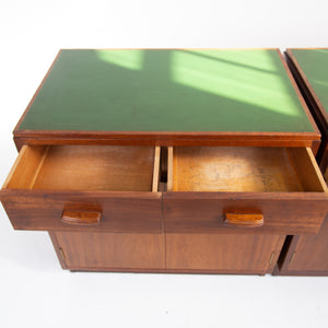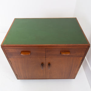 The cabinets, very likely made by Gordon Russell or Alfred Cox - we have had similar with the Russell stamp are of a good scale with 2 drawers with those well shaped handles, a deep and shelved cupboard underneath which opens by way of similar designed handles. The top is teak edged with a green insert which is attractively age crazed and both cabinets have been carefully cleaned and prepared ready for placing. Please expect aging and patina but nothing nasty, heavy and solid for their size too.