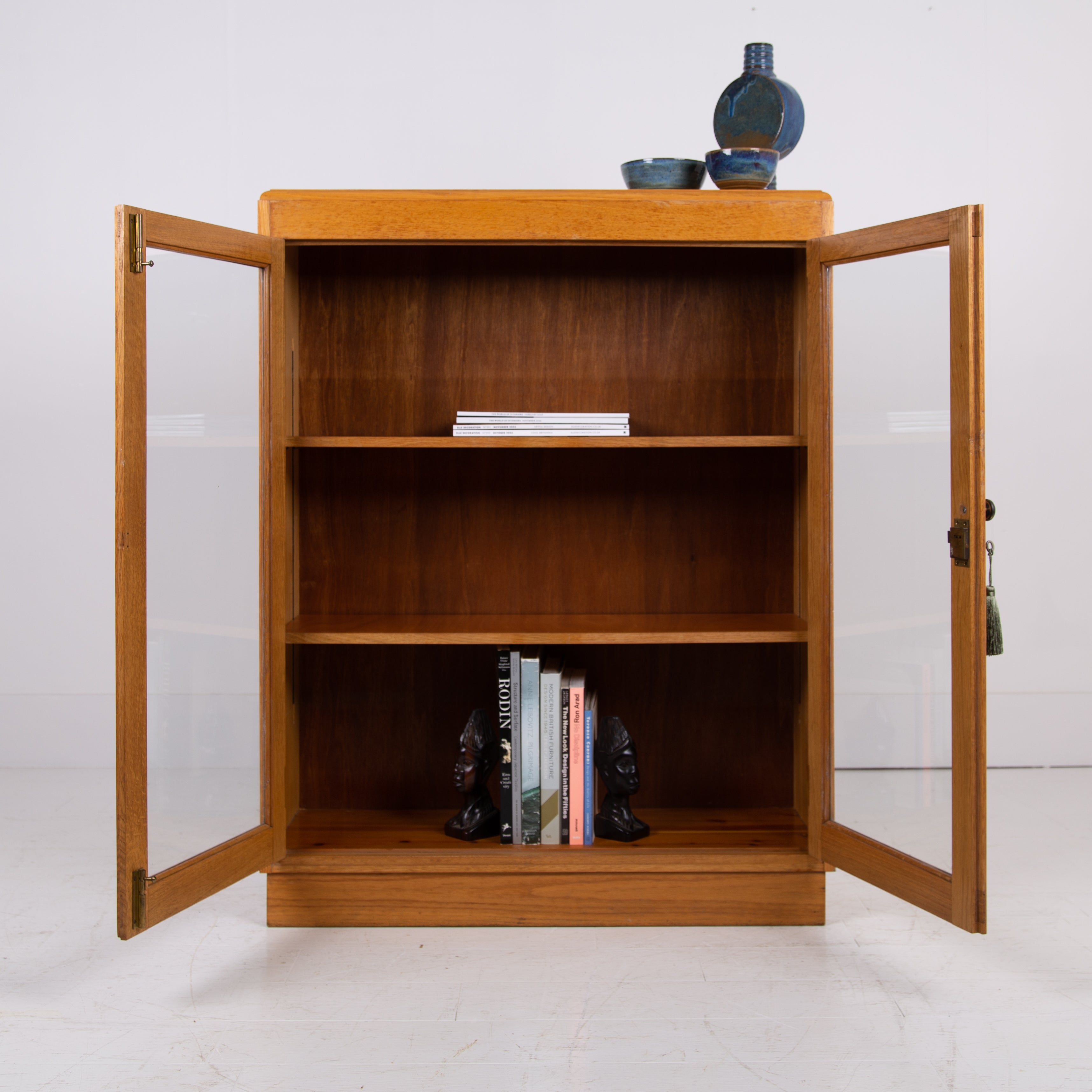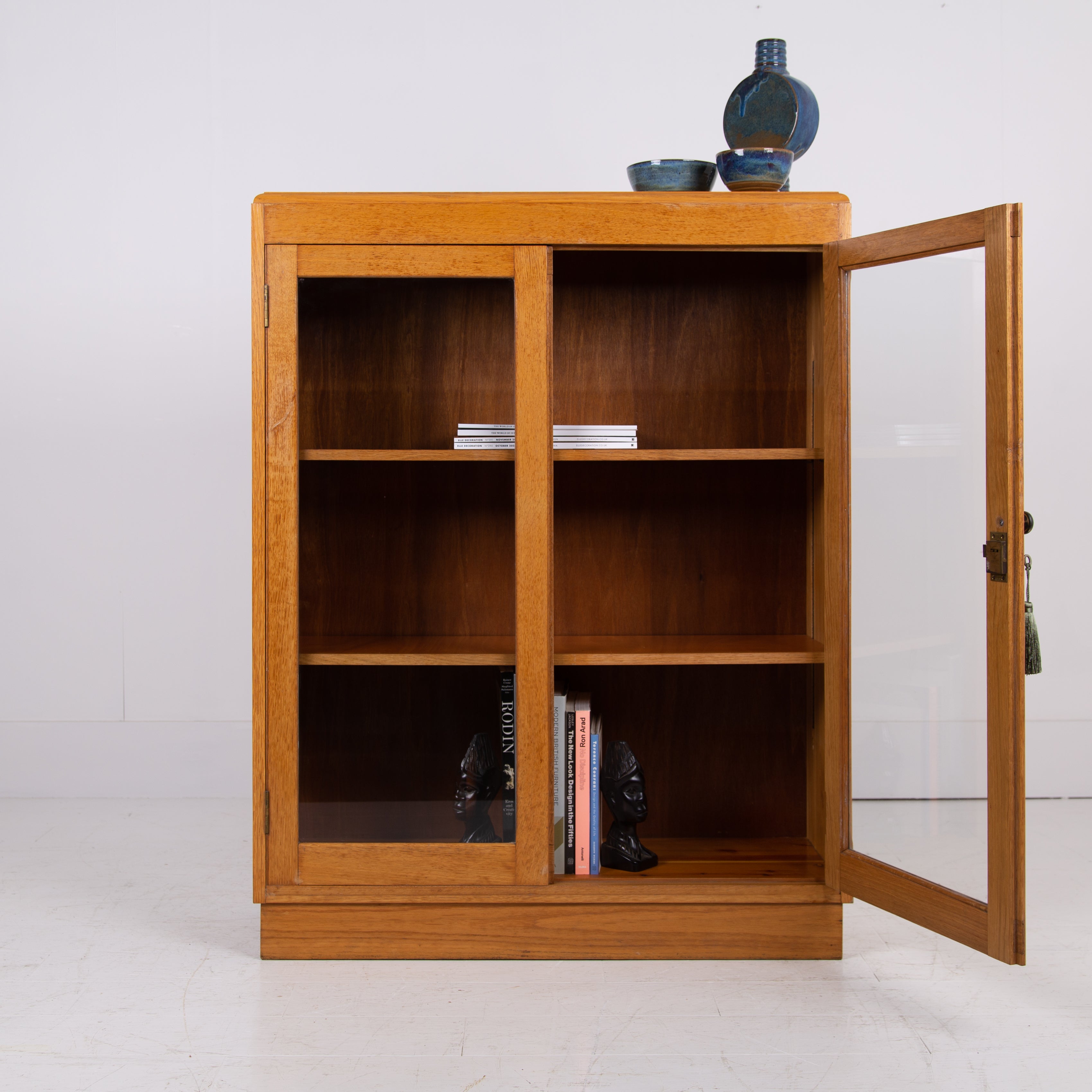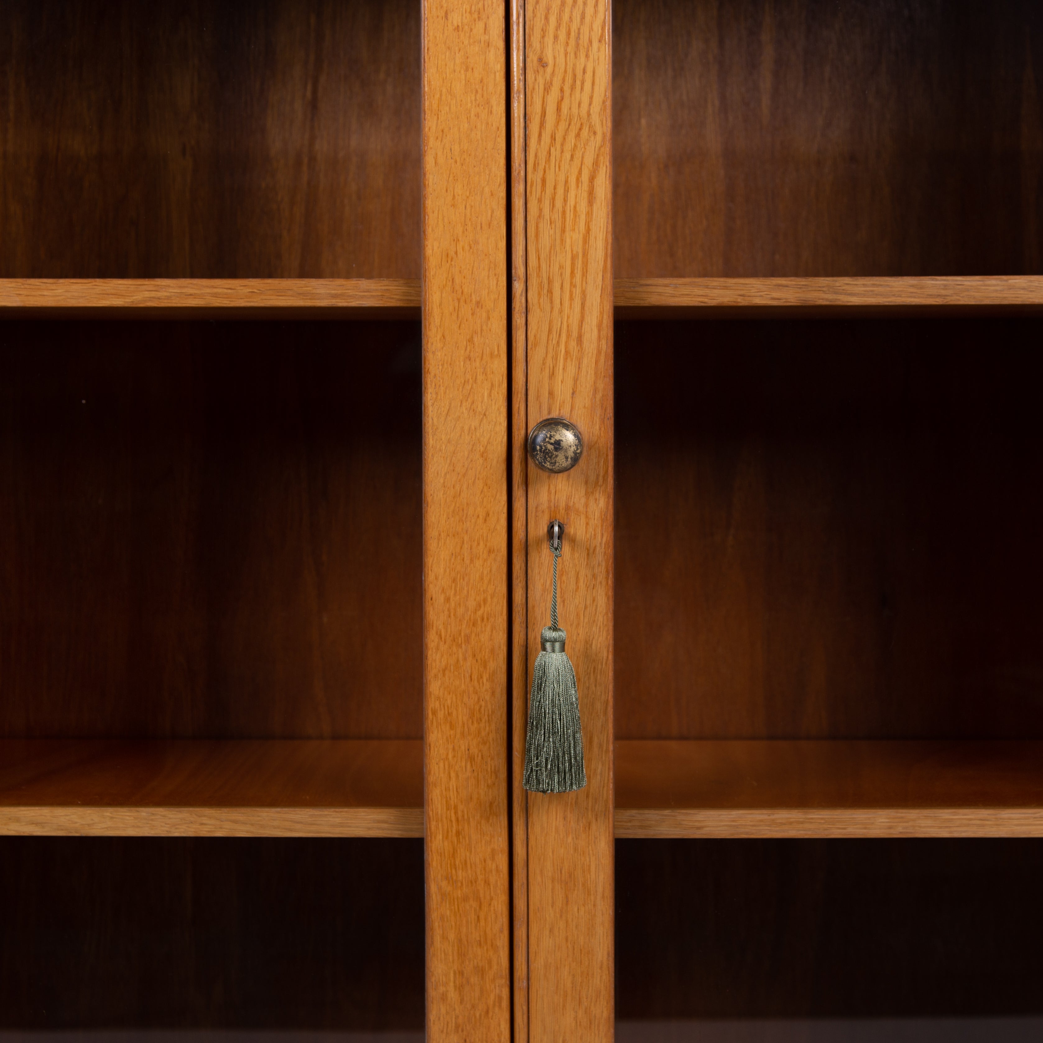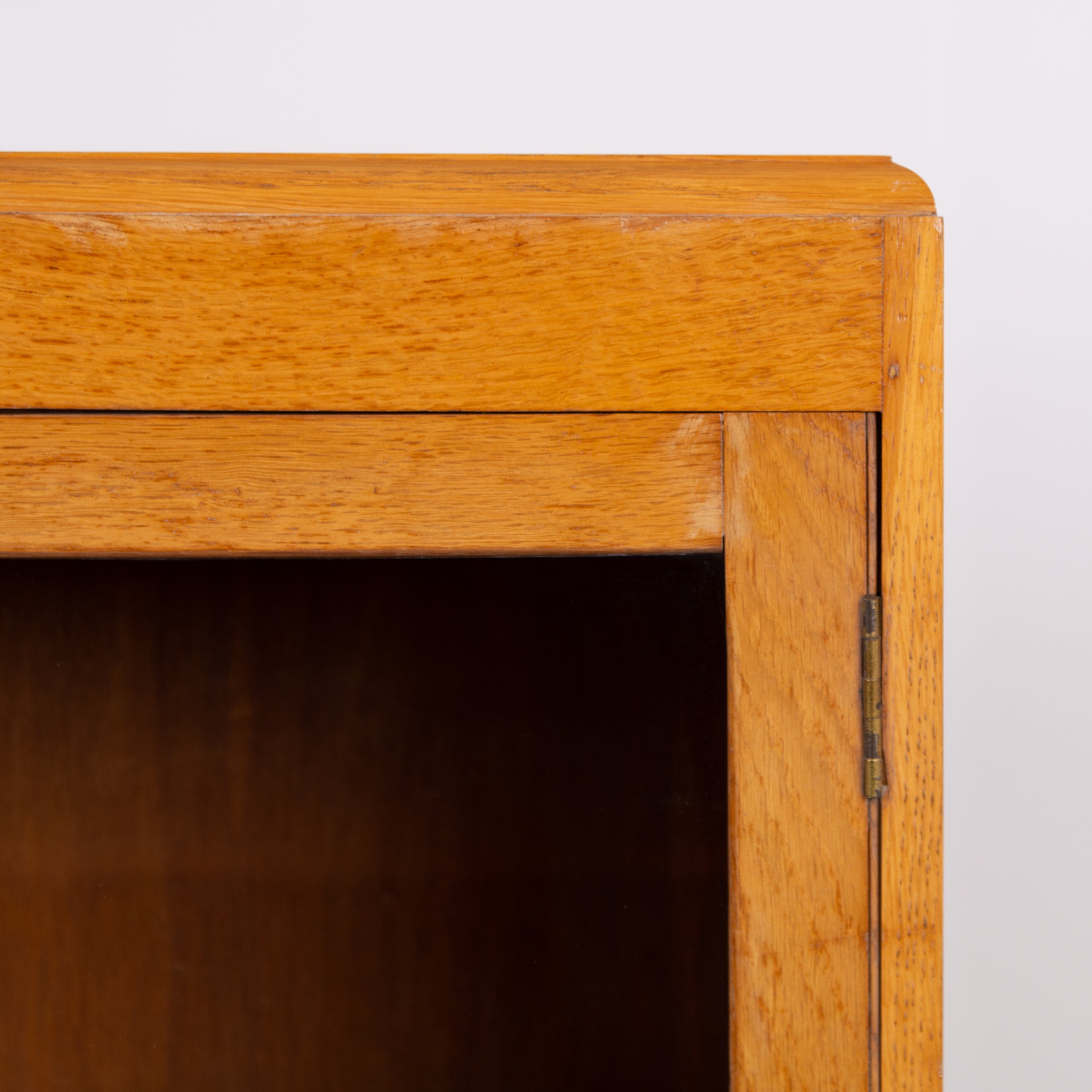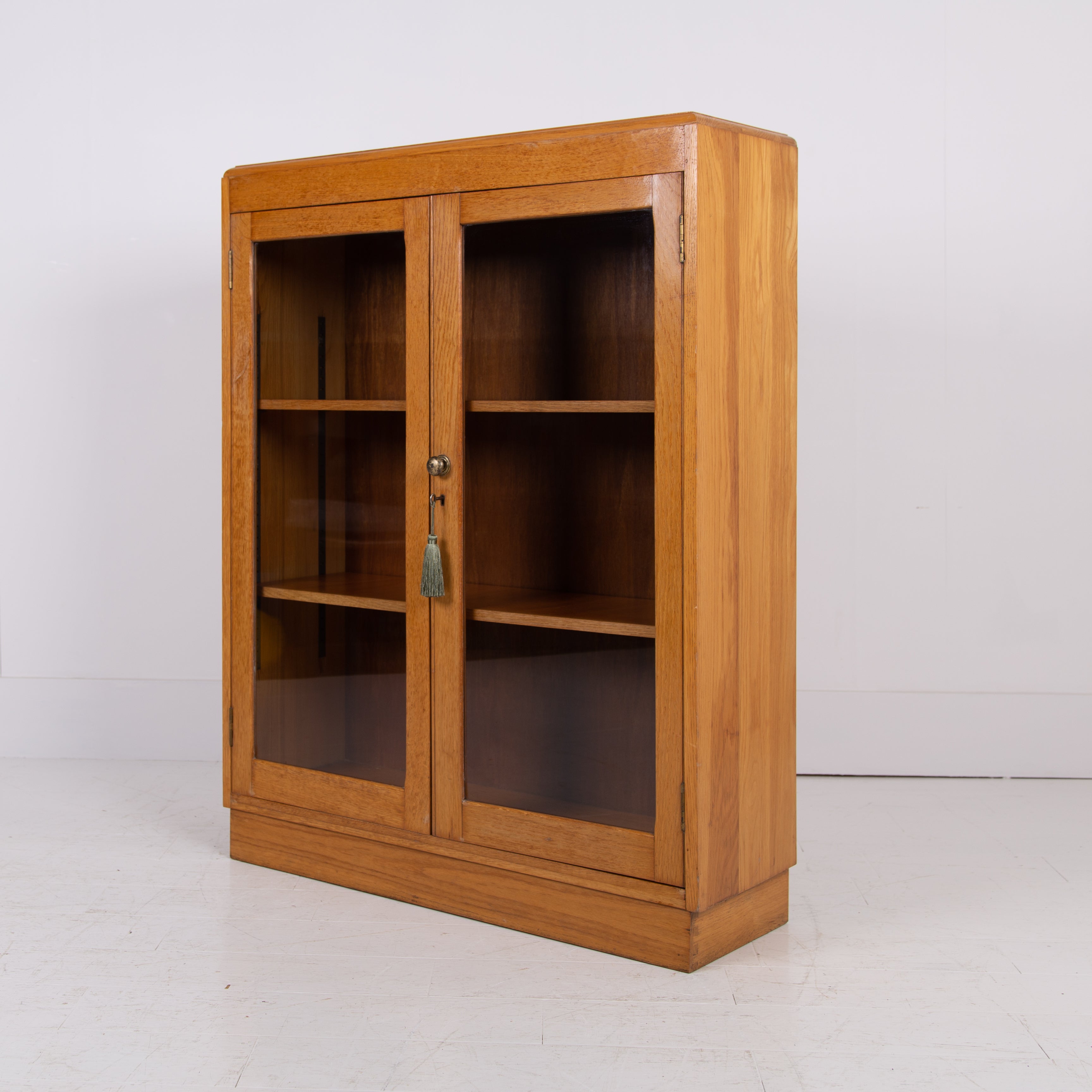 It sits in a lighter oak than some with two glazed oak framed doors, has a working lock and key and aged brass knob. Inside we have 2 adjustable shelves oak fronted and we have ensured the piece is ready for placing, expect light usage nothing nasty.