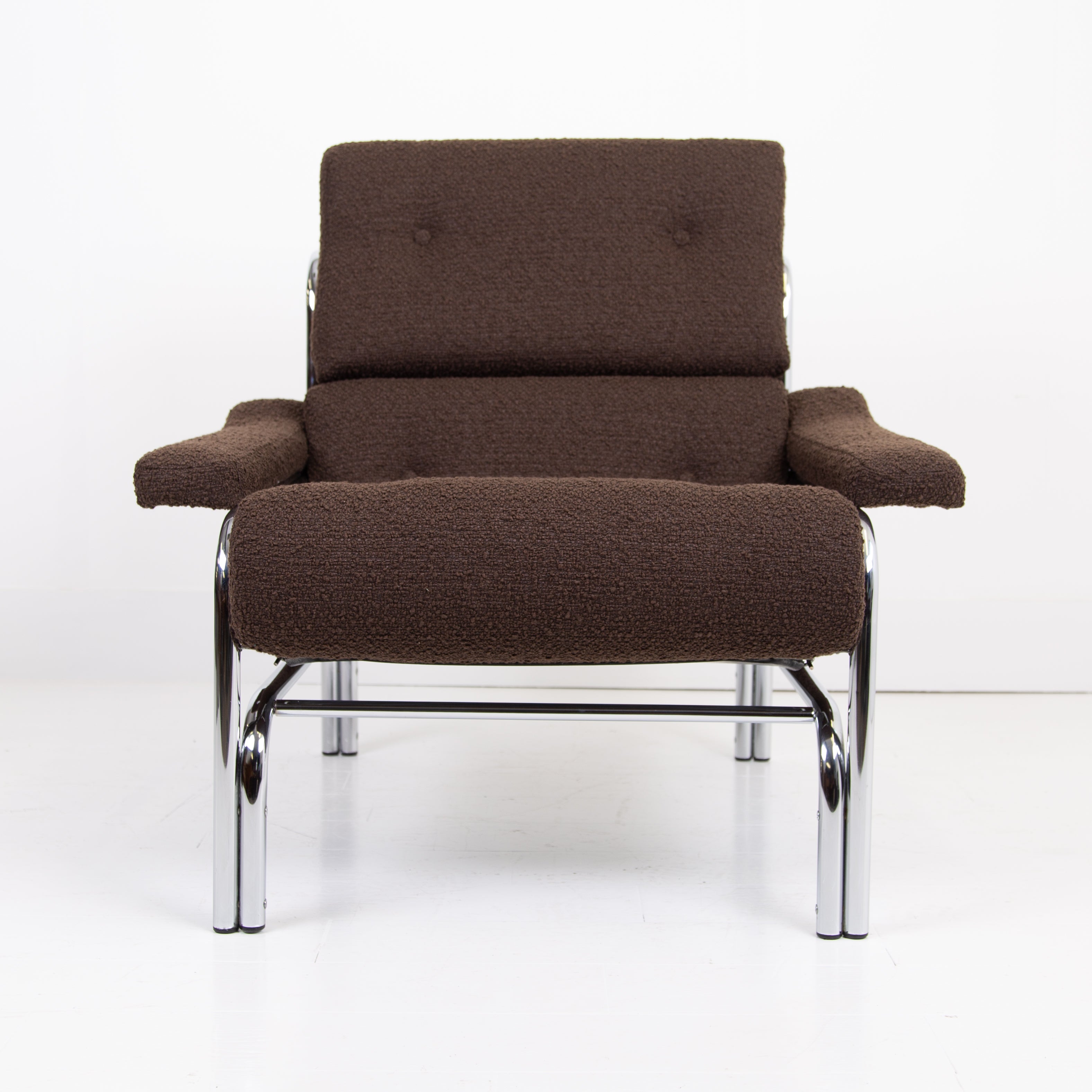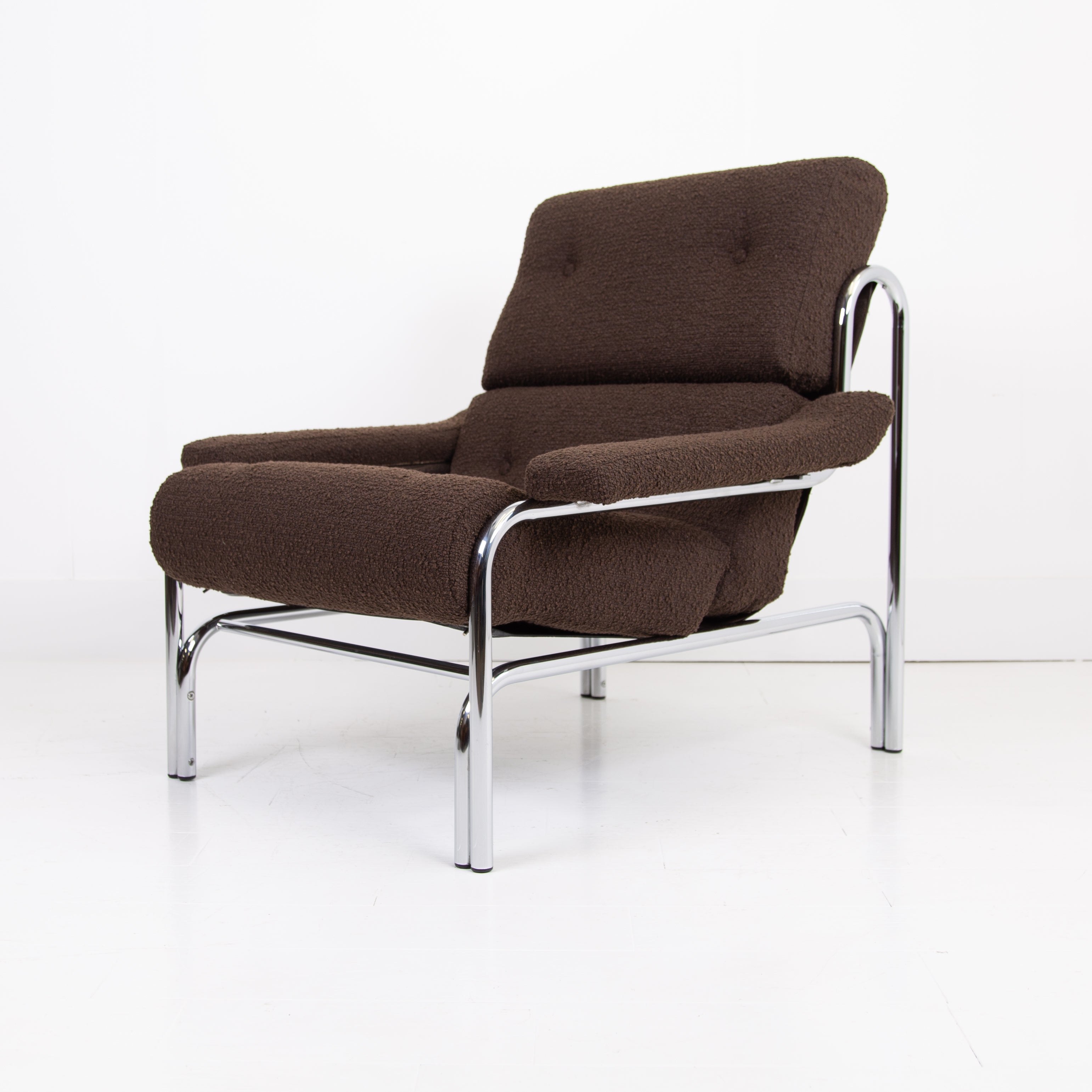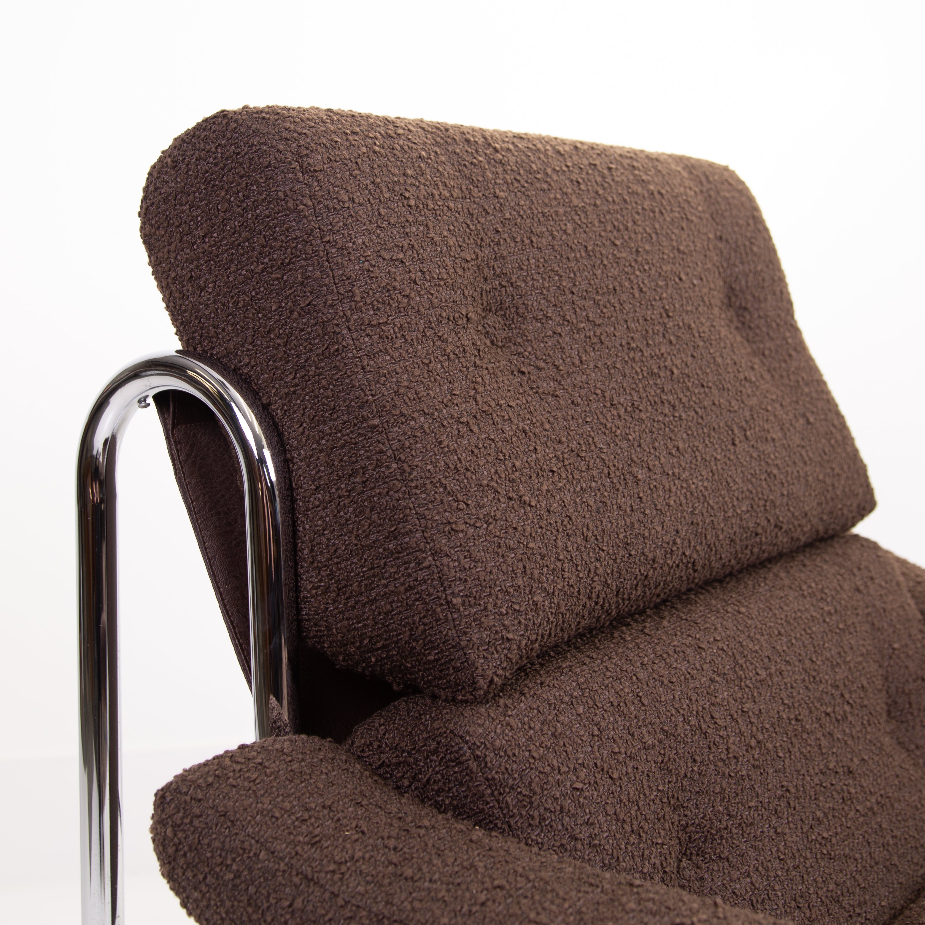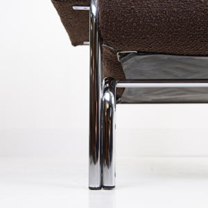 This armchair from the Alpha range by Pieff is presented with its thick set chrome plated tubular metal frame and with the benefit of our upholsterer having made new cushions and arms which are all covered using an espresso coloured Cristina Marrone boucle. It’s looking rather glorious and awaiting a new home.