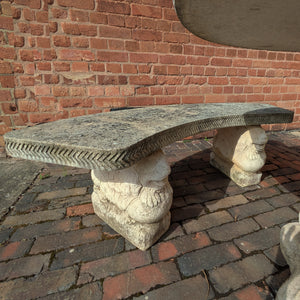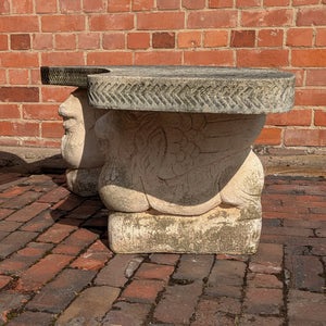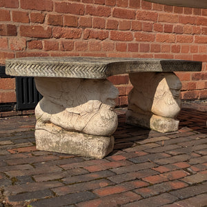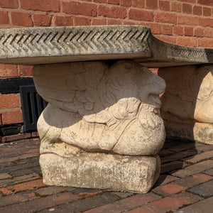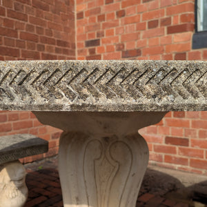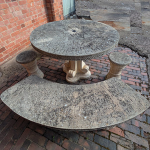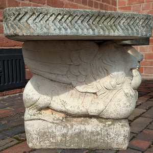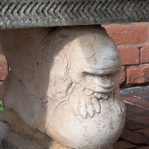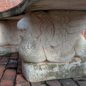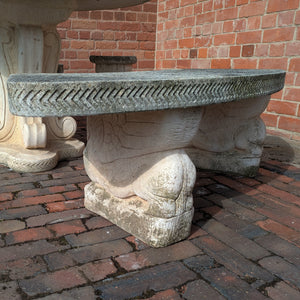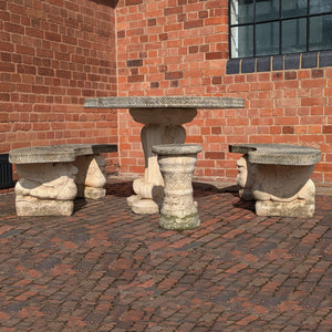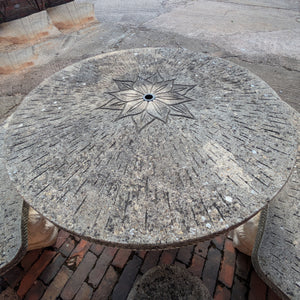 The rather fabulous looking decorative patio set is in reconstituted stone with sensible genuine aging to all parts. Unusual to find a complete set, we have a large circular patterned table with decorative flared base, two curved benches with winged Pegasus shaped supports to each and two matching patterned stools. The set is nicely aged - one of the stools has a small aged repair, but not a concern. The set breaks down into pieces for moving, but is very heavy!