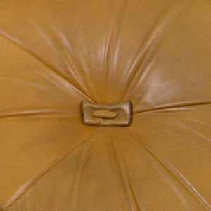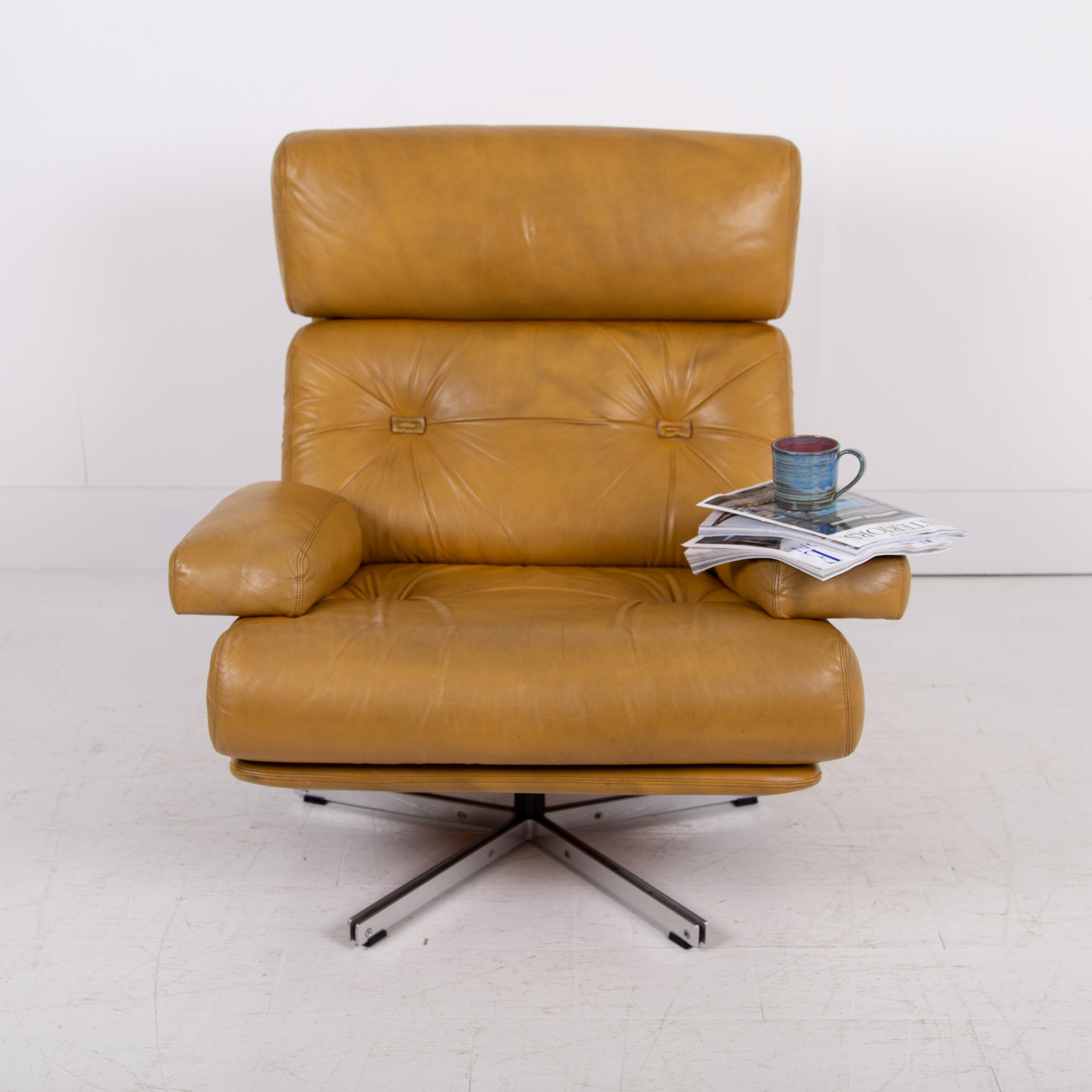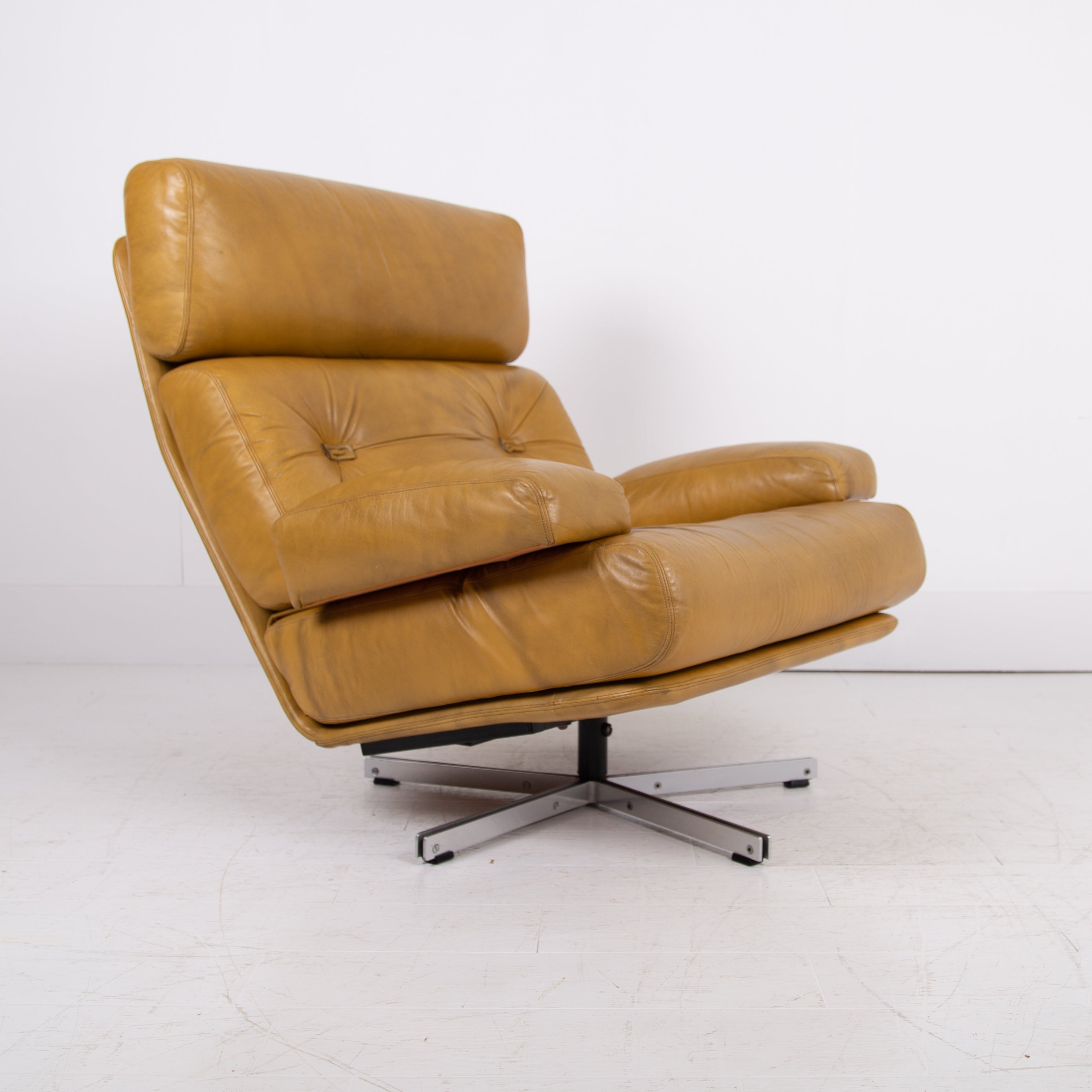 This chair benefits from being carefully used and possessing a cracking profile. The images really display the quality of the craftsmanship and also the quality of the materials used. We are constantly purchasing this type of chair and this one is in a great condition with sensible aged creasing and wear to the deep speckled mustard leather, please note that the leather would have been “antiqued” when originally produced, hence the variation in tones. No rips or tears, the swivel is working fine, no cracks to the base and it smells fine. The chair has been carefully cleaned and nourished with a leather balm to give it a soft natural glow rather than a heavy handed gloss finish.