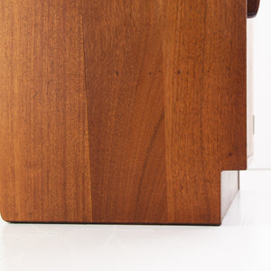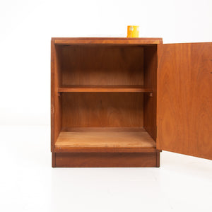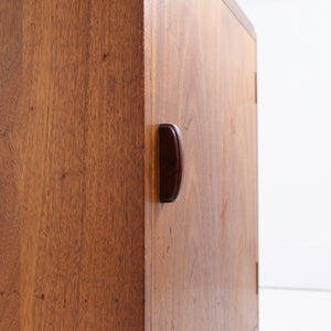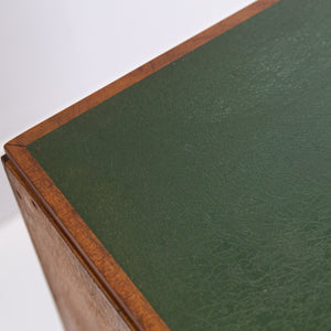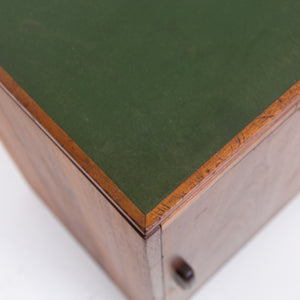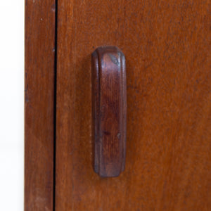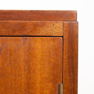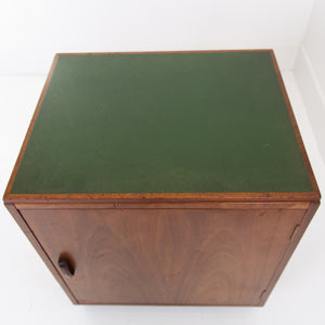 We have a large door with an original handle which opens to a decent sized storage area with a removable half solid teak shelf. The age crazed green top which is original is bordered by teak and the design is very much of the era and likely Gordon Russell as we have had some very similar ones in the past with the Russell badge on or it could be by Alfred Cox.