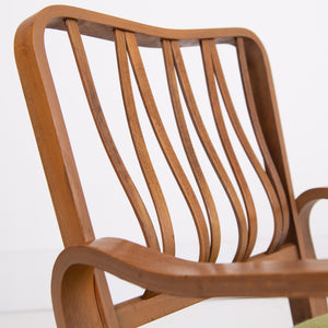 The lovely bentwood frame is highly original and has been carefully prepared with a light coat of museum wax in our workshop. The seat has been professionally reupholstered with new filling and topped with a quality Duresta woven fabric in bitter lime green which works well with the design.