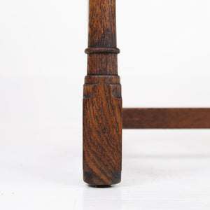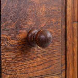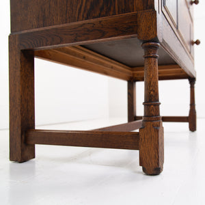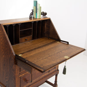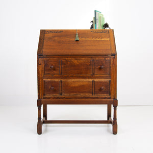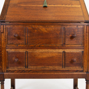 The pigeon holed interior is displayed once the decorative brass hinged oak front is opened which has a working lock and key. The useful 2 drawers with round oak knobs are supported by well turned column style legs. The piece has enjoyed a careful repolish in our workshop so expect light wear and a pleasing tone and rich grain to the oak. Makers label to the inside of the drawer. The piece is ready to place and enjoy.