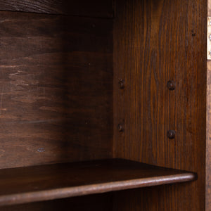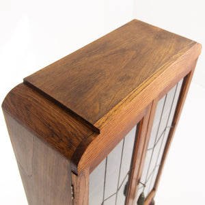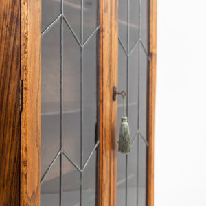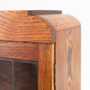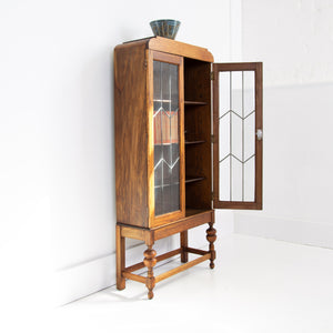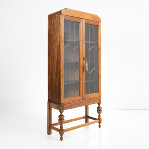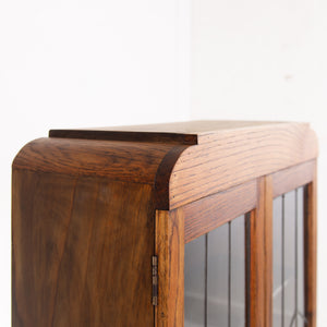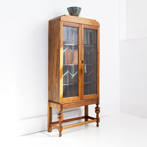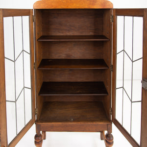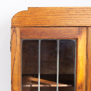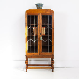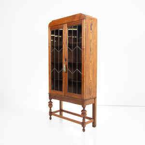 A rather attractive, smaller scale than most 1930s oak glazed 2 door bookcase. It's a pleasing to the eye little oak framed bookcase with its glazed “chevron” shaped leaded patterned doors very much of the 1930s Deco period revealing 3 adjustable shelves with working lock and key all sitting on well turned oak legs. Well proportioned and neat.