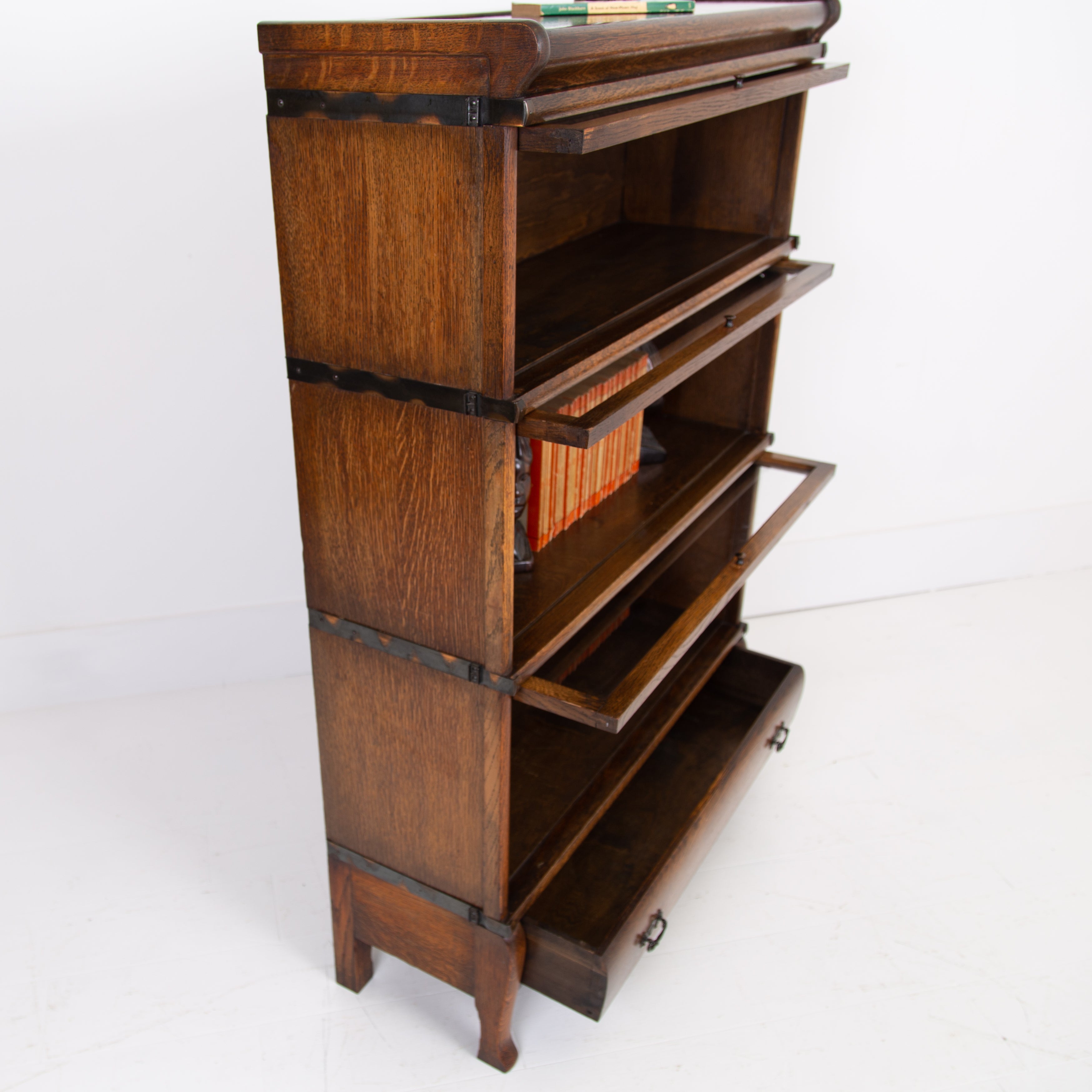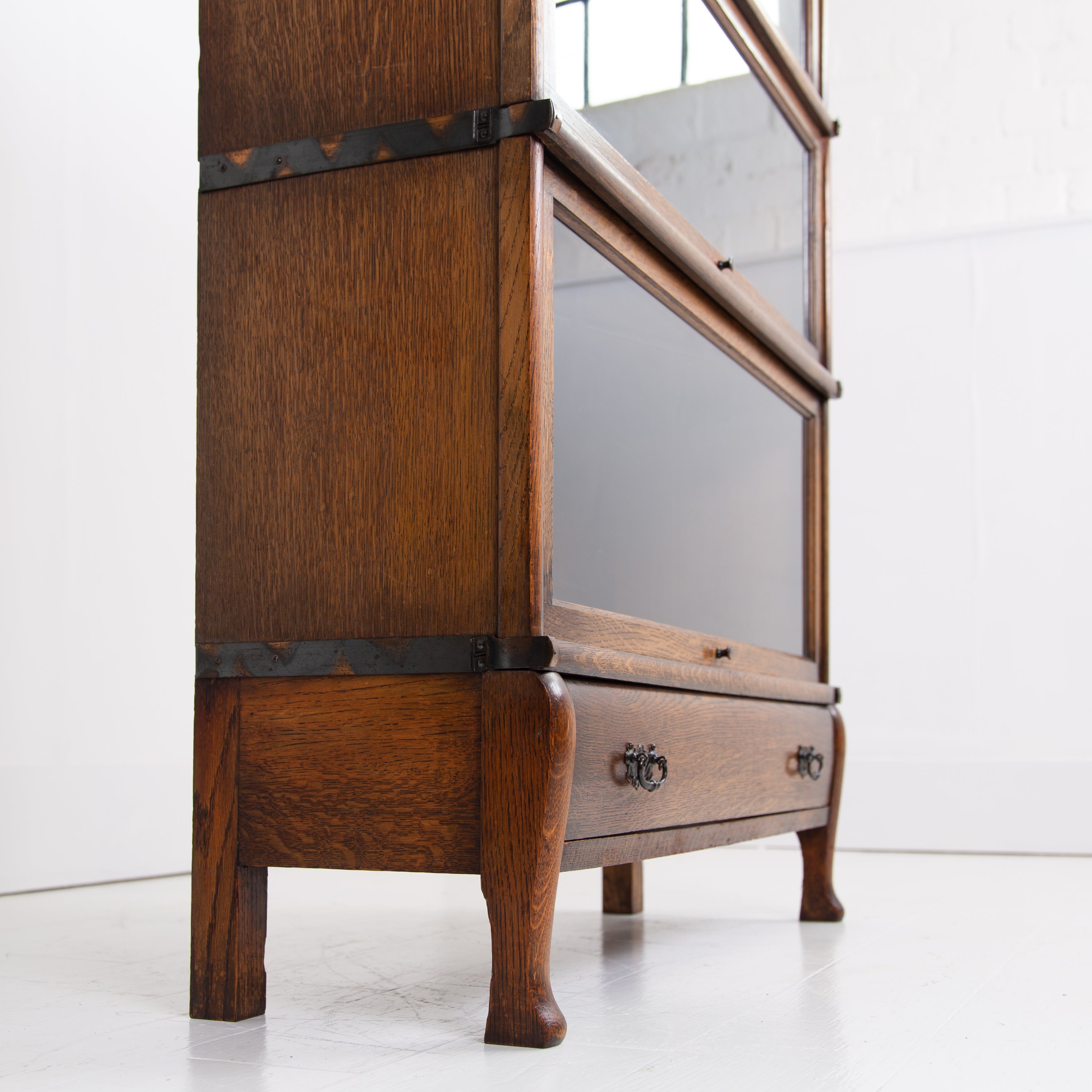 A good looking Globe Wernicke oak bookcase with the addition of a bottom drawer and perching off the floor on attractive little legs. We have makers transfer stamp to the inside, this one being a lesser seen model and type.
