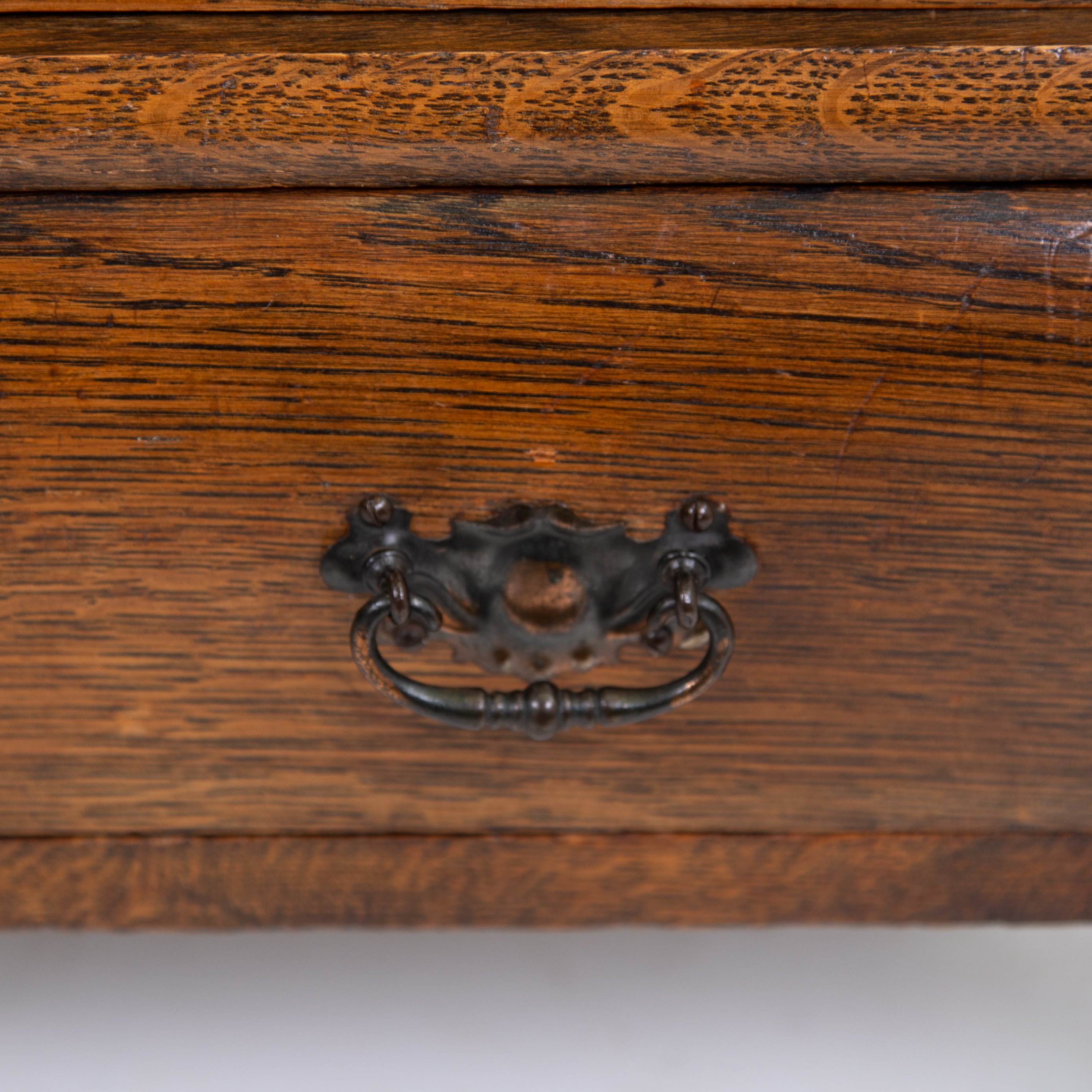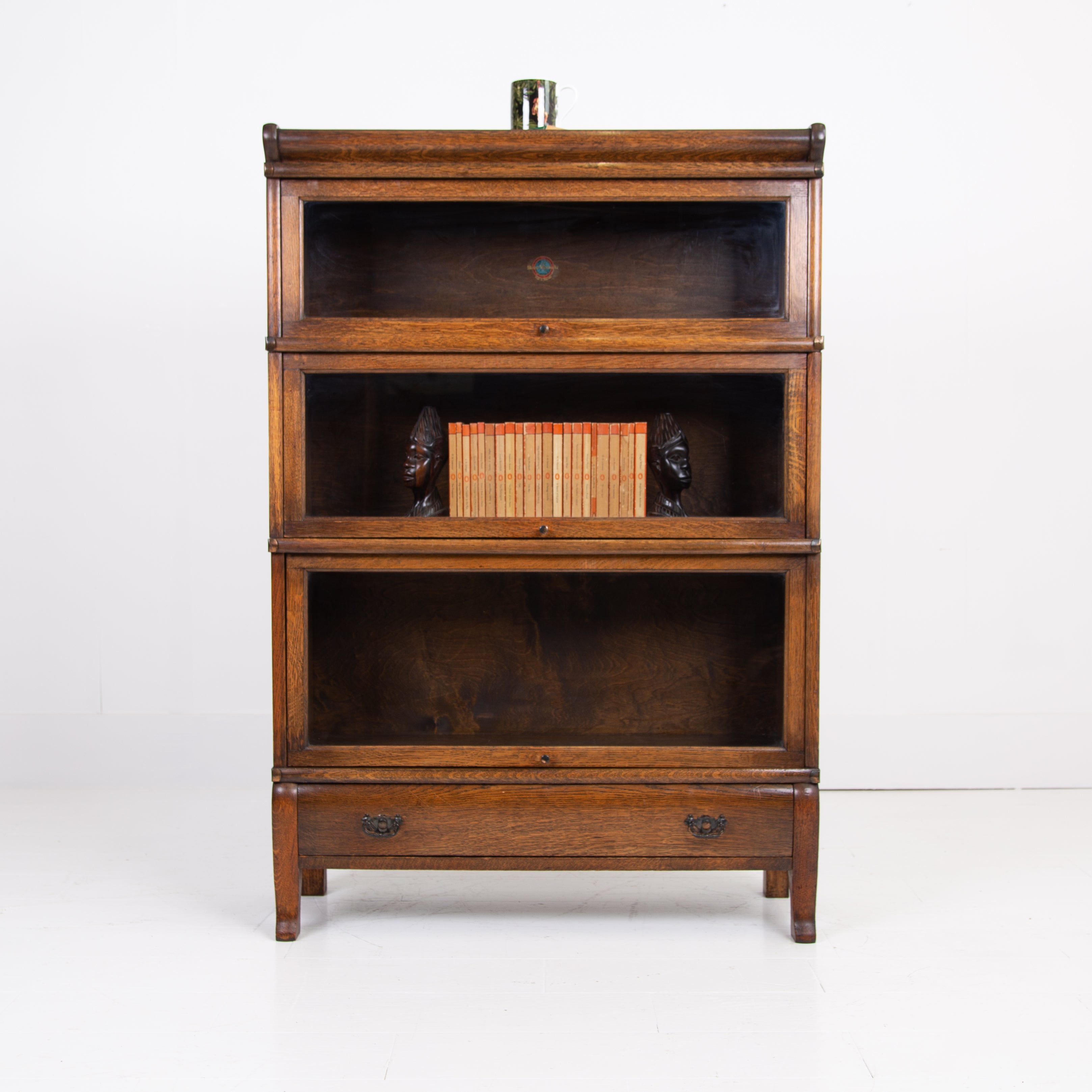 This Globe Wernicke sits well and survives in good order with sensible aging. All the glass is crack free, the little brass knobs are in place as are the original handles for the little drawer. We have carefully cleaned the piece and lubricated the door opening mechanisms so it's all good to go. Expect a good piece with historic aging. It breaks down for easier placing.