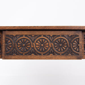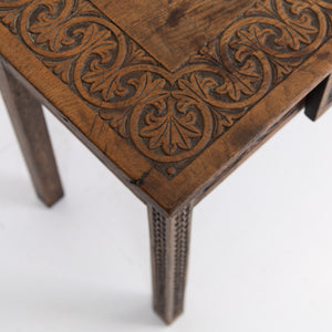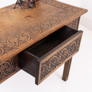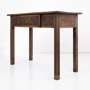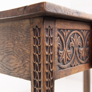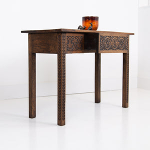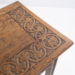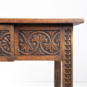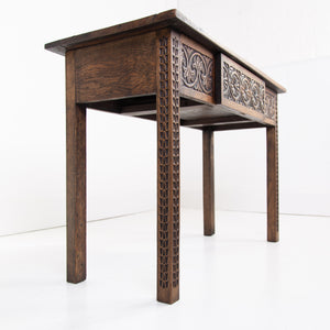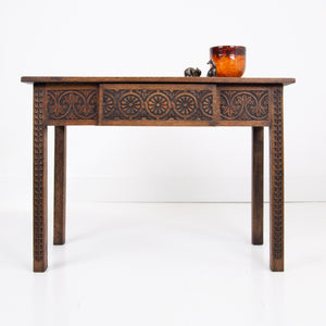 A great looking chip carved oak side table with drawer C1900, it’s a good scale for a hall, living room or maybe a desk.