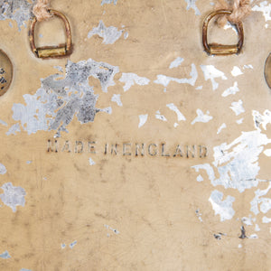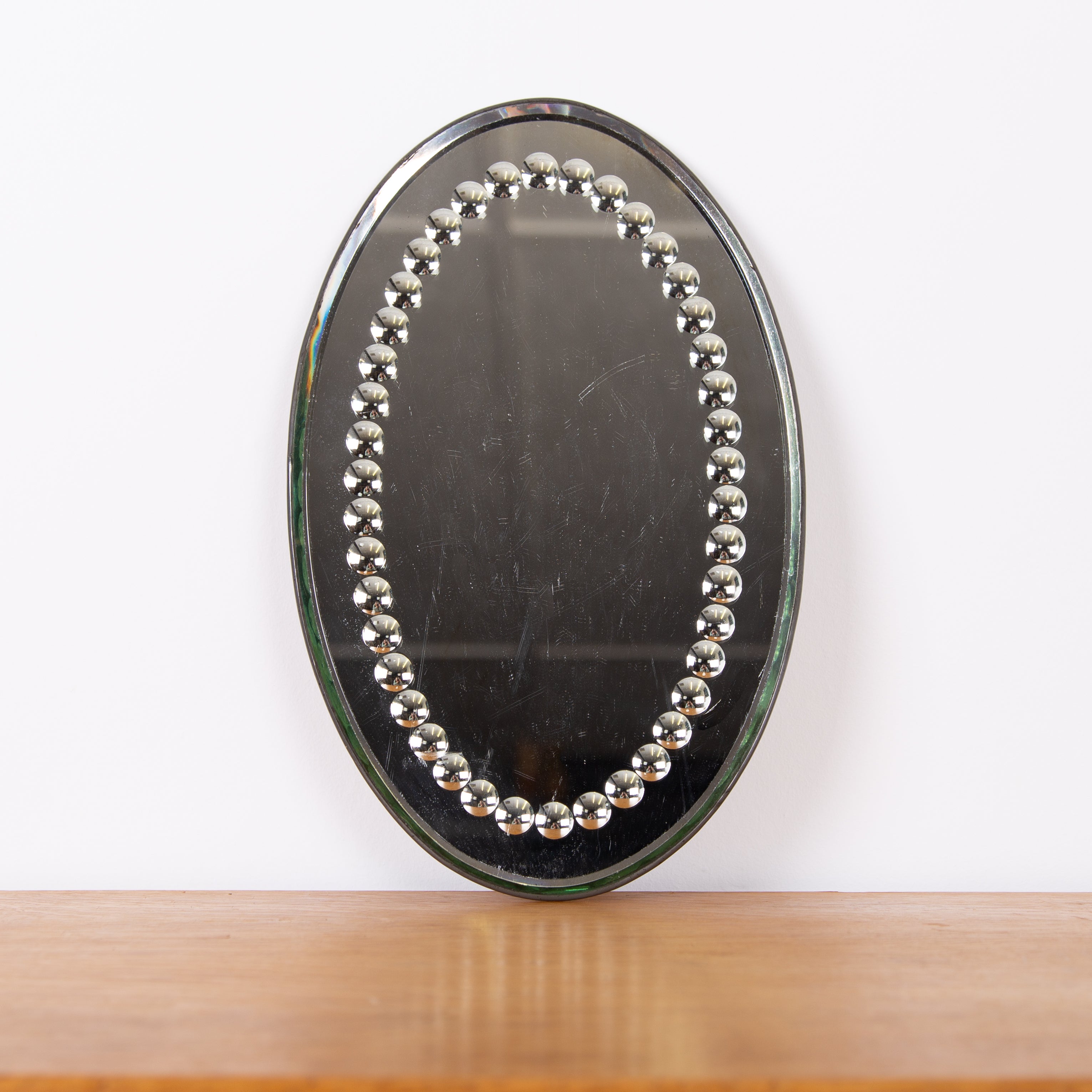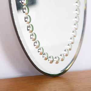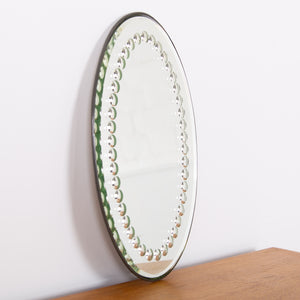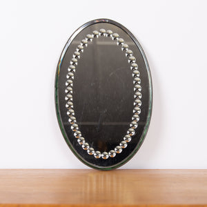 A delightful early 20th century oval sorcerer's mirror with decorative bevelled edge. The back is painted tin lined with Made In England impressed into its rear. Raised on four pressed feet the mirror can be wall mounted or used as a table centrepiece which ever you desire.