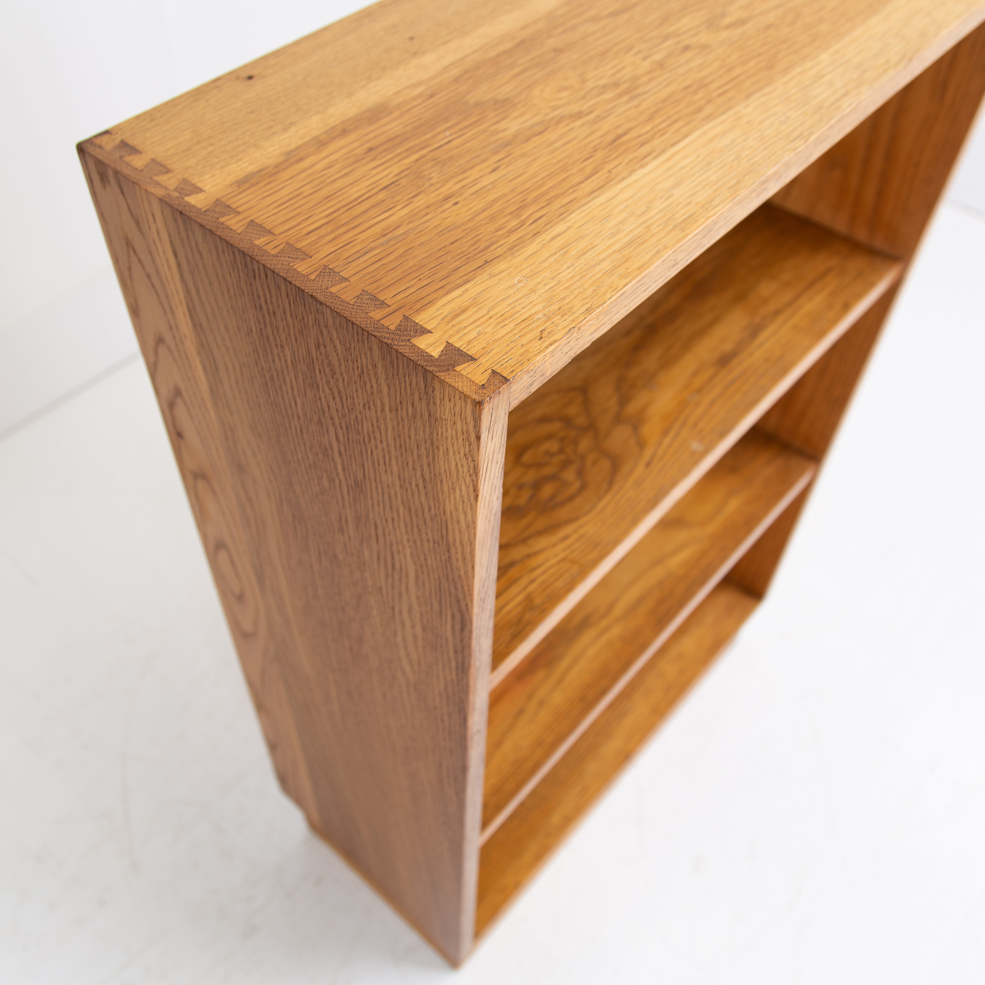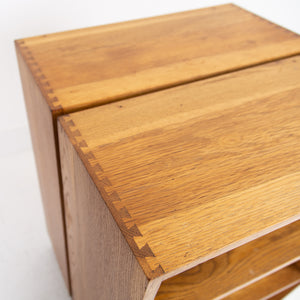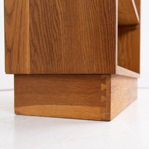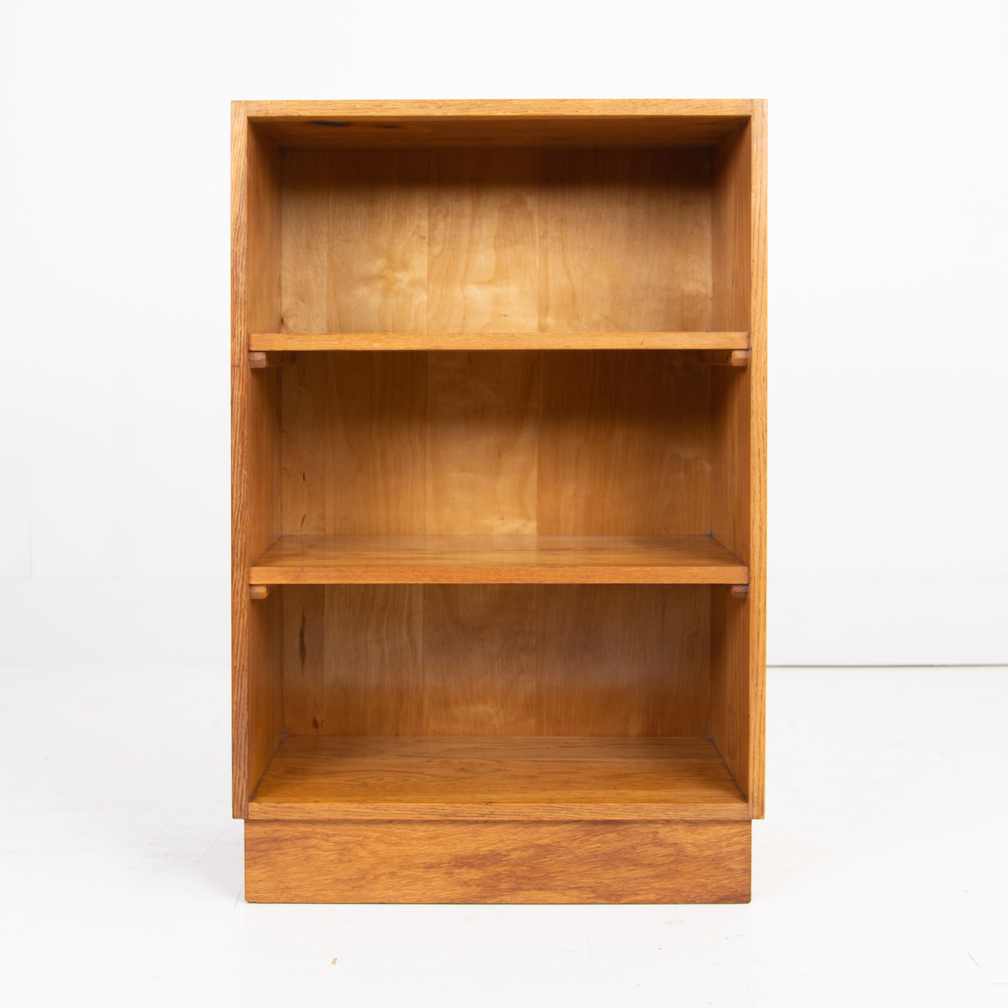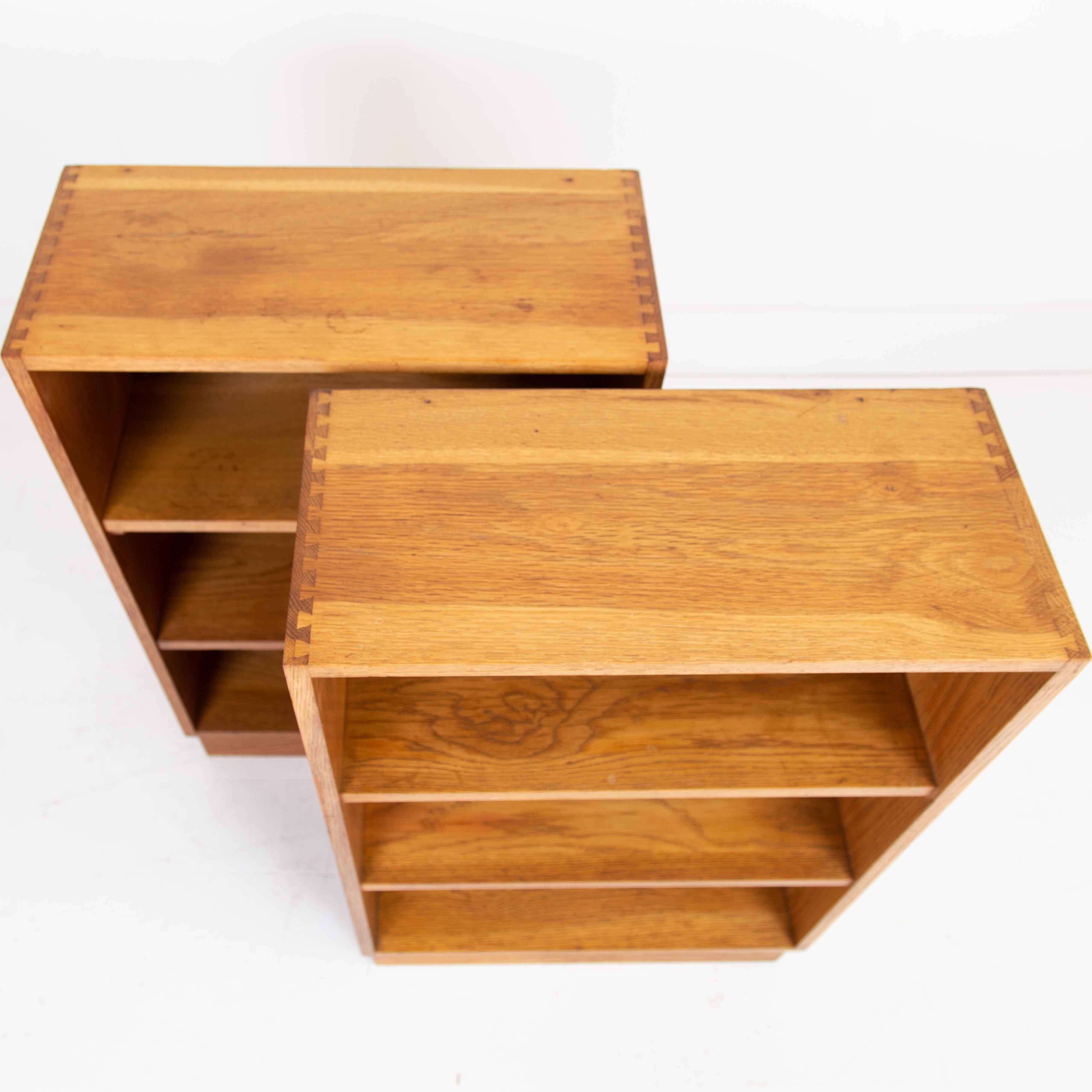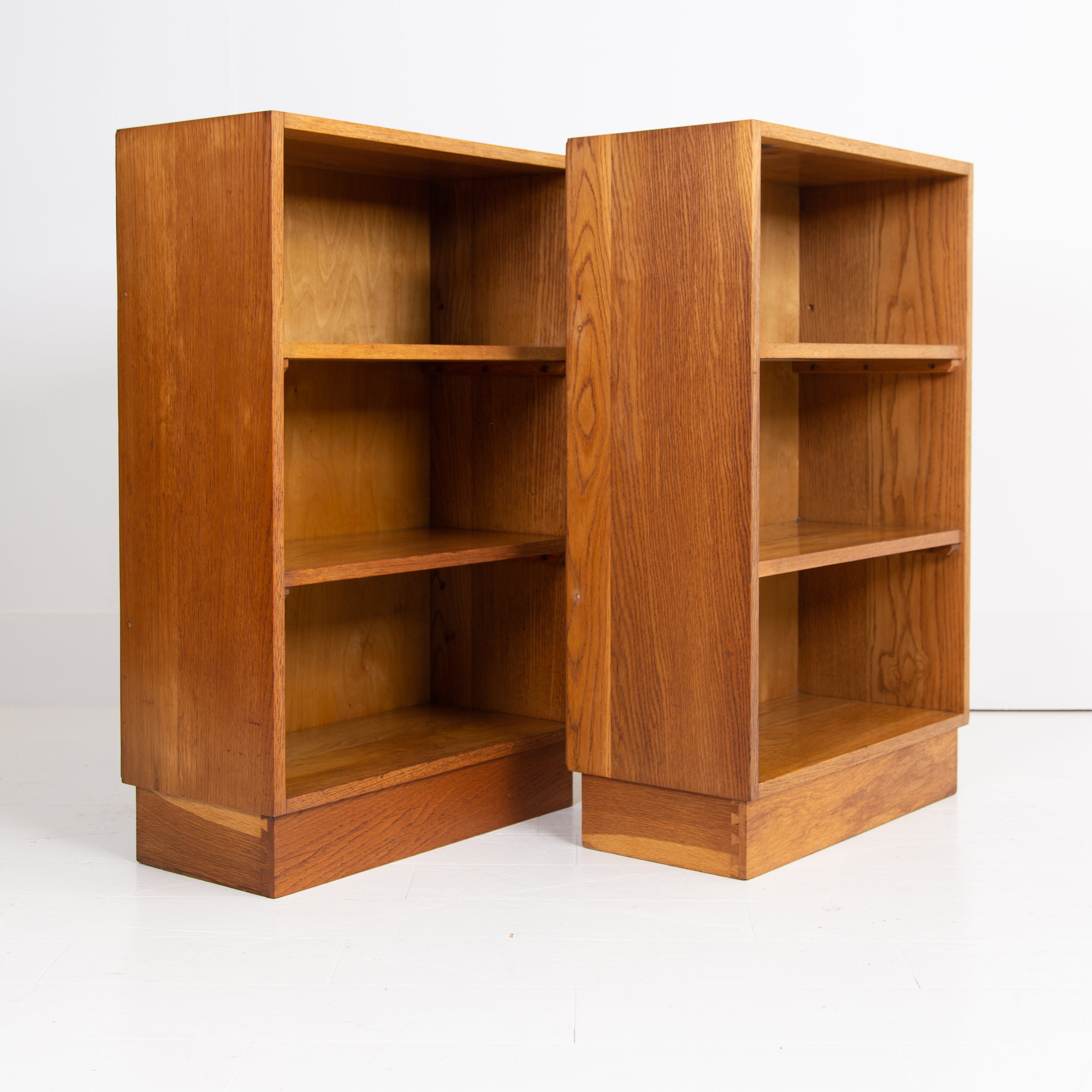 Great looking and slightly military issue in appearance pair of matching oak bookcases C1950. Liking the look of these modernist designed bookcases with the finger joints in the oak at the top, mimicked in the inverted bases - they possess a simple and effortless look.