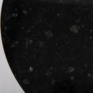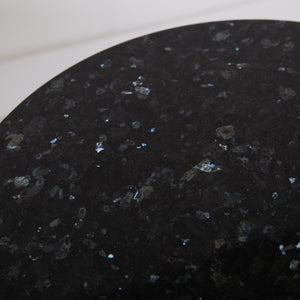 We have a well sized matching pair of mid century tulip shaped bases with marble tops which would work well as side tables. Both bases are stamped Arkana 22 denoting the maker and size underneath the bases and the black with blue mottled granite tops are a new addition and work well.