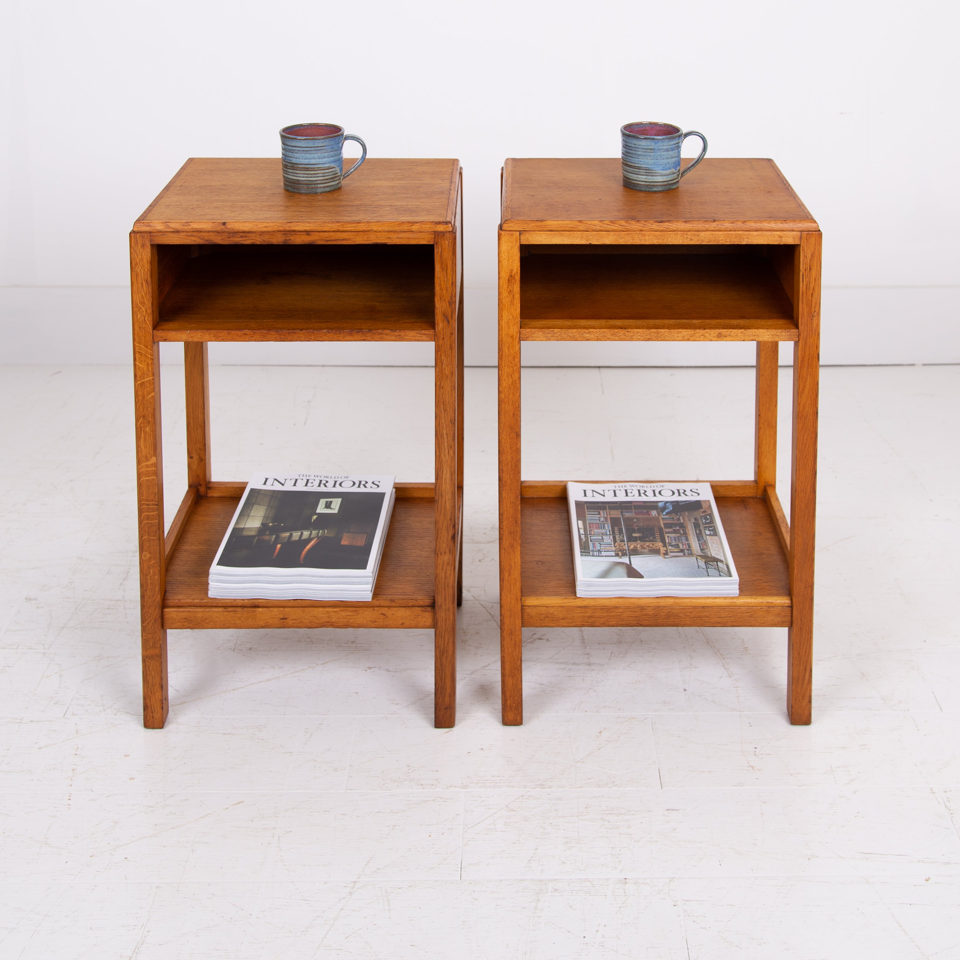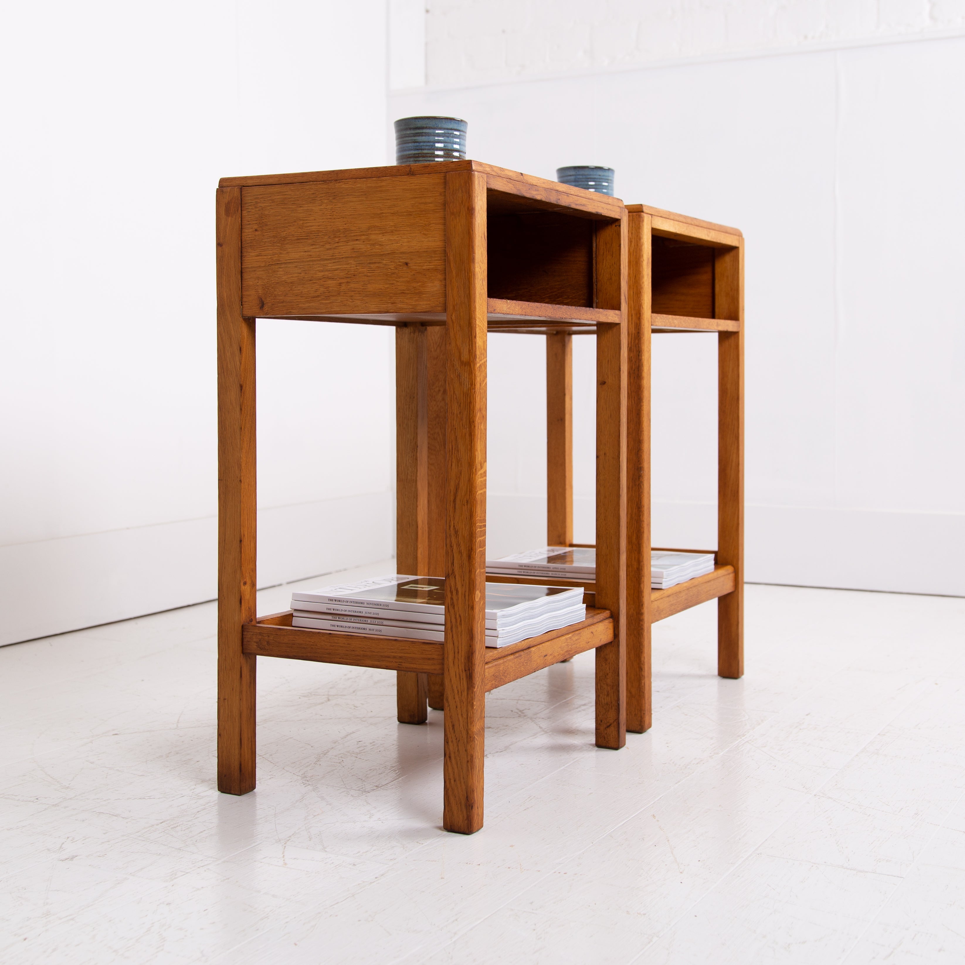 Very much in the Cotswold school style, we have a matching pair of lighter English oak side tables/cabinets which work well in so many spaces. As mentioned the design is very much Gordon Russell with simple, easy on the eye design, well shaped and grained legs, a little “cubby hole” for books and the like and a lower shelf.