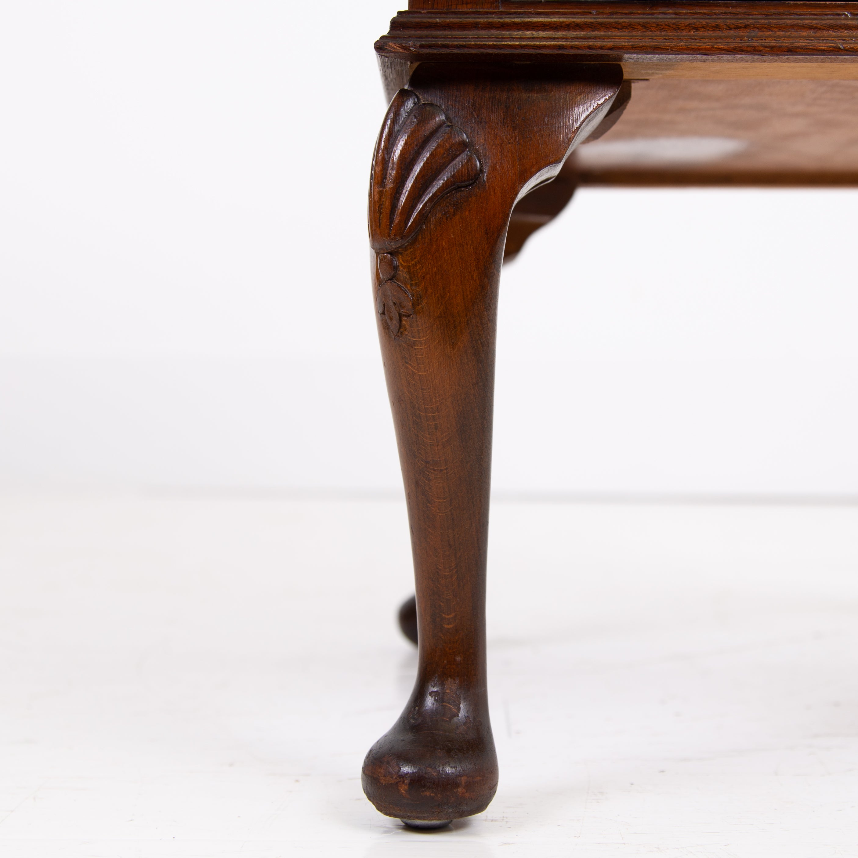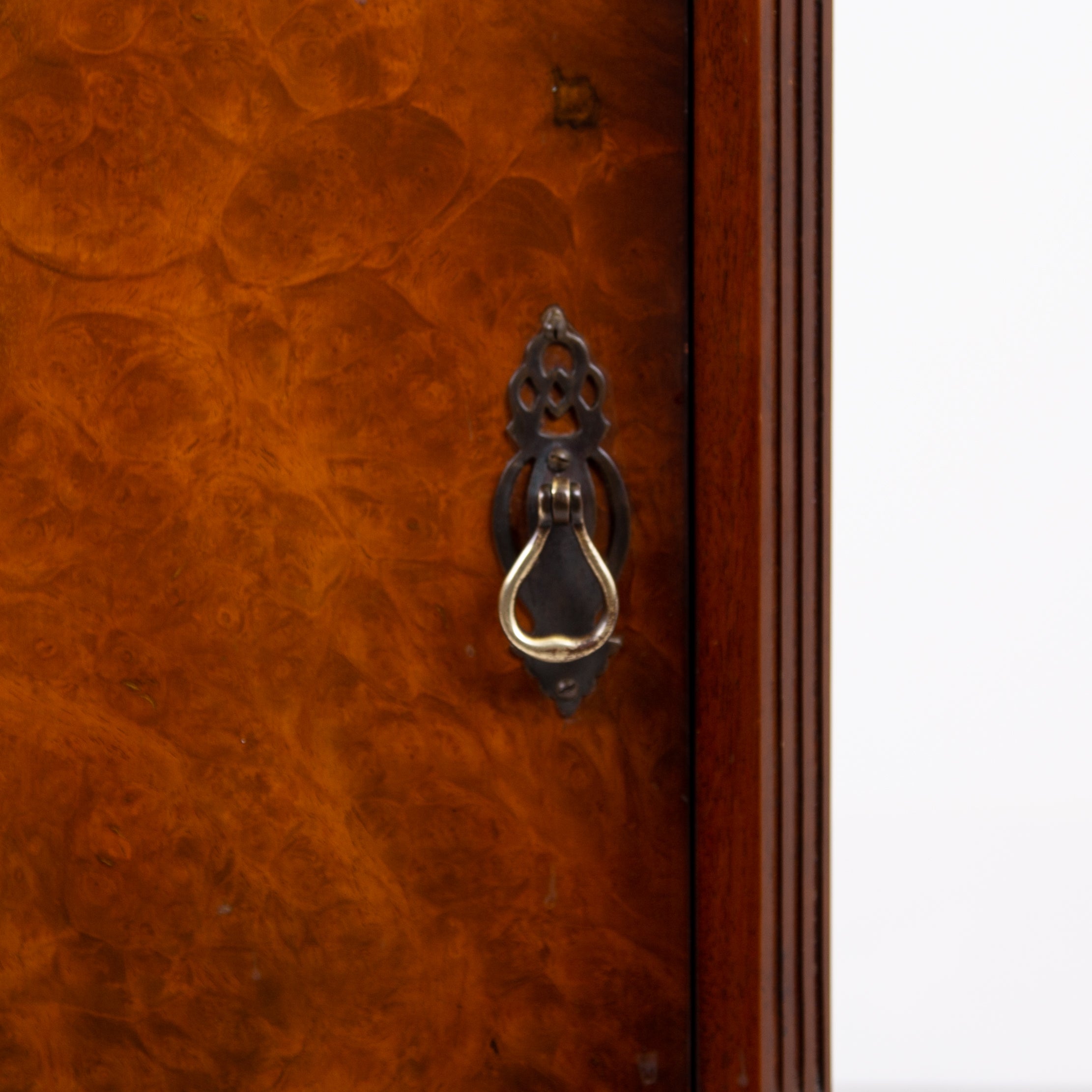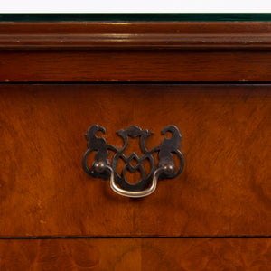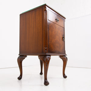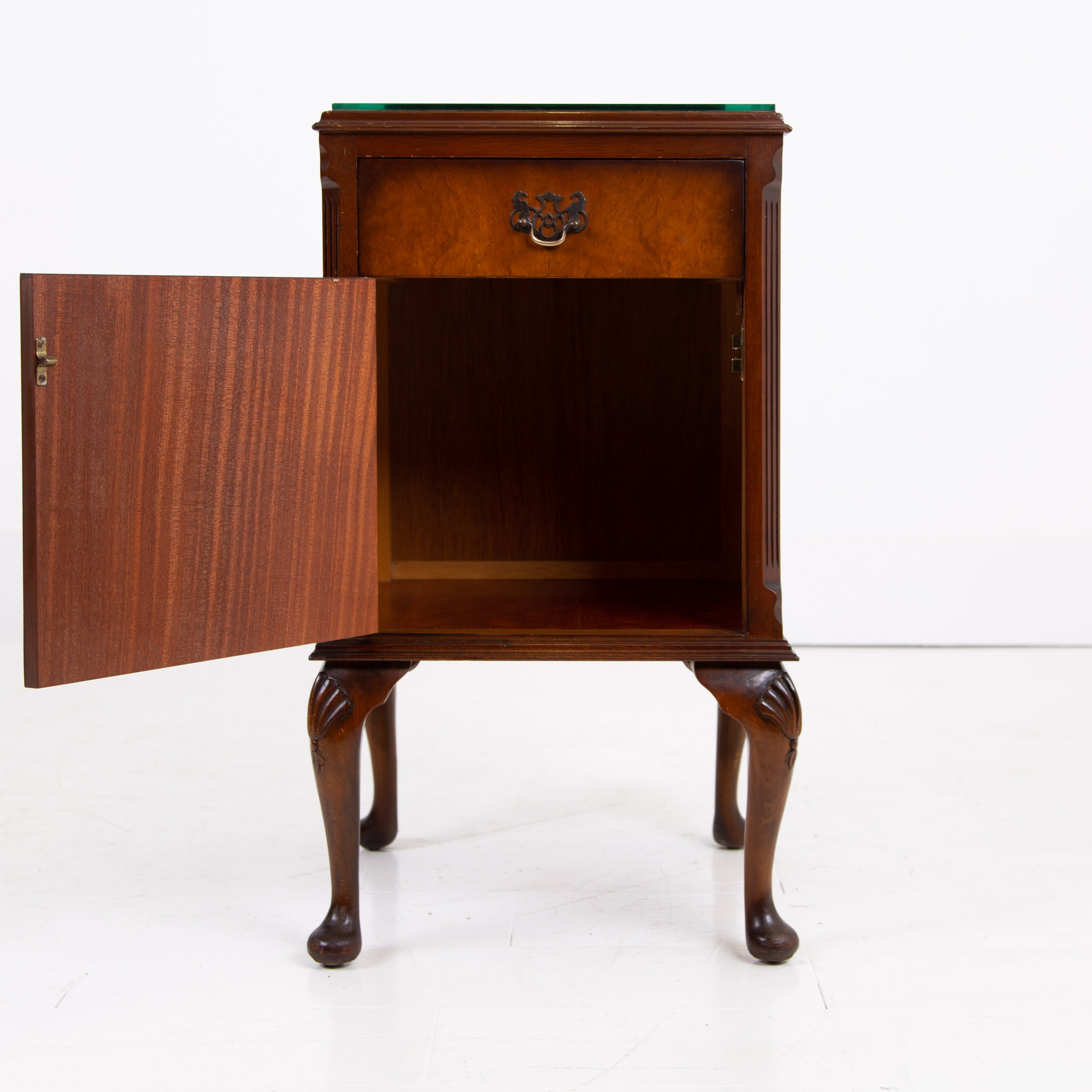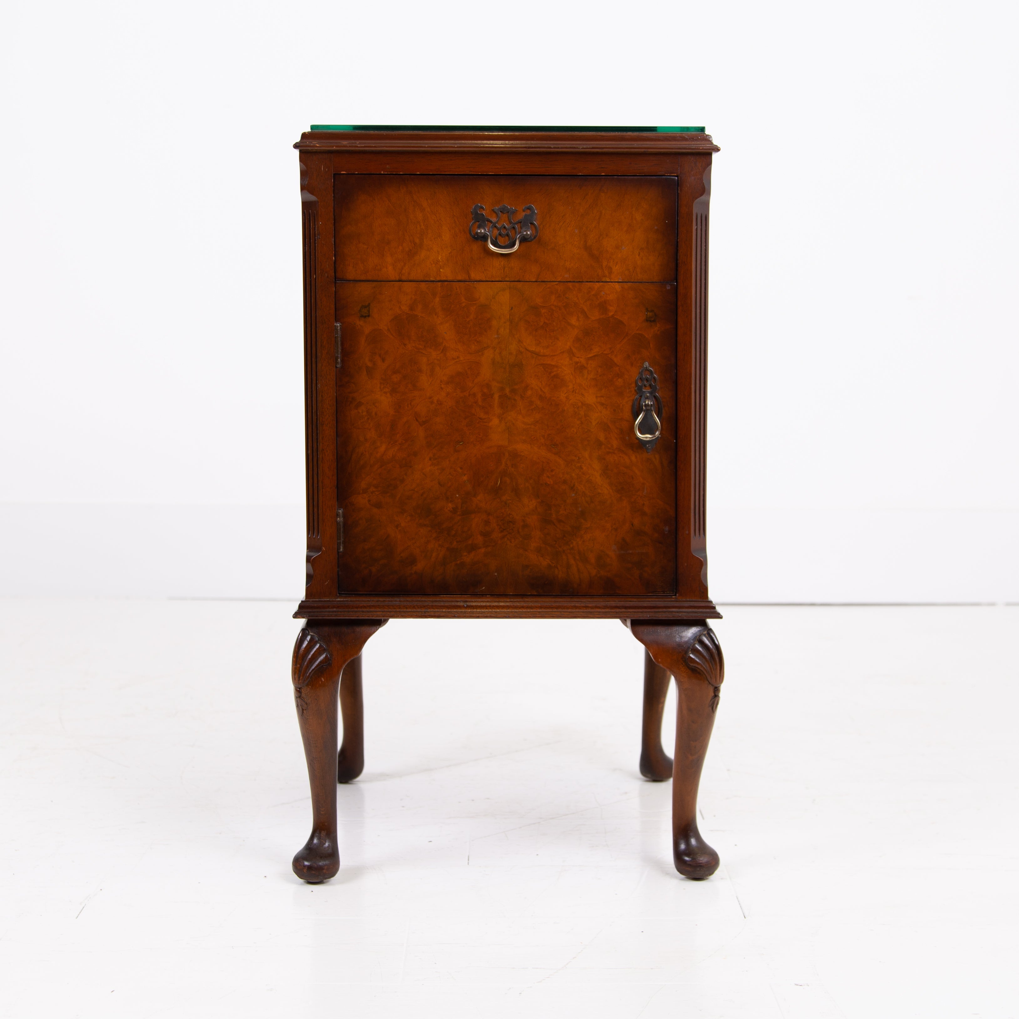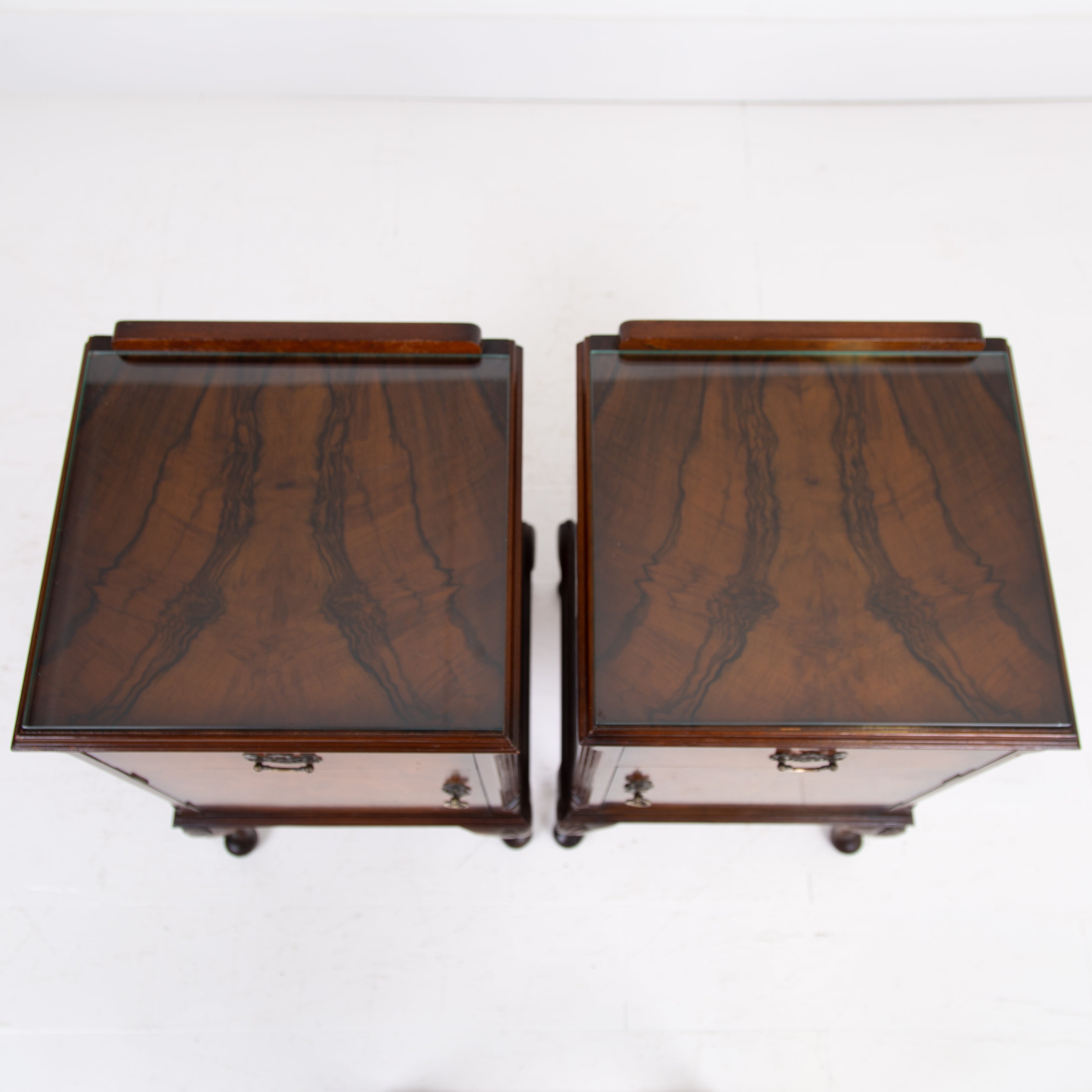 They are of good quality and are of a very useful size. The walnut is figured with interesting grain patterns and a lovely tone. They sit on short cabriole legs with shell carving at the knees to the front legs, the front edges are canted and they have raised back galleries. There is plenty of storage space inside the cabinets and drawers, which have lovely pierced brass handles. The tops have glass covers. Condition is good, expect light day to day use and marks.