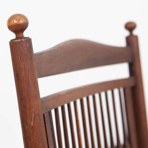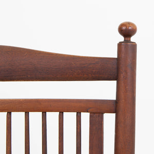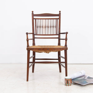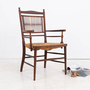 This one sits well with some lovely turning to the frame and spindles - the chair is nicely worn, especially the arms and we would assume the rush seat was redone at some point and is firm and good for sitting on. We have B6 stamped underneath.