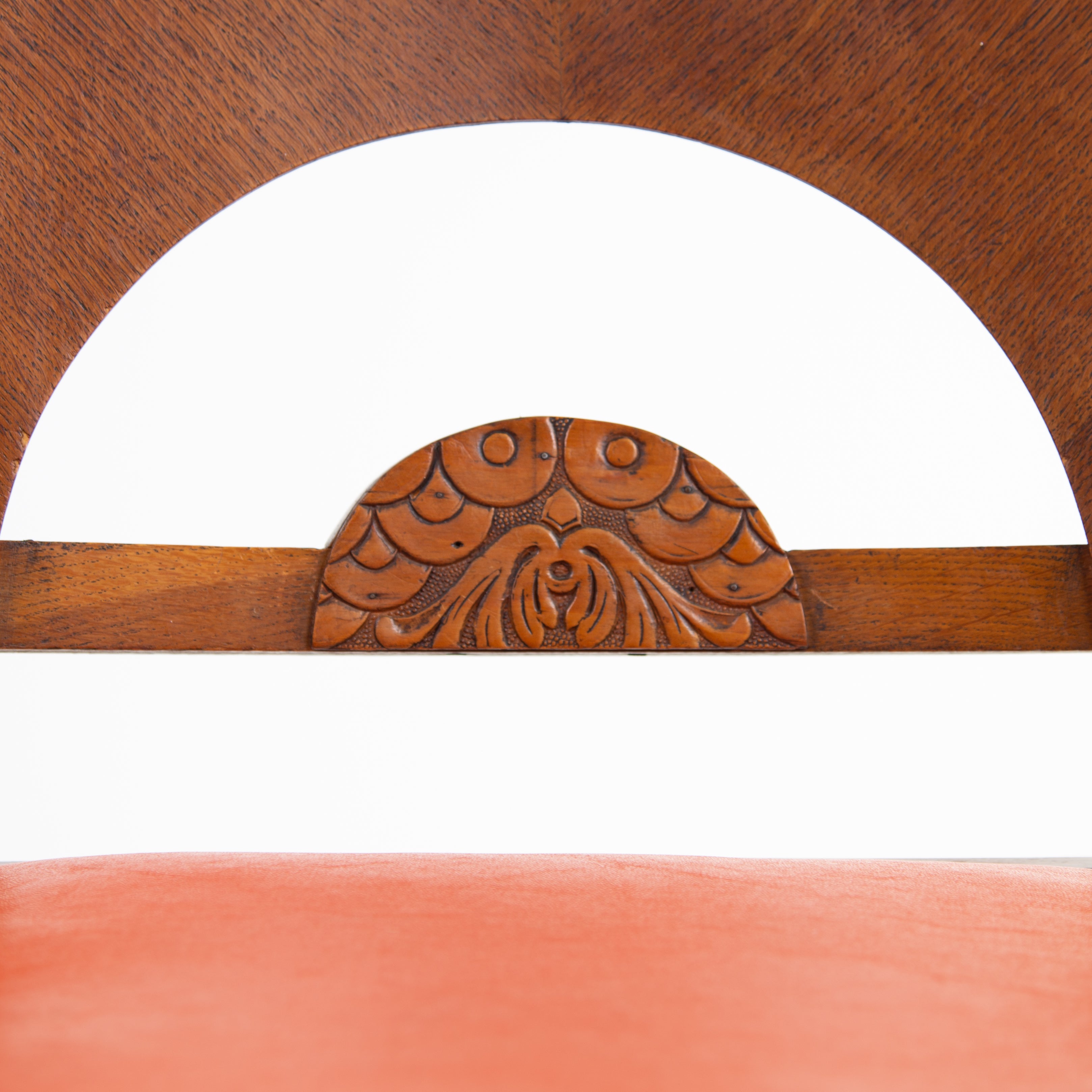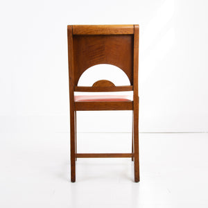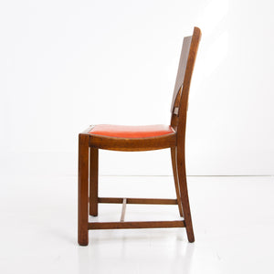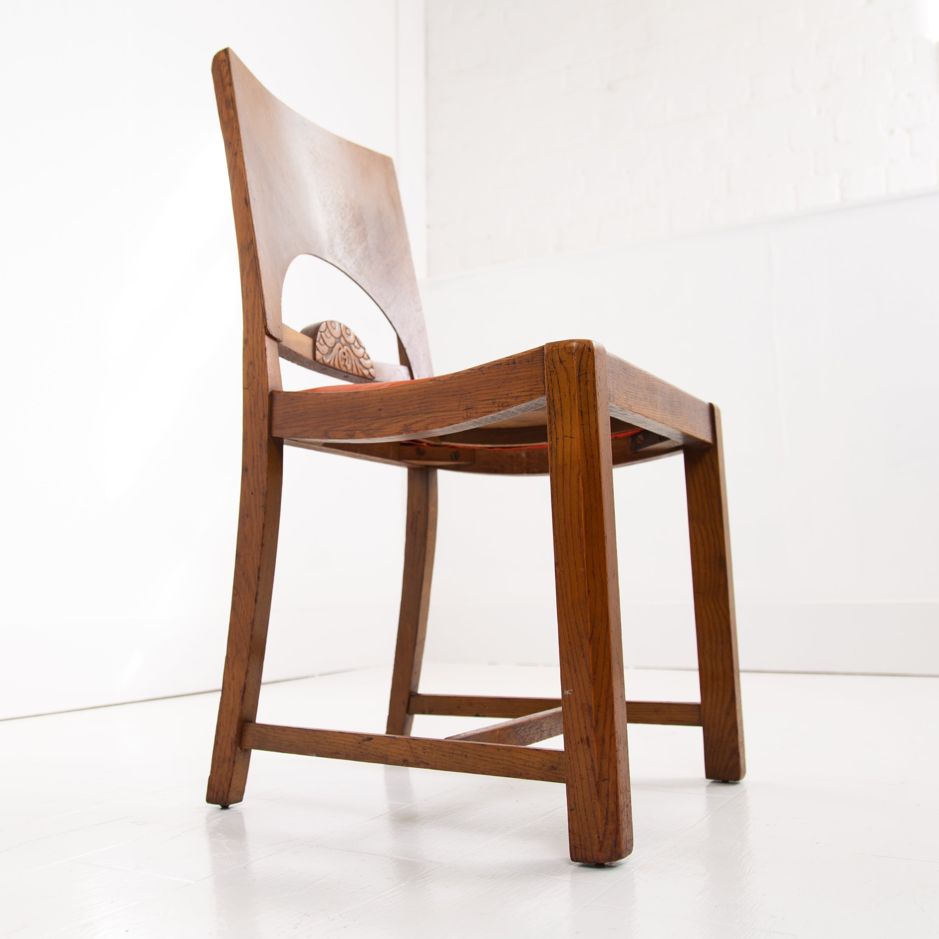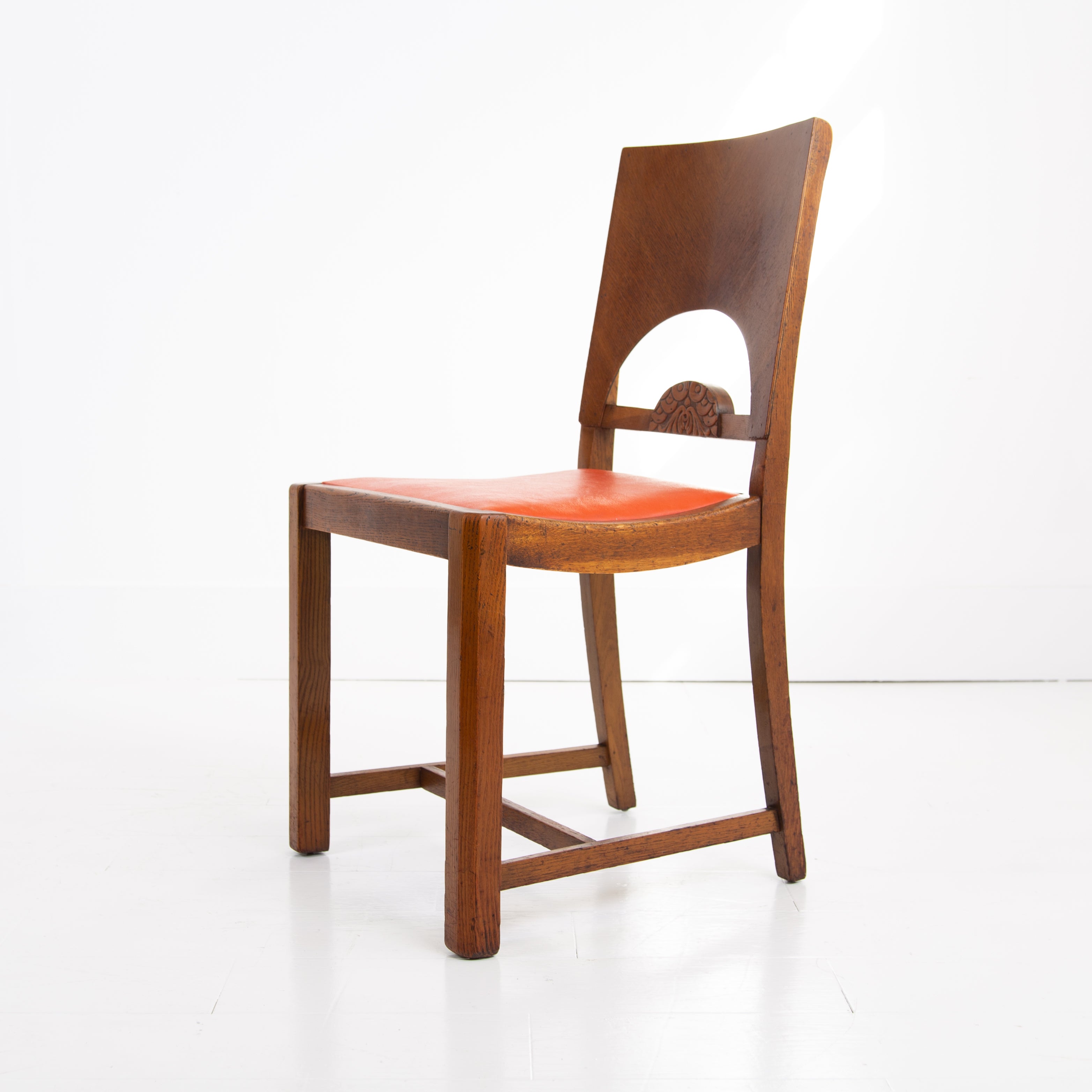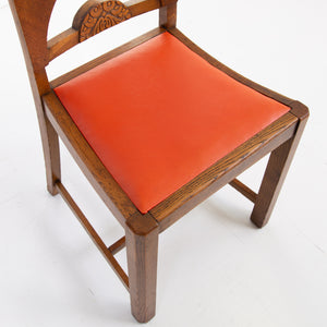 The set has been carefully cleaned and currently sits with the original tomato red coloured faux leather drop in seats. Mark our upholsterer could reupholster the seats including new filling at a cost of £300 plus VAT. You would require around 3 metres of fabric which we can assist in sourcing and providing sample swatches etc. Condition is good, one has a little piece of the decorative motif missing, otherwise expect sensible and pleasing day to day wear to the well shaped frames. Ready to place and use.