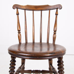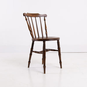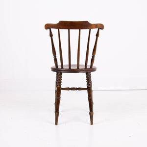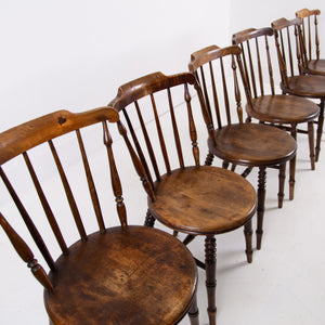 This is a good quality set of 6 Swedish Ibex solid beech stick back kitchen chairs, circa 1915 in nice original condition. The chairs incorporate a shaped top rail with six turned spindle (ring turned outer spindles) back, on a circular comfortable moulded seat, raised on ring turned legs. The legs are united by “H” beech stretchers, which makes them a firm utility chair, ideal for daily use in the kitchen. Worth noting 1 is slightly different in design but not a big deal. These have been lightly clean and waxed in our workshop retaining historic wear.