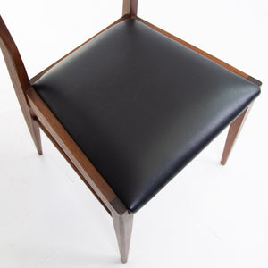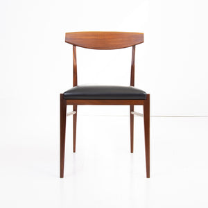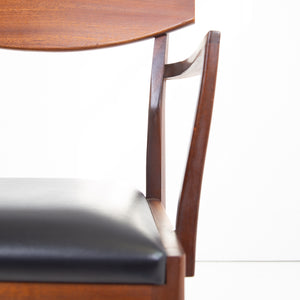 The set sits, as mentioned, in very fine order - we have a good strong tone to the teak, all chairs are strong in structure with no repairs, just a few day to day historic marks. Our workshop has checked the chairs over and ensured they are ready to place in the home. The black grained vinyl is free of cracks or holes and to be honest looks like the perfect match to the teak, however Mark our upholsterer can offer new seats at the price of £45 per seat plus VAT. You would require approx 3 metres of fabric which we are happy to assist in sourcing. Please let us know when purchasing.
