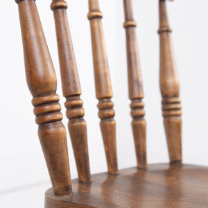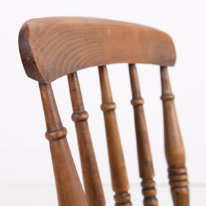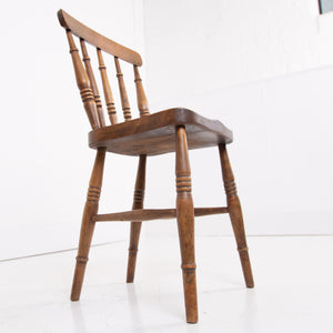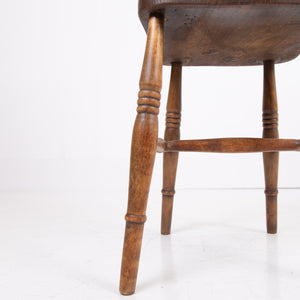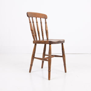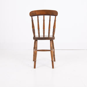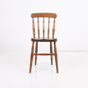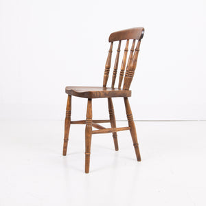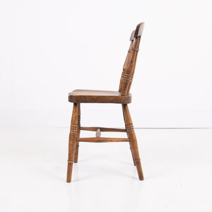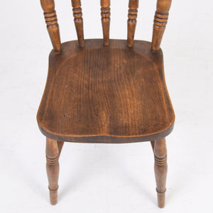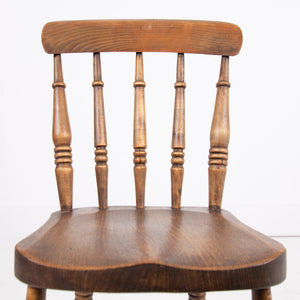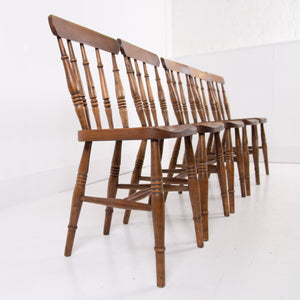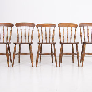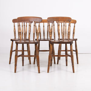 We have a set of 5 elm seated stick back kitchen dining chairs. The chairs are of a classic design and traditionally made having a broad curved top rail and spindle back with turned decoration of the side supports. There are thick elm saddle seats and well turned legs below joined by an H stretcher.