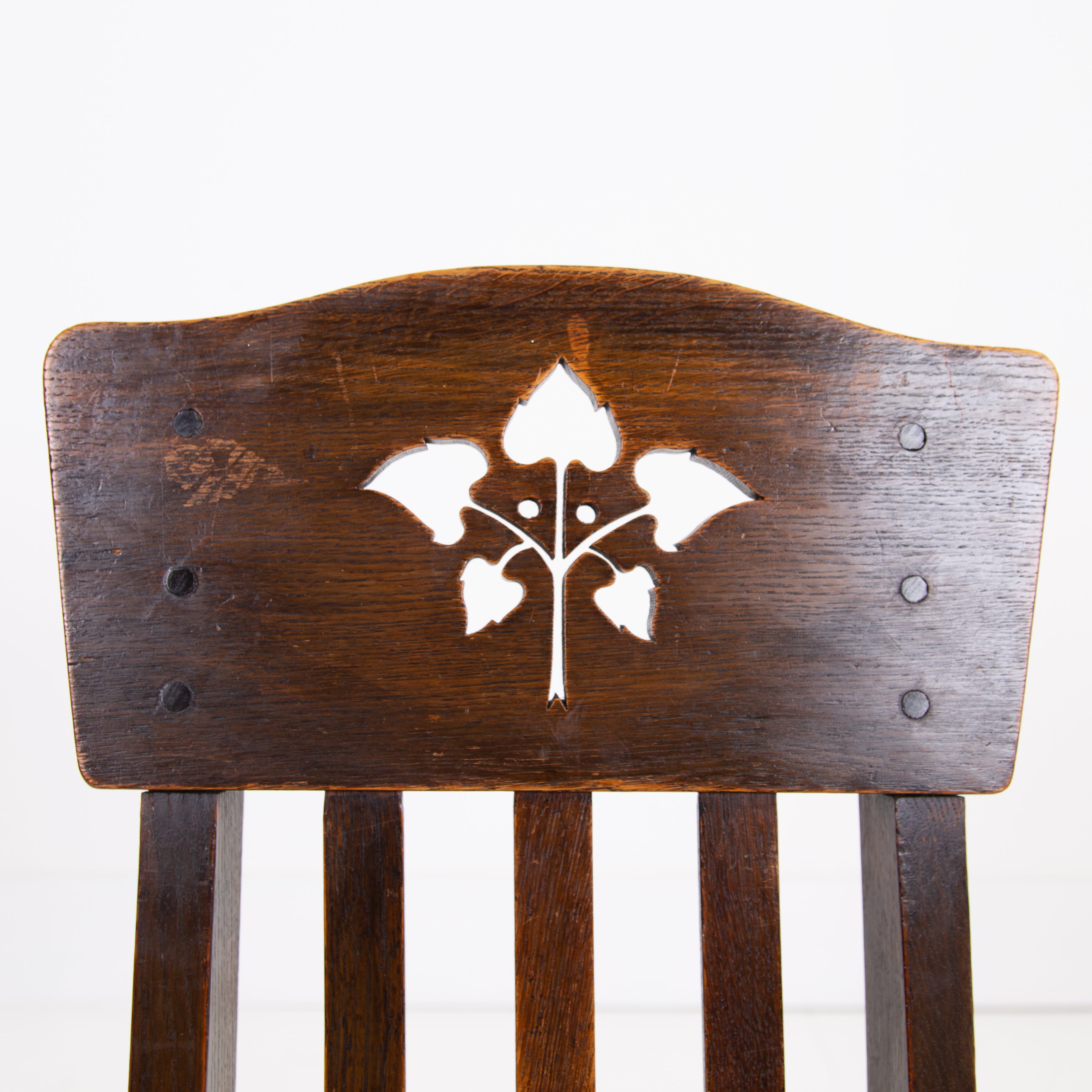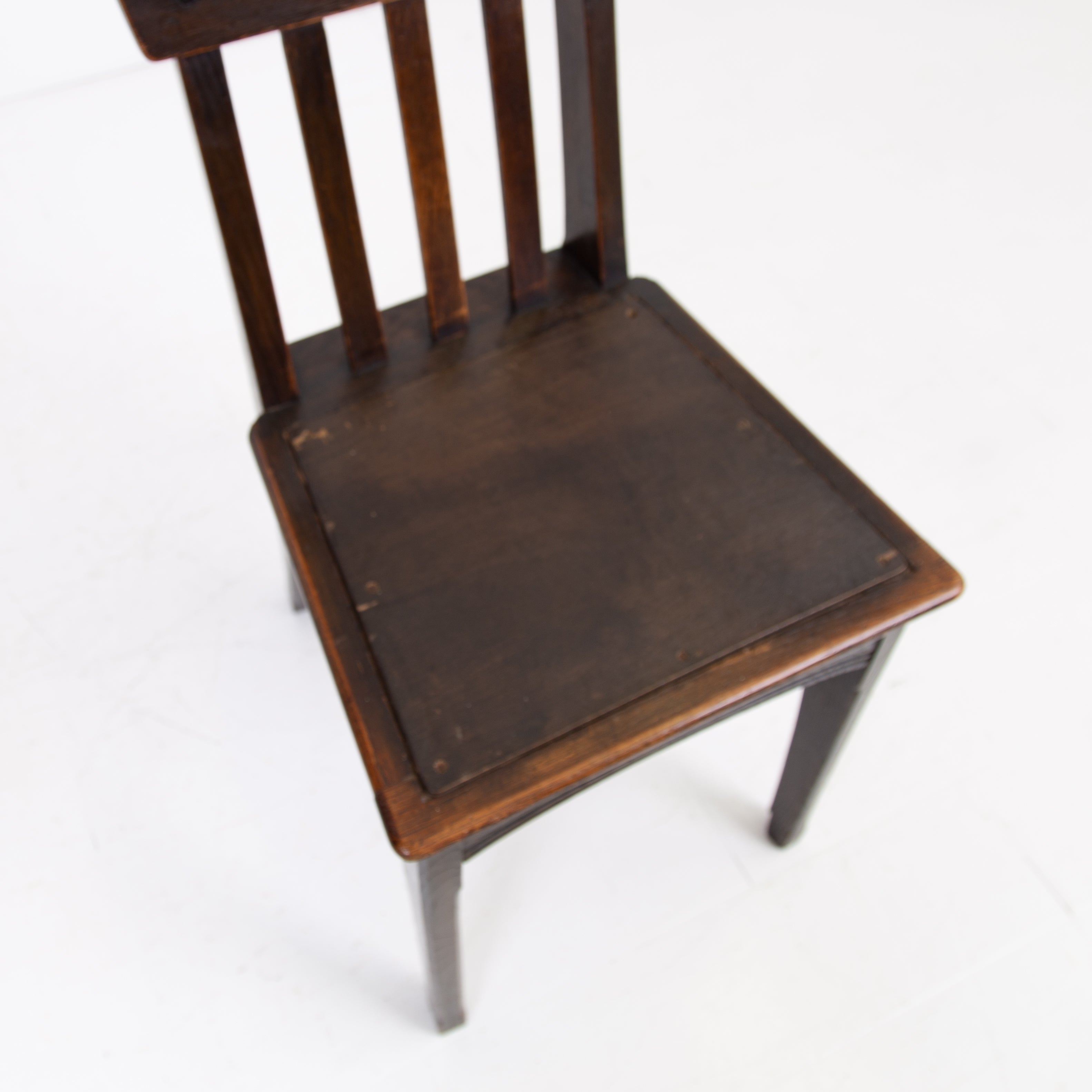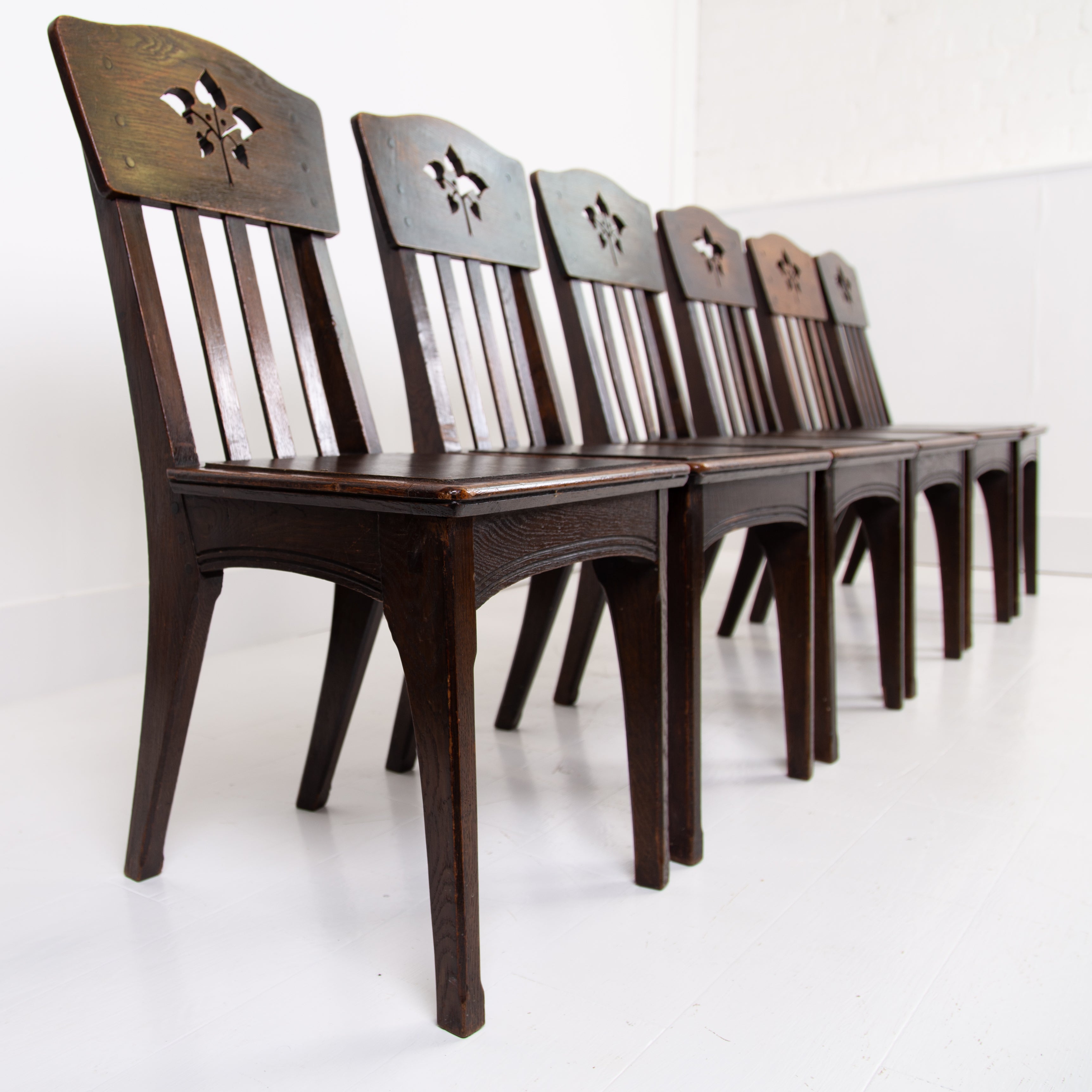 The chairs sit in their original oak finish, have not been stripped like some, showing some historic wear to the frames with pieces of the central motif missing on some. All chairs are firm and the seats are wood replacements which you could cover if required. Our upholsterer Mark would be able to add a plump seat in leather or fabric at a cost of £75 plus VAT per chair plus fabric if required and we have access to good leather and fabric if also required.