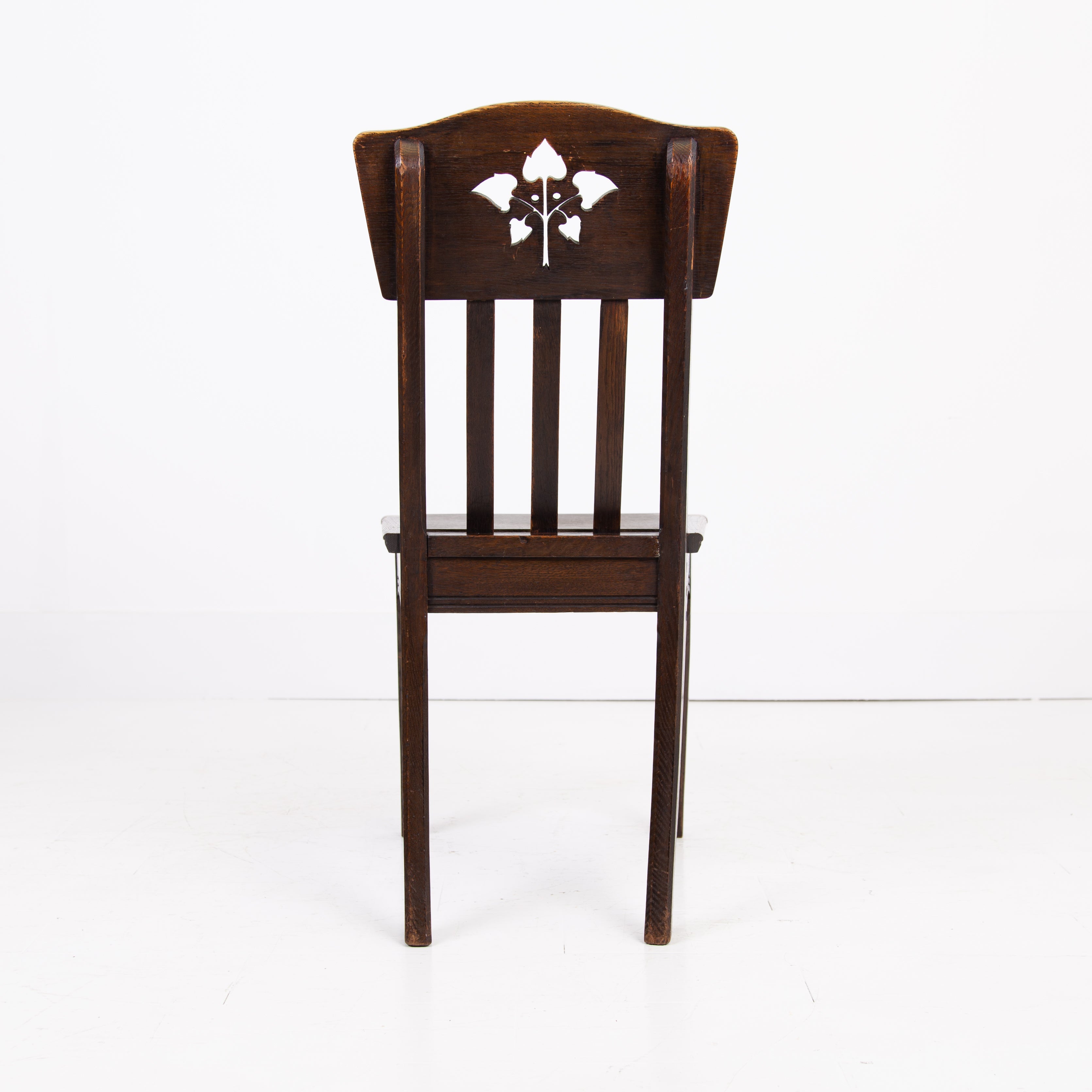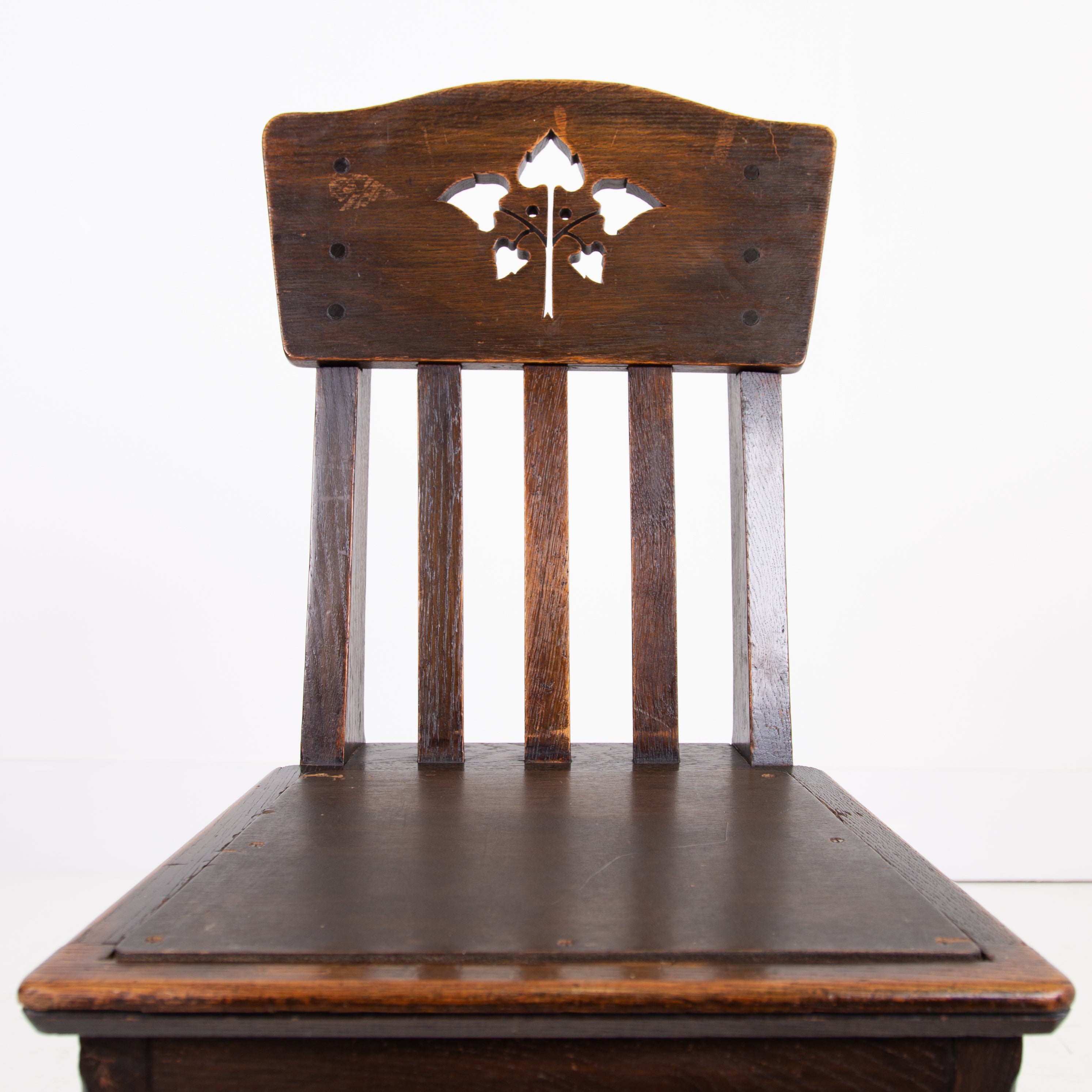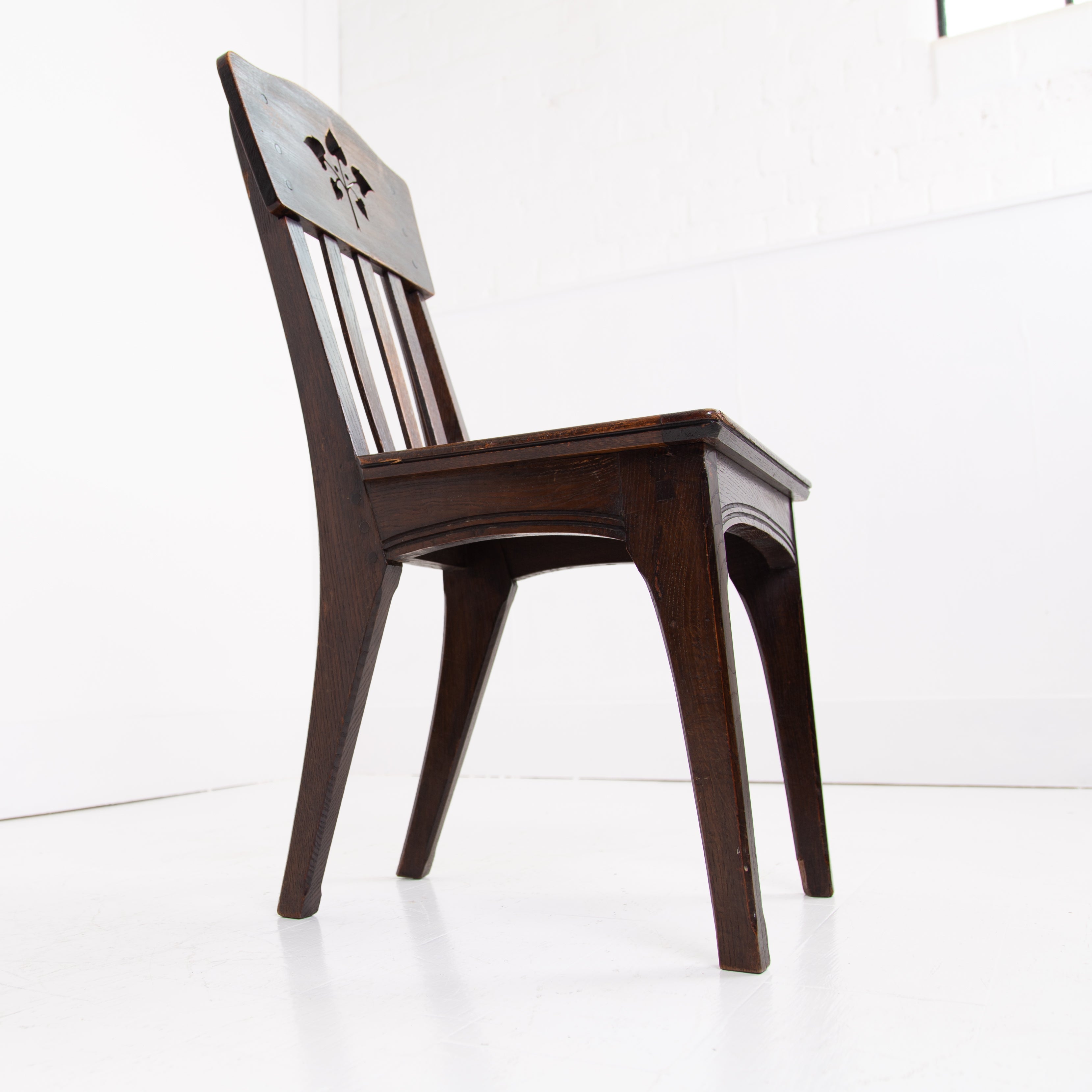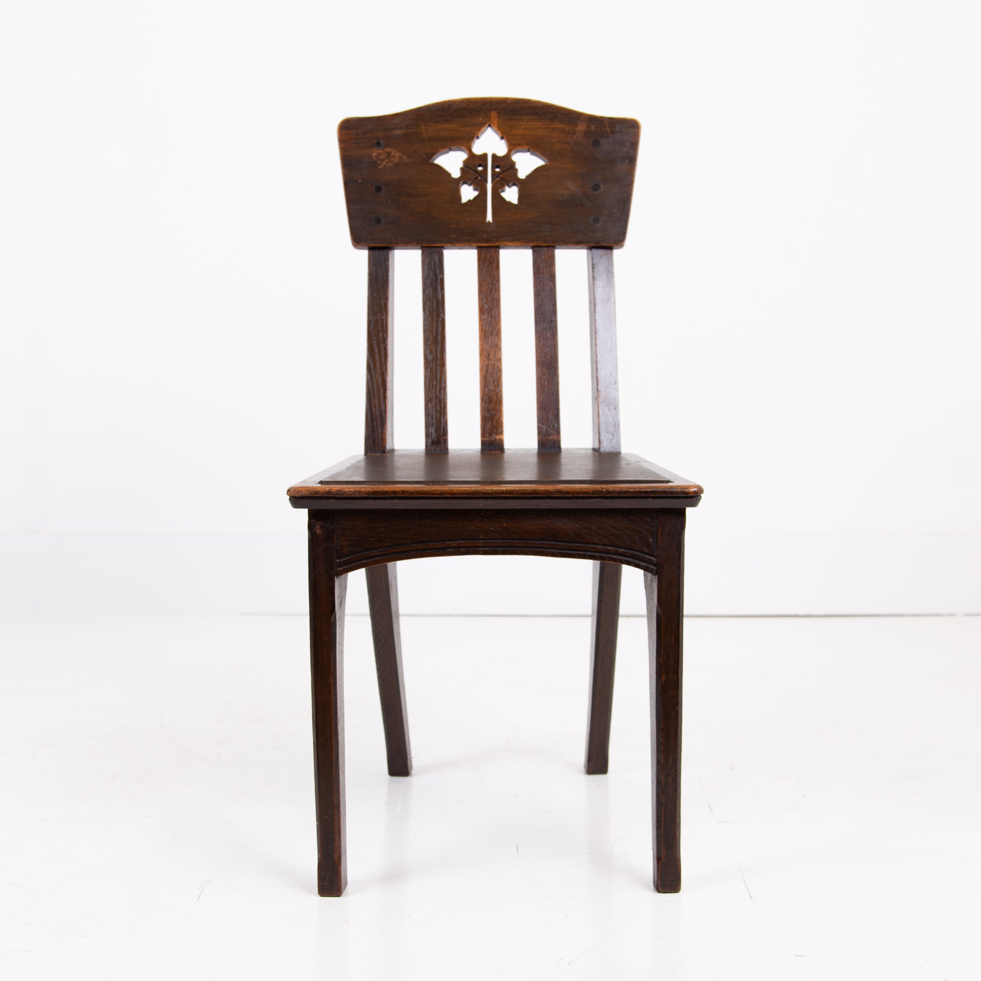 The chairs sit in their original oak finish, have not been stripped like some, showing some historic wear to the frames with pieces of the central motif missing on some. All chairs are firm and the seats are wood replacements which you could cover if required. Our upholsterer Mark would be able to add a plump seat in leather or fabric at a cost of £75 plus VAT per chair plus fabric if required and we have access to good leather and fabric if also required.