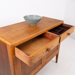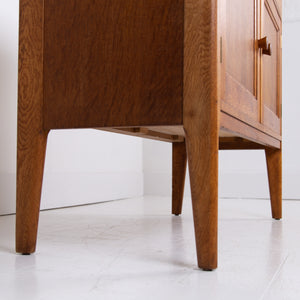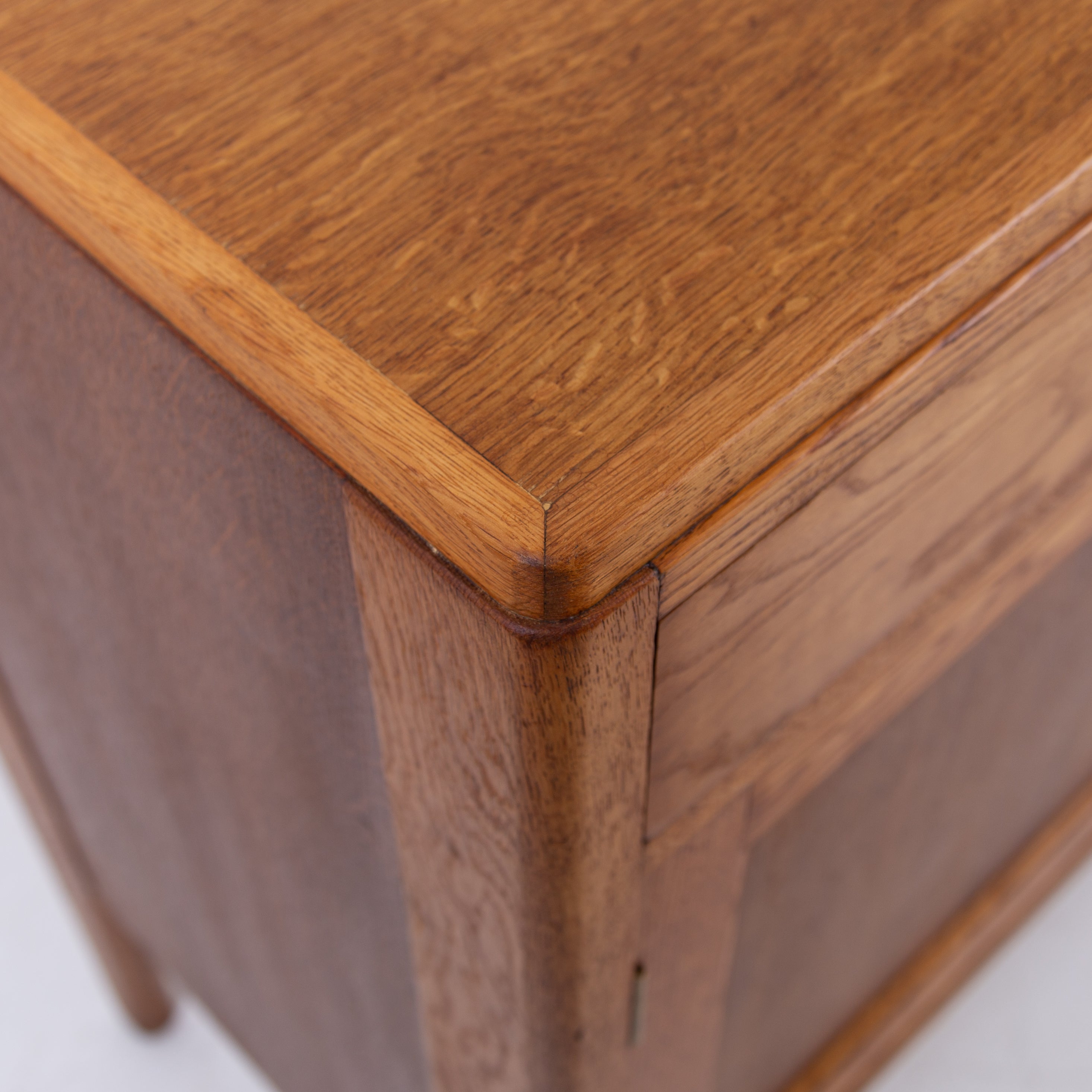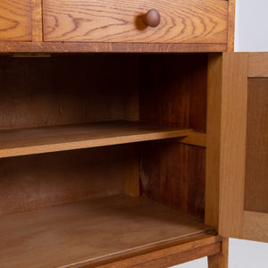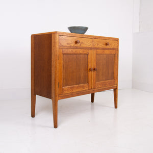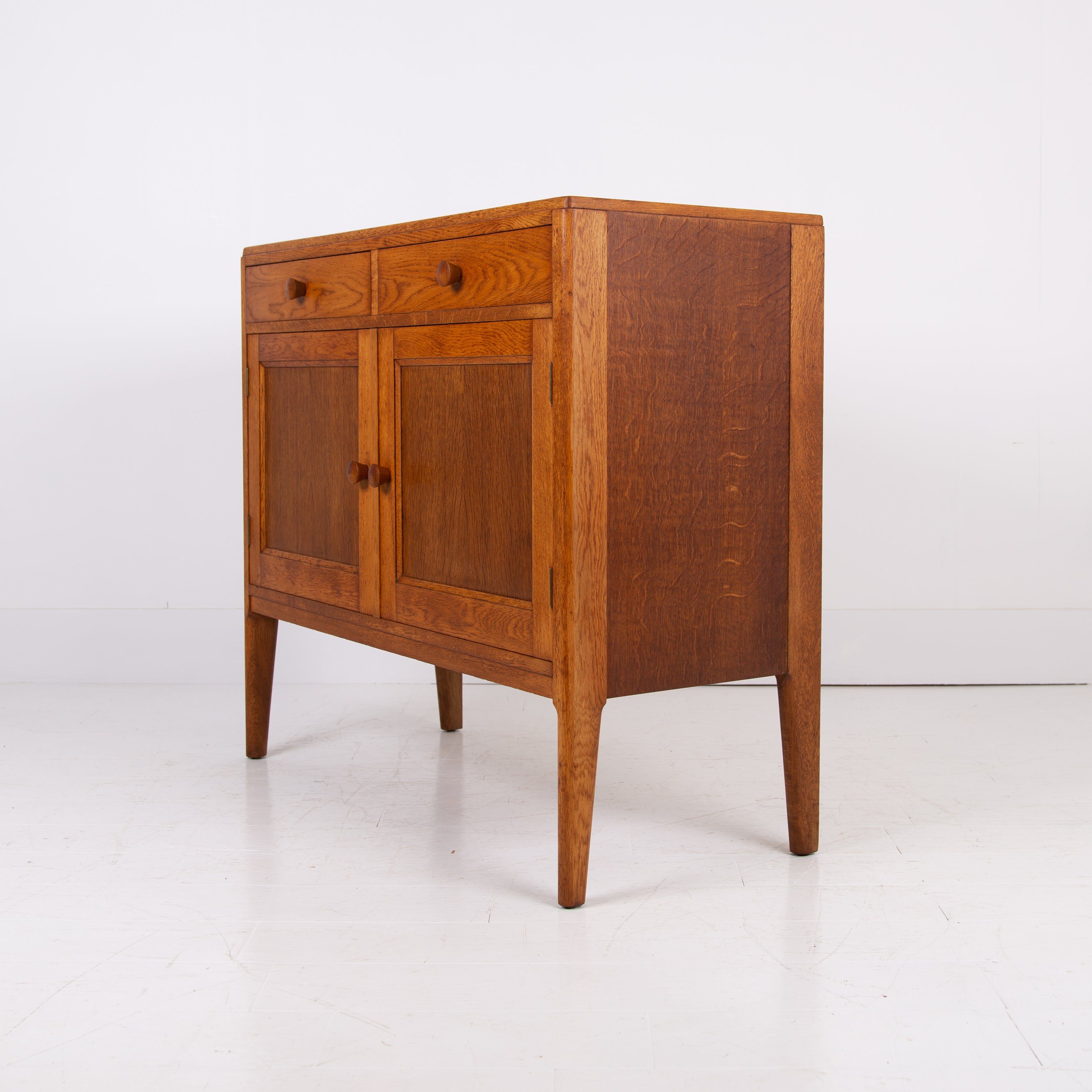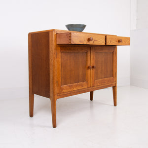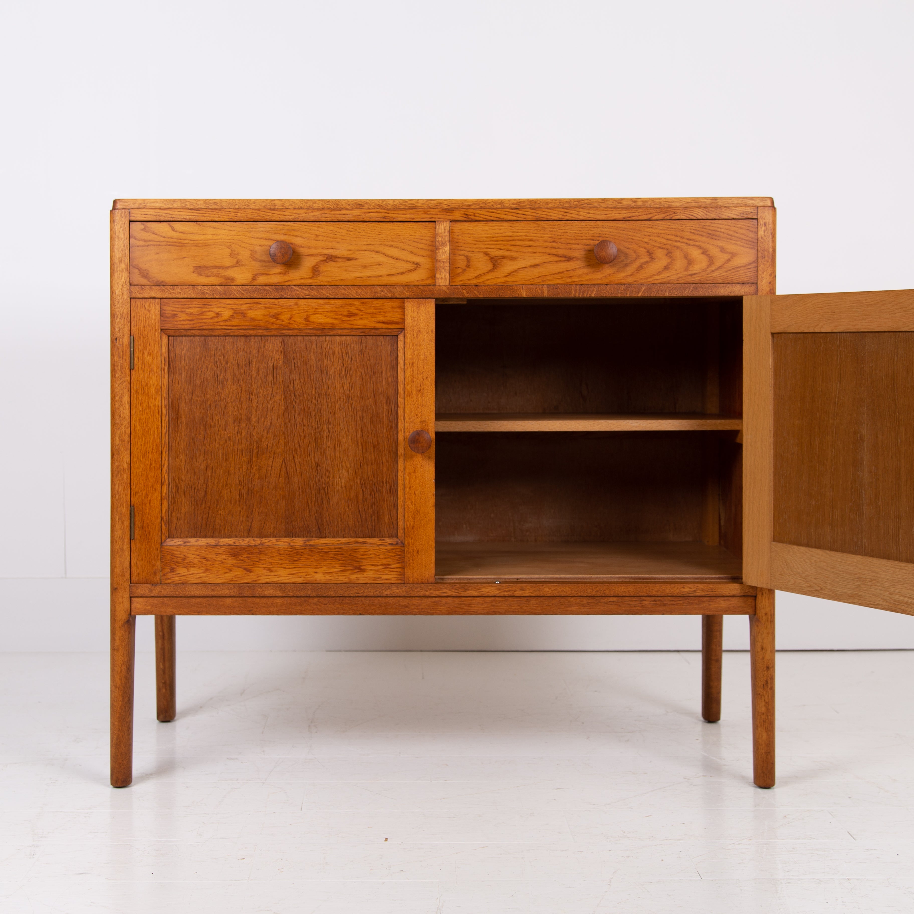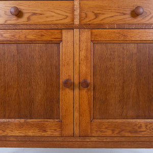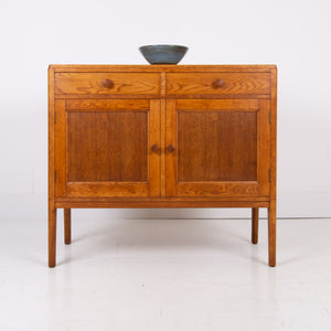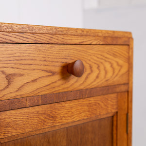 The design very much echoes the Cotswold School in style and this one sits in a pleasing “golden” tone and is in a lovely lightly aged condition with its simple stance, well shaped oak knobs and highly useful and attractive combination of 2 door shelved cupboard with a pair of decent sized drawers on top.