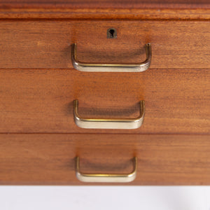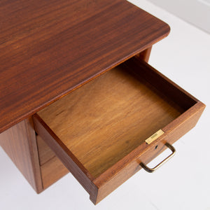 As expected the choice of timber is first rate and build quality first class. A well toned desk with a run of 3 drawers with original well shaped solid brass handles in place. The solid top is well planed to its edges giving it some real mid century style, as do the angled tapered legs. As you would expect the desk looks good from all angles. Light marks to inside the drawers, very much as you would expect.