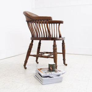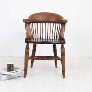 A great looking desk chair in lovely worn condition, English late Victorian and with a charming country feel and look with its turned legs, little castors, shaped seat and curvy spindles and not forgetting the upholstered arms and back rail. Altogether a rather handsome little “chap”.