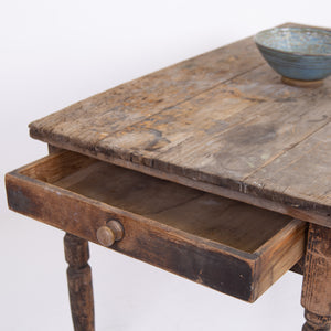 It sits firm and is very usable with its useful deep drawer to one end. The plank top is historically defaced with plenty of history and marks. As mentioned this one sits as is - no wax or polish.