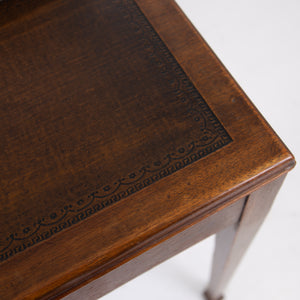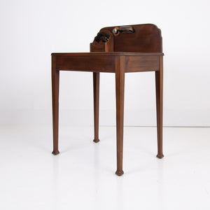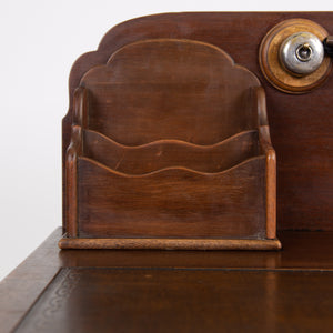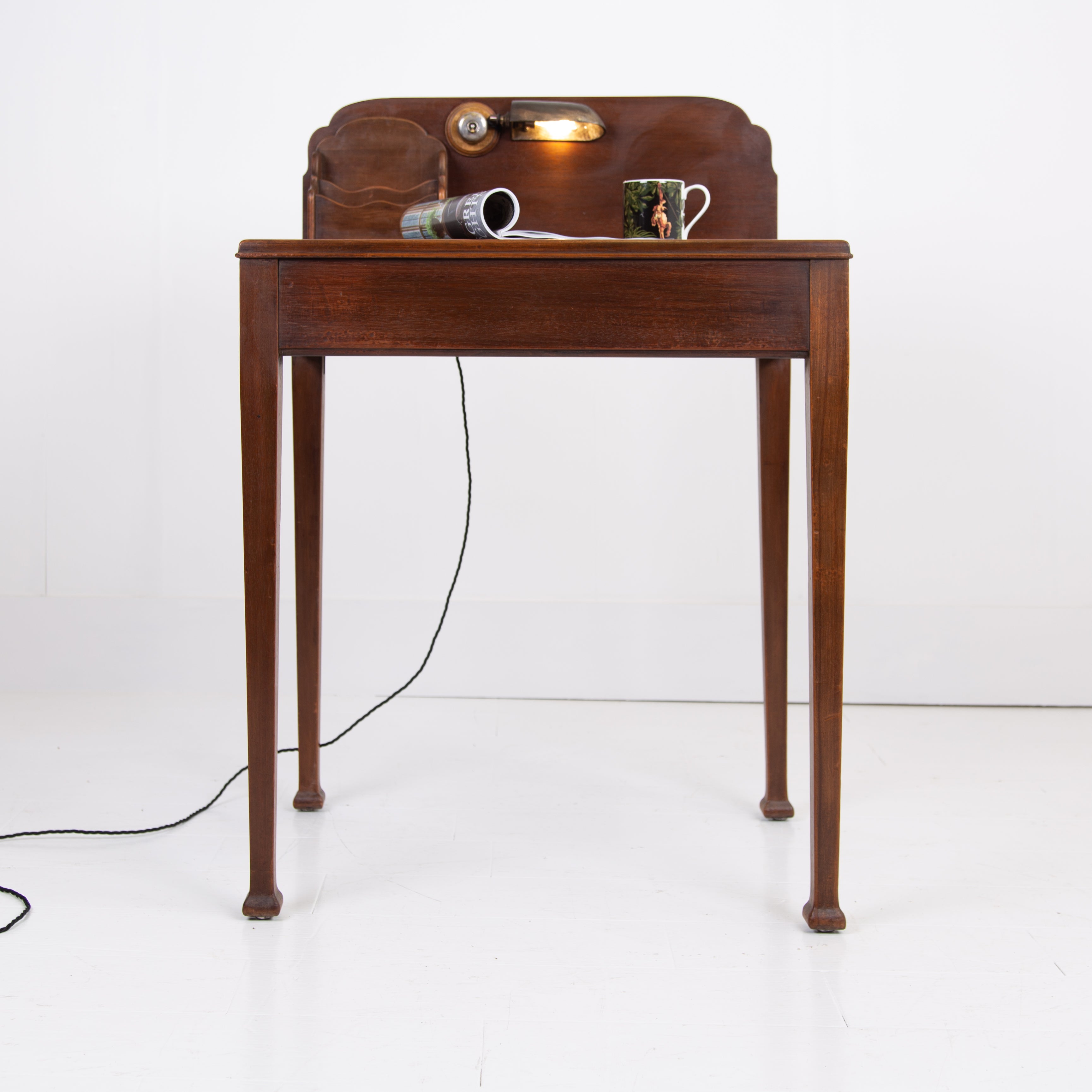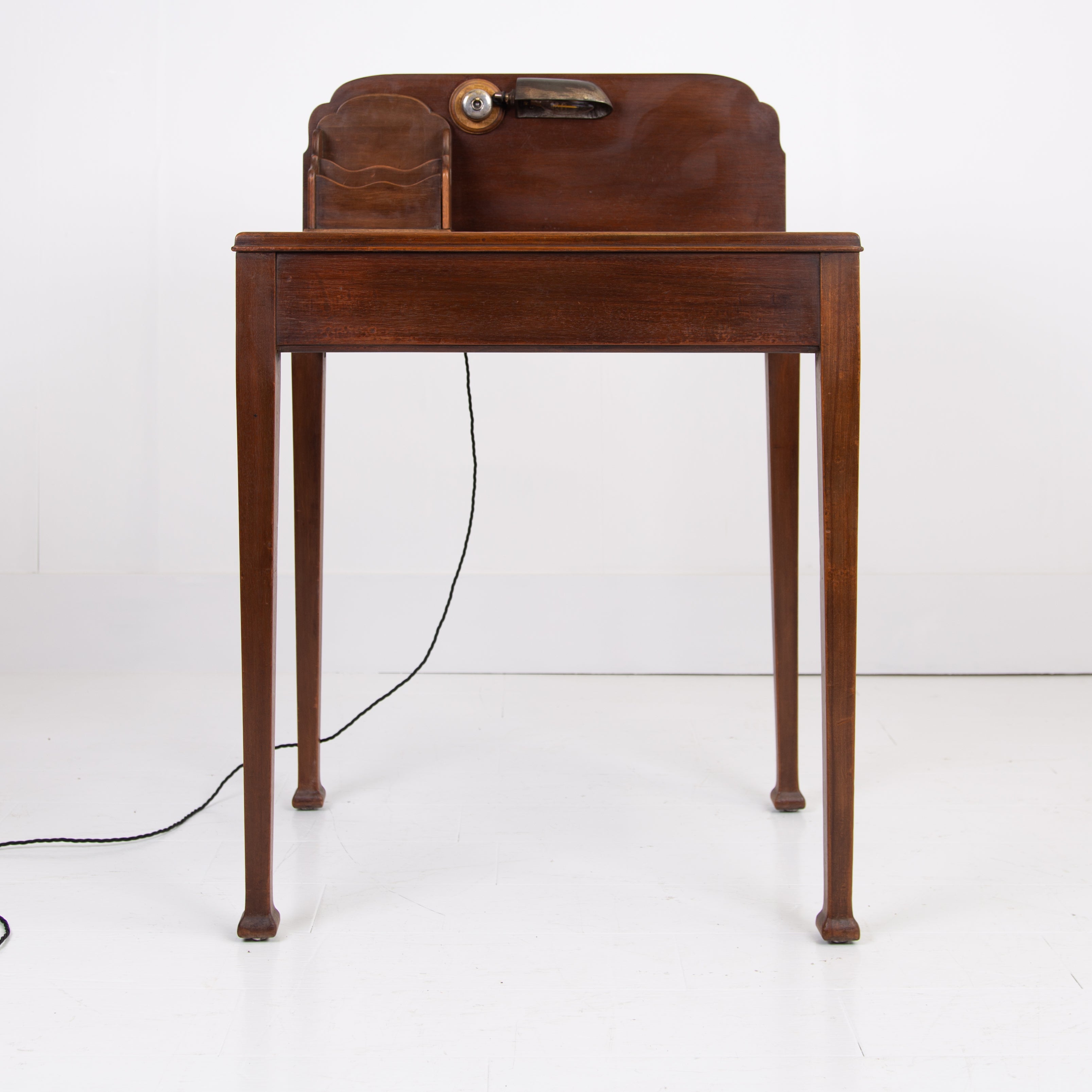 What an utter delight - we have a small workers desk, English C1920 with a little bankers style lamp with Crabtree switch attached to the back alongside a little letter rack. It’s of a smaller scale than most with its original leather inset top, slender well shaped legs and of course the little lamp.