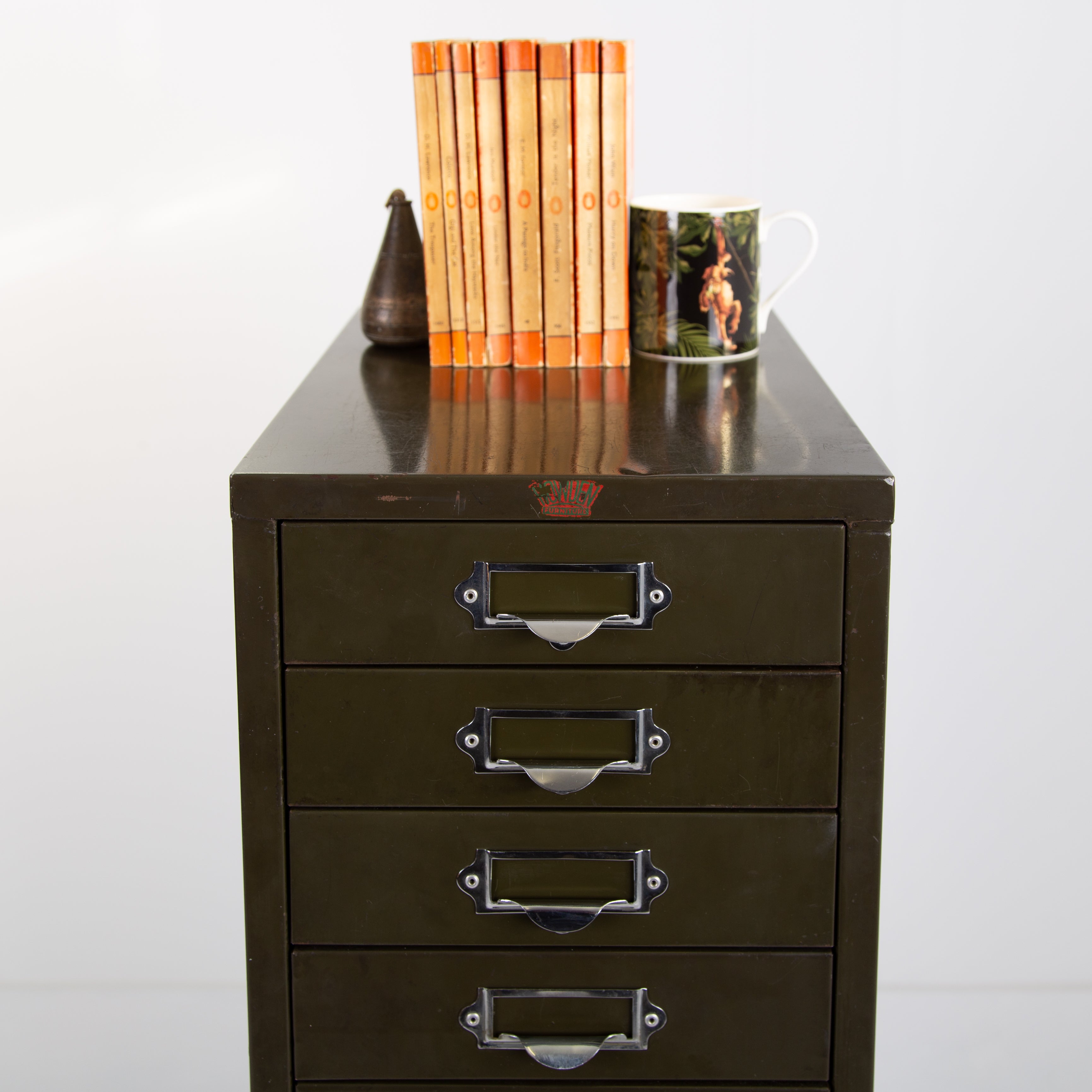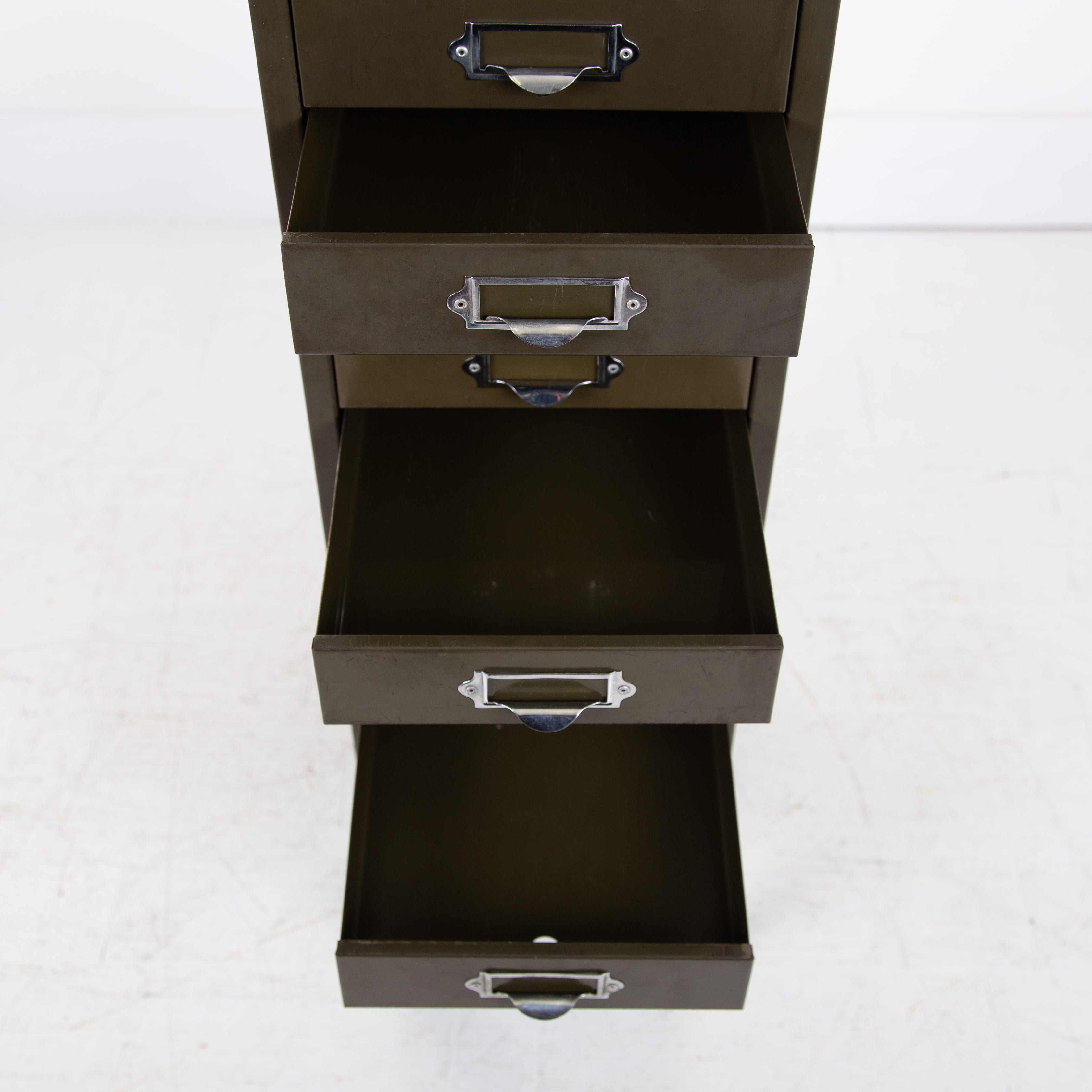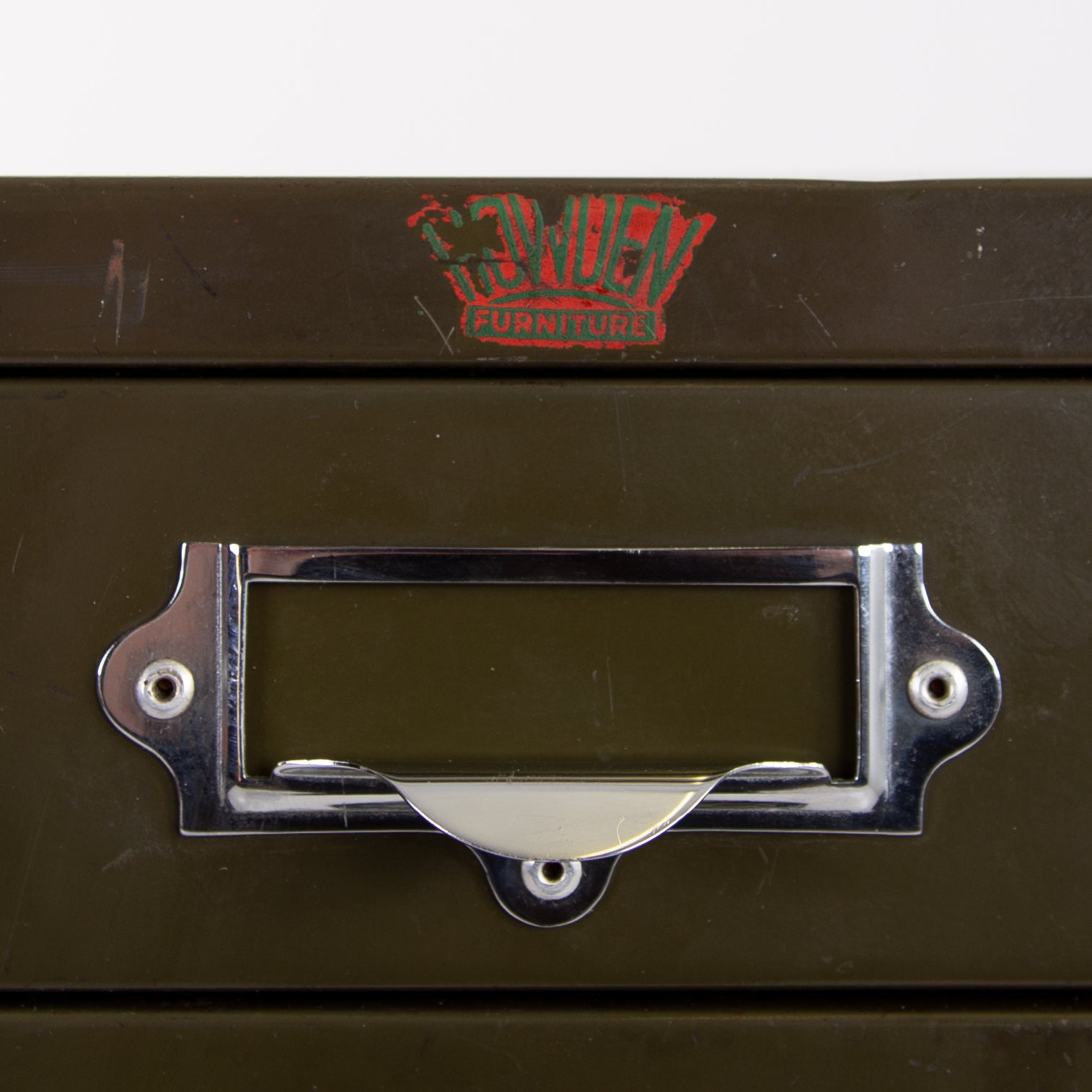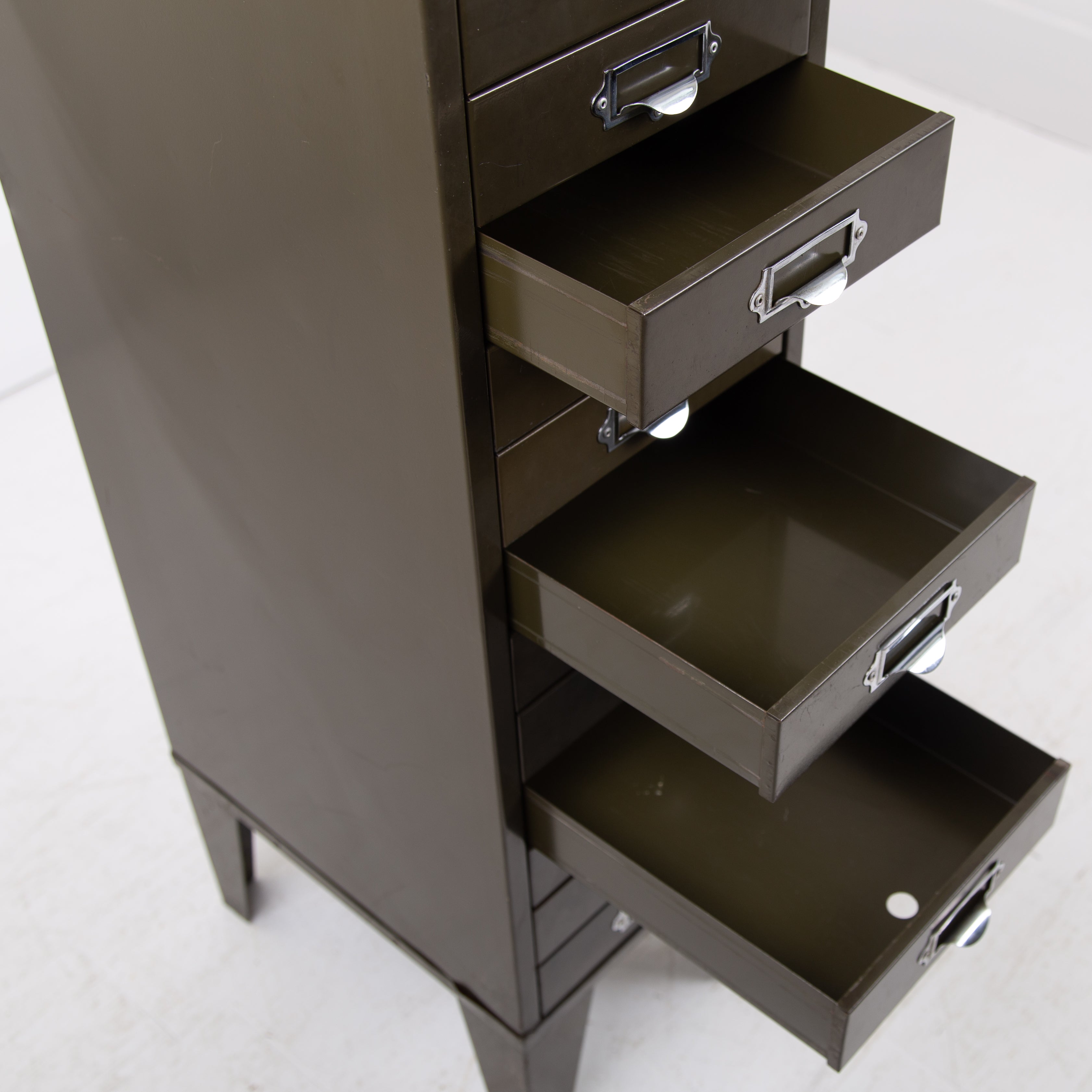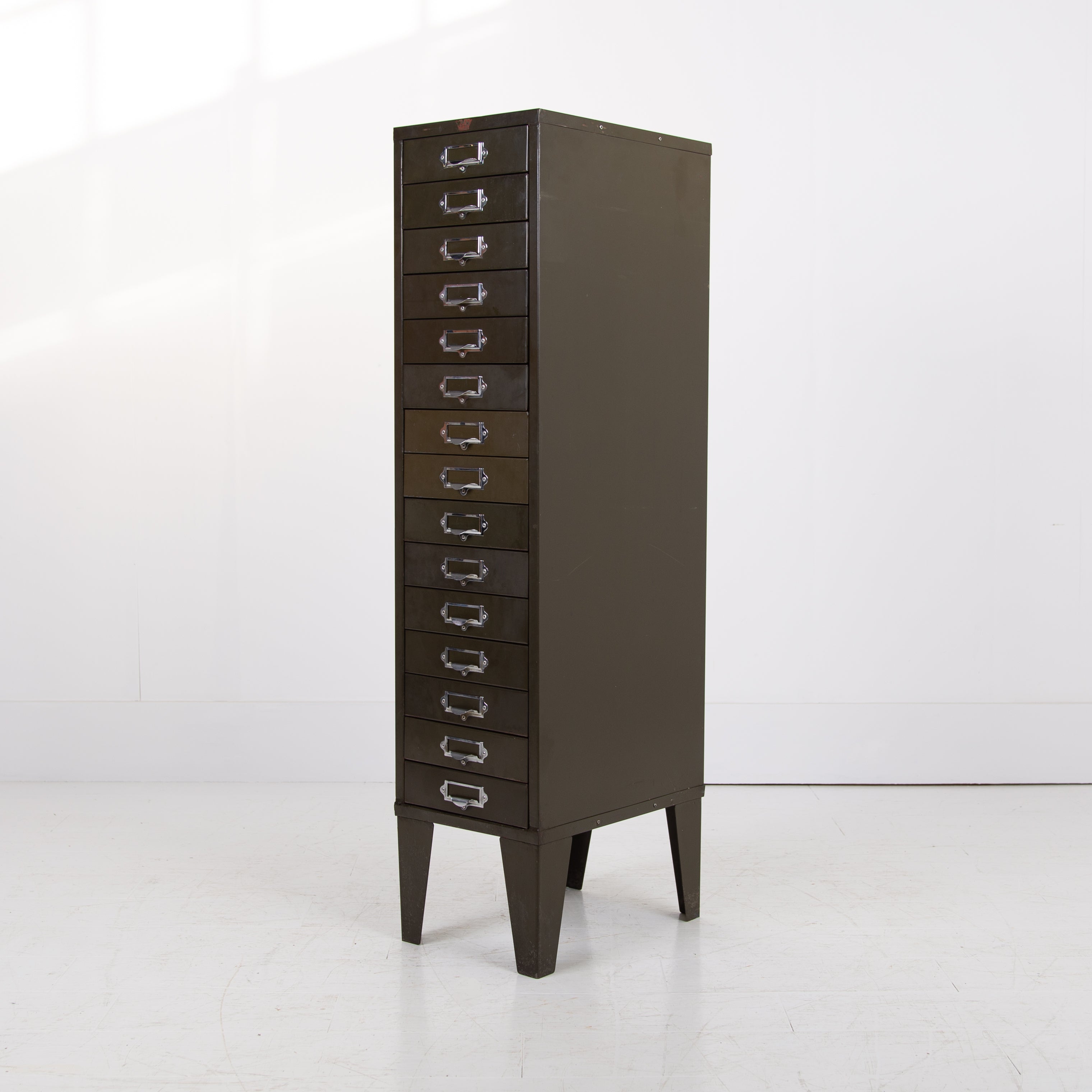 This one sits on those tall angled metal legs with chrome plated label holders which incorporate lipped handles to all drawers and the Howden transfer to the top of the front. A highly original piece in very good order with light patination.