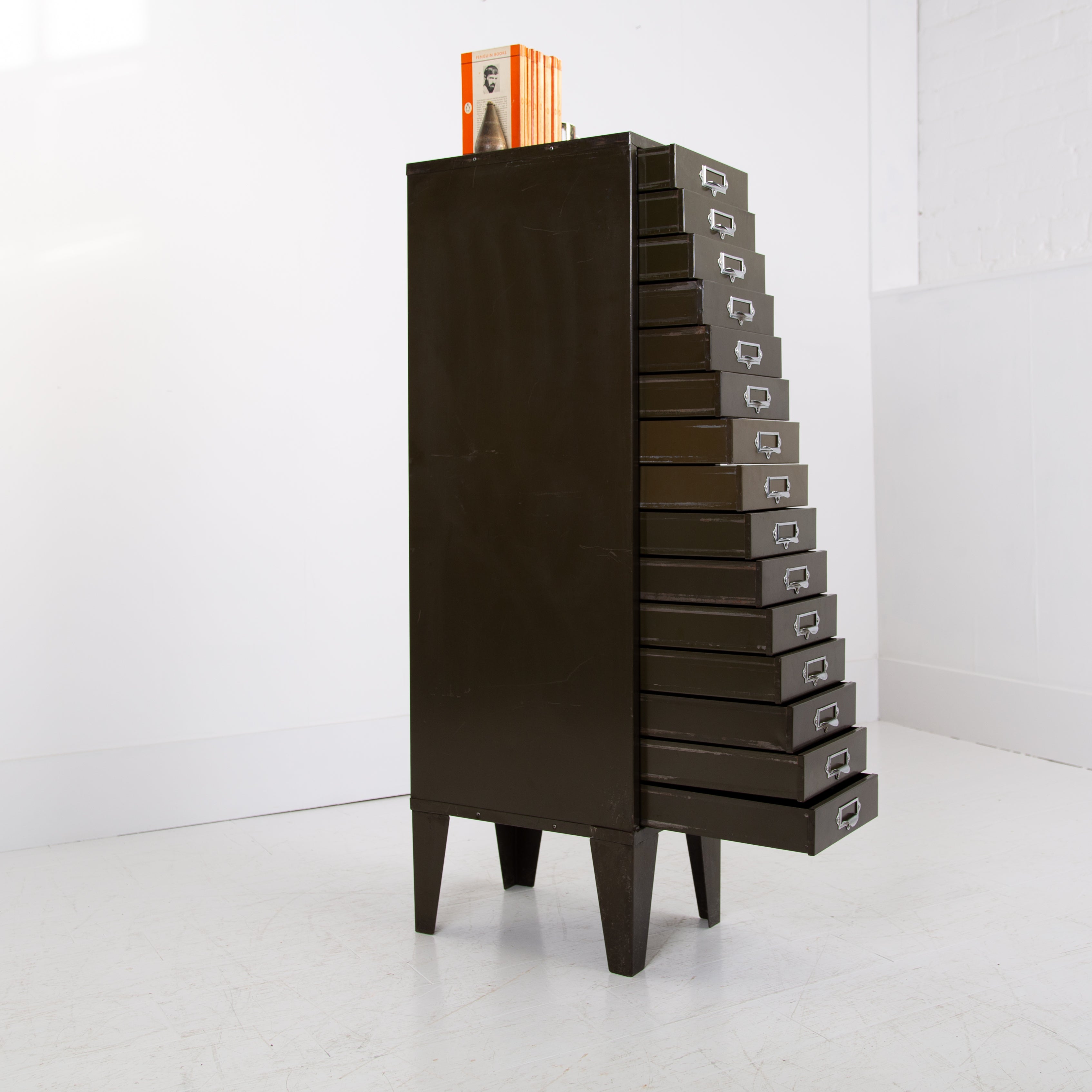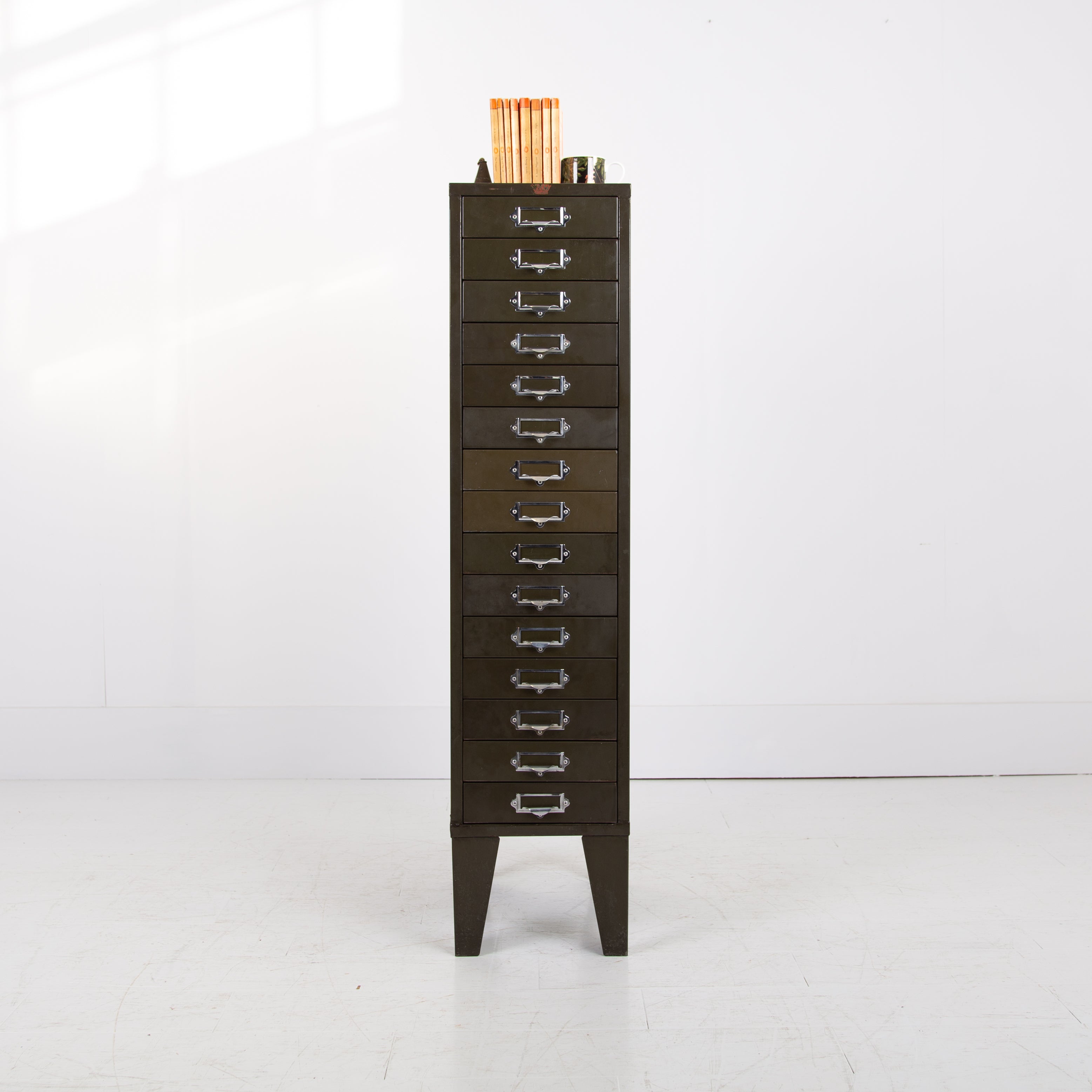 A good looking, slim 15 drawer cabinet by Howden in classic vintage office green in fine order and ready for placing.
